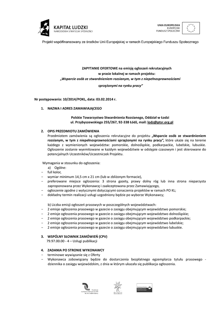 ZAPYTANIE OFERTOWE na emisję ogłoszeń rekrutacyjnych w prasie lokalnej w ramach projektu: „Wsparcie osób ze stwardnieniem rozsianym, w tym z niepełnosprawnościami sprzężonymi na rynku pracy” Nr postępowania: 10/2014/POKL, data: 03.02.2014 r. 1. NAZWA I ADRES ZAMAWIAJĄCEGO Polskie Towarzystwo Stwardnienia Rozsianego, Oddział w Łodzi ul. Przybyszewskiego 255/267, 92-338 Łódź, mail: [email protected] 2. OPIS PRZEDMIOTU ZAMÓWIENIA Przedmiotem zamówienia są ogłoszenia rekrutacyjne do projektu „Wsparcie osób ze stwardnieniem rozsianym, w tym z niepełnosprawnościami sprzężonymi na rynku pracy”, które ukaże się na terenie każdego z wymienionych województw: pomorskie, dolnośląskie, podkarpackie, lubelskie, lubuskie. Ogłoszenie zostanie wyemitowane w każdym województwie w odstępie czasowym i jest skierowane do potencjalnych Uczestników/Uczestniczek Projektu. Wymagania w stosunku do ogłoszenia: a) Ogólne: full kolor, wymiar minimum 14,5 cm x 21 cm (lub w zbliżonym formacie), preferowane miejsce ogłoszenia: 3 strona gazety, prawy dolny róg lub inna strona nieparzysta zaproponowana przez Wykonawcę i zaakceptowana przez Zamawiającego, ogłoszenie zgodne z wytycznymi dotyczącymi oznaczenia projektów w ramach PO KL; dokładny termin realizacji usługi uzgodniony będzie po wyborze Wykonawcy; b) Liczba emisji ogłoszeń prasowych w poszczególnych województwach: 2 emisje ogłoszenia prasowego w gazecie o zasięgu obejmującym województwo pomorskie; 2 emisje ogłoszenia prasowego w gazecie o zasięgu obejmującym województwo dolnośląskie; 2 emisje ogłoszenia prasowego w gazecie o zasięgu obejmującym województwo podkarpackie; 2 emisje ogłoszenia prasowego w gazecie o zasięgu obejmującym województwo lubelskie; 2 emisje ogłoszenia prasowego w gazecie o zasięgu obejmującym województwo lubuskie. 3. WSPÓLNY SŁOWNIK ZAMÓWIEŃ (CPV) 79.97.00.00 - 4 – Usługi publikacji 4. ZADANIA PO STRONIE WYKONAWCY terminowe wywiązanie się z Oferty Wykonawca zobowiązany będzie do dostarczenia bezpłatnego egzemplarza tytułu prasowego dziennika o zasięgu wojewódzkim, z dnia w którym ukazała się publikacja ogłoszenia. 5. ZADANIA PO STRONIE ZAMAWIAJĄCEGO Zamawiający zobowiązuje się dostarczyć gotowe ogłoszenie rekrutacyjne w wersji elektronicznej w terminie do 7 dni przed datą emisji. 6. TERMIN I MIEJSCE WYKONANIA ZAMÓWIENIA Ogłoszenie będą wydrukowane w dniach roboczych do końca marca 2014r. - dokładny termin do ustalenia 7. WARUNKI UDZIAŁU W POSTĘPOWANIU posiadają uprawnienia do wykonania określonej działalności lub czynności, jeżeli ustawy nakładają obowiązek posiadania takich uprawnień posiadają niezbędną wiedzę i doświadczenie oraz dysponują potencjałem technicznym i osobami zdolnymi do wykonania zamówienia znajdują się w sytuacji ekonomicznej i finansowej zapewniającej wykonanie zamówienia 8. DOKUMENTY WYMAGANE W CELU POTWIERDZENIA SPEŁNIENIA WARUNKÓW aktualny odpis z właściwego rejestru lub aktualne zaświadczenie o wpisie do ewidencji działalności gospodarczej 9. WALUTA, W JAKIEJ BĘDĄ PROWADZONE ROZLICZENIA ZWIĄZANE Z REALIZACJĄ NINIEJSZEGO ZAMÓWIENIA wszelkie rozliczenia związane z realizacją zamówienia będą dokonywane w PLN 10. OPIS SPOSOBU PRZYGOTOWANIA OFERTY Wymagania Podstawowe: wykonawca może złożyć tylko jedną ofertę oferta zawiera cenę za wymiar ogłoszenia podany w pkt. 2a wzory dokumentów dołączonych do niniejszego zapytania powinny zostać wypełnione przez wykonawcę i dołączone do oferty wykonawca ponosi wszelkie koszty związane z przygotowaniem i złożeniem oferty wykonawca jest wydawcą gazety lokalnej w danym województwie (w ofercie prosimy podać nazwę województwa, którego dotyczy ogłoszenie) składając zamówienie jednocześnie wyraża zgodę na termin płatności wynoszący 14 dni, od dnia ukazania się ogłoszenia rekrutacyjnego oraz przekazania poprawnie wypełnionej faktury wraz z egzemplarzem gazety. Forma oferty: oferta musi być złożona pisemnie i w języku polskim dokumenty wchodzące w skład oferty mogą być przedstawione w formie oryginałów lub kserokopii potwierdzonych za zgodność z oryginałem 11. OSOBY UPRAWNIONE DO POROZUMIEWANIA SIĘ Z POTENCJALNYMI WYKONAWCAMI Monika Koza – koordynator projektu tel. 503 015 358 12. MIEJSCE, TERMIN I SPOSÓB ZŁOŻENIA OFERTY Ofertę cenową prosimy złożyć osobiście lub przesłać pocztą wg załączonego wzoru na adres Polskie Towarzystwo Stwardnienia Rozsianego, Oddział w Łodzi ul. Przybyszewskiego 255/267, 92-338 Łódź w nieprzekraczalnym terminie do 17.02.2014r. do godz. 12.00. Zamawiający dopuszcza możliwość składania ofert częściowych na poszczególne części przedmiotu zamówienia wskazane w pkt. 2b zapytania ofertowego. Wszystkie ceny muszą być określone jednoznacznie. Oferty niekompletne nie będą rozpatrywane. 13. KRYTERIA OCENY OFERT I WYBORU WYKONAWCY Cena wynegocjowana nie ulega zmianie. Cena stanowi 100% kryterium wyboru. O ewentualnym wyborze oferty Zamawiający powiadomi Wykonawców, którzy ubiegali się o udzielenie zamówienia. Zamawiający dopuszcza możliwość wybrania kilku oferentów lub nie wybrania żadnej oferty. Spośród nadesłanych ofert zostanie wybrany jeden Oferent z każdego województwa, który poda najniższą cenę druku w danym województwie. 14. SPOSÓB OBLICZANIA OFERTY Zasady oceny kryterium „Cena”: Ilość punktów wynikająca z poniższego działania zostanie zaokrąglona do dwóch miejsc po przecinku: C min X c = ------------ x 100 pkt. Ci - gdzie: Xc - wartość punktowa ceny C min - najniższa cena spośród wszystkich ważnych i nieodrzuconych ofert z danego województwa Ci - cena w ofercie „i” 15. INFORMACJE O FORMALNOŚCIACH, JAKIE POWINNY BYĆ DOPEŁNIONE PO WYBORZE OFERTY W CELU ZAWARCIA UMOWY Niezwłocznie po wyborze najkorzystniejszej oferty Zamawiający zawiadamia Wykonawców, którzy złożyli oferty, o: wyb