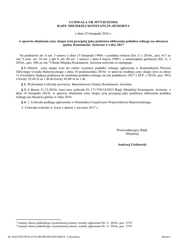 UCHWAŁA NR 397/VII/25/2016 RADY MIEJSKIEJ KONSTANCIN-JEZIORNA z dnia 23 listopada 2016 r. w sprawie obniżenia ceny skupu żyta przyjętej jako podstawę obliczenia podatku rolnego na obszarze gminy Konstancin- Jeziorna w roku 2017 Na podstawie art. 6 ust. 3 ustawy z dnia 15 listopada 1984r. o podatku rolnym (Dz. U z 2016r., poz. 617 ze zm.1)) oraz art. 18 ust. 2 pkt 8, art. 40 ust. 1 ustawy z dnia 8 marca 1990 r. o samorządzie gminnym (Dz. U. z 2016r., poz. 446 ze zm.2)) Rada Miejska Konstancin- Jeziorna uchwala co następuje: § 1. Obniża cenę skupu żyta do celów wymiaru podatku rolnego ogłoszoną w Komunikacie Prezesa Głównego Urzędu Statystycznego z dnia 18 października 2016r. w sprawie średniej ceny skupu żyta za okres 11 kwartałów będącej podstawą do ustalenia podatku rolnego na rok podatkowy 2017 ( M.P. z 2016r. poz. 993) z kwoty 52,44 zł za 1 dt do kwoty 45,00 zł za 1 dt. § 2. Wykonanie Uchwały powierza Burmistrzowi Gminy Konstancin- Jeziorna. § 3. Z dniem 31.12.2016r. traci moc uchwała Nr 171/VII/14/2015 Rady Miejskiej Konstancin- Jeziorna z dnia 18 listopada 2015r. w sprawie obniżenia ceny skupu żyta przyjętej jako podstawę obliczenia podatku rolnego na obszarze gminy w roku 2016 § 4. 1. Uchwała podlega ogłoszeniu w Dzienniku Urzędowym Województwa Mazowieckiego. 2. Uchwała wchodzi w życie z dniem 1 stycznia 2017 r. Przewodniczący Rady Miejskiej Andrzej Cieślawski 1) zmiany 2) zmiany tekstu jednolitego wymienionej ustawy zostały ogłoszone Dz. U. 2016r. poz. 1579 tekstu jednolitego wymienionej ustawy zostały ogłoszone Dz. U. 2016r. poz. 1579 Id: 2E427428-9E34-47A3-BC0B-66EA03C0463A. Uchwalony Strona 1 UZASADNIENIE do uchwały nr 397/VII/25/2016 Rady Miejskiej Konstancin–Jeziorna z dnia 23 listopada 2016 w sprawie obniżenia ceny skupu żyta przyjętej jako podstawę obliczenia podatku rolnego na obszarze gminy Konstancin- Jeziorna w roku 2017 Rada Miejska uprawniona jest do obniżenia ceny skupu żyta przyjmowanej jako podstawę obliczania podatku rolnego na obszarze Gminy. Zgodnie z Komunikatem Prezesa Głównego Urzędu Statystycznego z dnia 18 października 2016 roku (M.P. z 2016r. poz. 993) średnia cena skupu żyta za okres 11 kwartałów poprzedzających kwartał poprzedzający rok podatkowy 2017 wynosi 52,44 zł za 1 dt . Zgodnie ze zmianą ustawy o podatku rolnym od 01.01.2003r. podatkiem rolnym opodatkowane są wszystkie grunty, sklasyfikowane w ewidencji gruntów i budynków niezależnie od powierzchni stanowiącej podstawę do opodatkowania. Dla gruntów gospodarstw rolnych podstawą do opodatkowania jest liczba ha przeliczeniowych ustalona na podstawie powierzchni, rodzajów klas użytków rolnych - stanowi równowartość pieniężną 2,5 q żyta za 1 ha przeliczeniowego. Natomiast do pozostałych gruntów podstawą do opodatkowania jest liczba ha wynikająca z danych w ewidencji gruntów i budynków – stanowi równowartość pieniężną 5q żyta za 1 ha. Proponuję obniżenie średniej ceny skupu żyta przyjętej jako podstawę obliczenia podatku rolnego na obszarze gminy w 2017 roku z kwoty 52,44 zł do kwoty 45,00 zł, tj. utrzymanie jej na tym samym poziomie jak w roku 2016 roku, zgodnie z uchwałą Nr 171/VII/14/2015 z dnia 18 listopada 2015r. Rady Miejskiej Konstancin- Jeziorna. Id: 2E427428-9E34-47A3-BC0B-66EA03C0463A. Uchwalony Strona 1