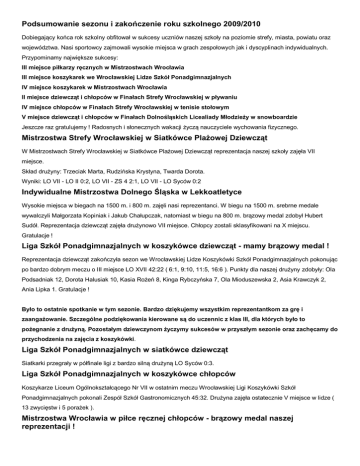 Podsumowanie sezonu i zakończenie roku szkolnego 2009/2010 Dobiegający końca rok szkolny obfitował w sukcesy uczniów naszej szkoły na poziomie strefy, miasta, powiatu oraz województwa. Nasi sportowcy zajmowali wysokie miejsca w grach zespołowych jak i dyscyplinach indywidualnych. Przypominamy największe sukcesy: III miejsce piłkarzy ręcznych w Mistrzostwach Wrocławia III miejsce koszykarek we Wrocławskiej Lidze Szkół Ponadgimnazjalnych IV miejsce koszykarek w Mistrzostwach Wrocławia II miejsce dziewcząt i chłopców w Finałach Strefy Wrocławskiej w pływaniu IV miejsce chłopców w Finałach Strefy Wrocławskiej w tenisie stołowym V miejsce dziewcząt i chłopców w Finałach Dolnośląskich Licealiady Młodzieży w snowboardzie Jeszcze raz gratulujemy ! Radosnych i słonecznych wakacji życzą nauczyciele wychowania fizycznego. Mistrzostwa Strefy Wrocławskiej w Siatkówce Plażowej Dziewcząt W Mistrzostwach Strefy Wrocławskiej w Siatkówce Plażowej Dziewcząt reprezentacja naszej szkoły zajęła VII miejsce. Skład drużyny: Trzeciak Marta, Rudzińska Krystyna, Twarda Dorota. Wyniki: LO VII - LO II 0:2, LO VII - ZS 4 2:1, LO VII - LO Syców 0:2 Indywidualne Mistrzostwa Dolnego Śląska w Lekkoatletyce Wysokie miejsca w biegach na 1500 m. i 800 m. zajęli nasi reprezentanci. W biegu na 1500 m. srebrne medale wywalczyli Małgorzata Kopiniak i Jakub Chałupczak, natomiast w biegu na 800 m. brązowy medal zdobył Hubert Sudół. Reprezentacja dziewcząt zajęła drużynowo VII miejsce. Chłopcy zostali sklasyfikowani na X miejscu. Gratulacje ! Liga Szkół Ponadgimnazjalnych w koszykówce dziewcząt - mamy brązowy medal ! Reprezentacja dziewcząt zakończyła sezon we Wrocławskiej Lidze Koszykówki Szkół Ponadgimnazjalnych pokonując po bardzo dobrym meczu o III miejsce LO XVII 42:22 ( 6:1, 9:10, 11:5, 16:6 ). Punkty dla naszej drużyny zdobyły: Ola Podsadniak 12, Dorota Halusiak 10, Kasia Rożeń 8, Kinga Rybczyńska 7, Ola Mioduszewska 2, Asia Krawczyk 2, Ania Lipka 1. Gratulacje ! Było to ostatnie spotkanie w tym sezonie. Bardzo dziękujemy wszystkim reprezentantkom za grę i zaangażowanie. Szczególne podziękowania kierowane są do uczennic z klas III, dla których było to pożegnanie z drużyną. Pozostałym dziewczynom życzymy sukcesów w przyszłym sezonie oraz zachęcamy do przychodzenia na zajęcia z koszykówki. Liga Szkół Ponadgimnazjalnych w siatkówce dziewcząt Siatkarki przegrały w półfinale ligi z bardzo silną drużyną LO Syców 0:3. Liga Szkół Ponadgimnazjalnych w koszykówce chłopców Koszykarze Liceum Ogólnokształcącego Nr VII w ostatnim meczu Wrocławskiej Ligi Koszykówki Szkół Ponadgimnazjalnych pokonali Zespół Szkół Gastronomicznych 45:32. Drużyna zajęła ostatecznie V miejsce w lidze ( 13 zwycięstw i 5 porażek ). Mistrzostwa Wrocławia w piłce ręcznej chłopców - brązowy medal naszej reprezentacji ! Sukcesem reprezentacji chłopców zakończył się udział w Mistrzostwach Wrocławia. Mimo osłabionego składu nasza drużyna wywalczyła III miejsce. Po nieznacznej porażce w półfinale z ZS Budowlanych 20:21, chłopcy nie załamali się i podjęli walkę z ZS Nr 4 wygrywając 16:14. Serdeczne gratulacje ! Finały Strefy Wrocławskiej w pływaniu dziewcząt i chłopców W zakończonych wczoraj Finałach Strefy Wrocławskiej w pływaniu reprezentacje chłopców i dziewcząt zajęły drużynowo wysokie II miejsca. Serdeczne gratulacje ! Mistrzostwa Wrocławia w piłce nożnej chłopców Piłkarze odpadli z Mistrzostw Wrocławia przegrywając mecze w grupie z LZN 0:3 i ZSE 1:6. Drużyna zajęła miejsca IX - XII. Mistrzostwa Wrocławia w piłce ręcznej chłopców - ćwierćfinały Reprezentacja piłkarzy ręcznych pokonała LO Nr XII 14:9 i przegrała z LO Nr II 9:14 w ćwierćfinałach Mistrzostw Wrocławia. Chłopcy awansowali do najlepszej czwórki MW. Serdeczne gratulacje ! Liga Szkół Ponadgimnazjalnych w siatkówce chłopców Na zakończenie sezonu siatkarze pokonali po zaciętym meczu LO Nr III 3:2 ( 21:25, 18:25, 25:21, 25:21, 16:14 ). Gratulacje ! Mistrzostwa Wrocławia w piłce ręcznej dziewcząt Piłkarki ręczne zakończyły swój udział w Mistrzostwach Wrocławia porażkami z LO IX 3:10 oraz z ZS Nr 4 2:15. Drużyna została sklasyfikowana na miejscu IX - XII. Liga Szkół Ponadgimnazjalnych w koszykówce dziewcząt W drugim meczu półfinałowym nasza drużyna również wysoko przegrała z LO Nr XV 14:79. Dziewczyny będą walczyć 19.04 o brązowy medal z drużyną LO XVII. Bardzo dobrze rozpoczęła Mistrzostwa Wrocławia nasza reprezentacja piłki ręcznej. Chłopcy pokonali bardzo silny zespół ZS Gastronomicznych 15:14 oraz reprezentację LO Nr IX 20:12. Niestety, podczas meczu z ZSG groźnego urazu kolana doznał nasz podstawowy rozgrywający Kuba Kuczyński, który już nie zagra w tym roku szkolnym. Drużynie życzymy awansu do następnego etapu rozgrywek a Kubie szybkiego powrotu do zdrowia ! Liga Szkół Ponadgimnazjalnych w siatkówce dziewcząt Reprezentacja dziewcząt pokonała na wyjeździe ZS Nr 3 3:0. Gratulacje ! Liga Szkół Ponadgimnazjalnych w siatkówce chłopców Siatkarze przegrali po zaciętym meczu z LO Oleśnica 0:3 ( - 23, - 20, - 26 ). Liga Szkół Ponadgimnazjalnych w koszykówce chłopców Koszykarze przegrali wyjazdowy mecz z LO Nr XV 53:68. Liga Szkół Ponadgimnazjalnych w koszykówce dziewcząt W pierwszym meczu półfinałowym nasze dziewczyny wysoko przegrały z LO Nr XV 18:86 Liga Szkół Ponadgimnazjalnych w koszykówce chłopców Reprezentacja koszykarzy pokonała ZS Budowlanych 51:38. Gratulacje ! Liga Szkół Ponadgimnazjalnych w siatkówce chłopców Siatkarze przegrali na własnym boisku mecz z LO Nr V 2:3. Liga Szkół Ponadgimnazjalnych w koszykówce dziewcząt - walczymy o medal ! Zespół koszykarek pokonał w drugim meczu ćwierćfinałowym LO Nr V 41:39 ( 4:12, 11:8, 14:10, 12:9 ). Mecz od samego początku był bardzo zacięty i wyrównany. K