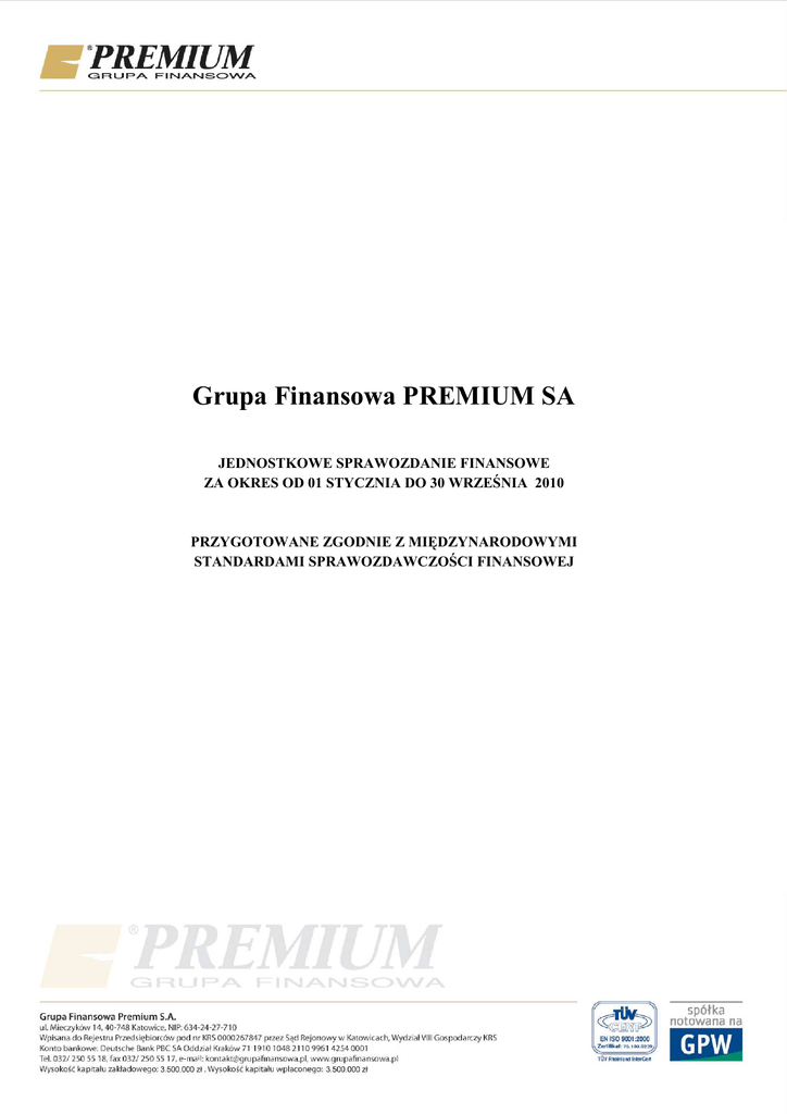 Jednostkowe sprawozdanie finansowe GF Premium SA za IIIQ 2010
