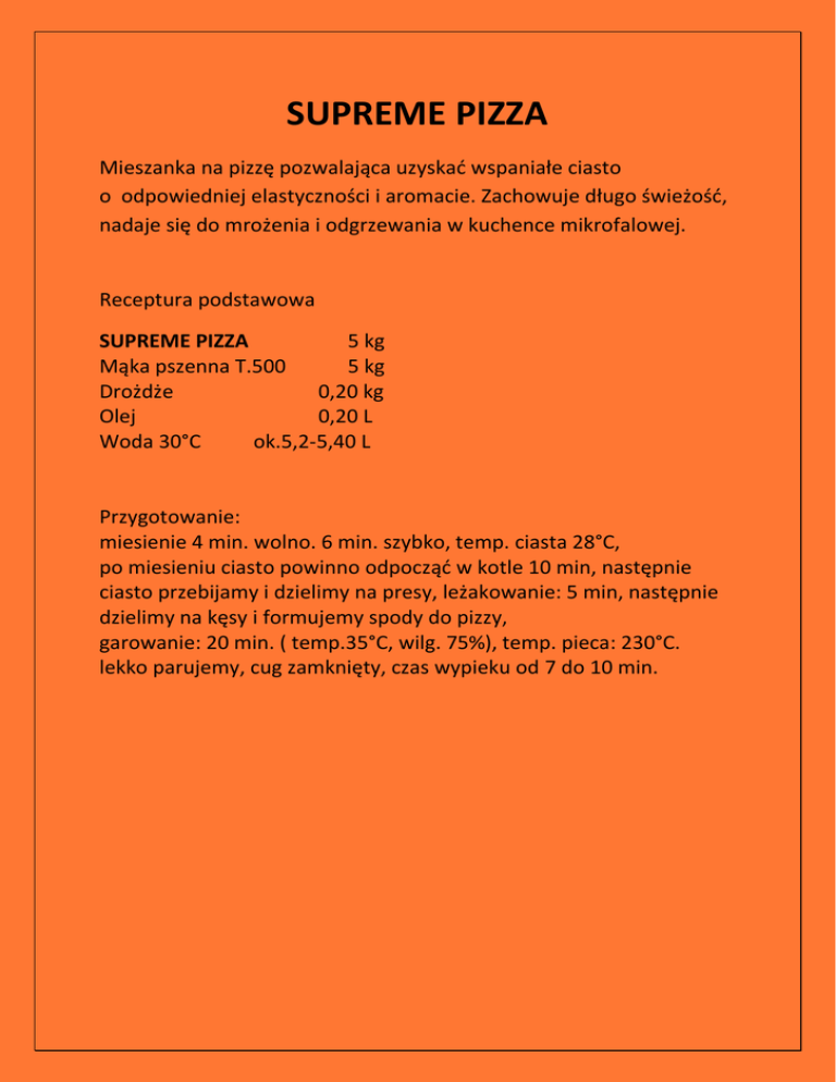 SUPREME PIZZA Mieszanka na pizzę pozwalająca uzyskać wspaniałe ciasto o odpowiedniej elastyczności i aromacie. Zachowuje długo świeżość, nadaje się do mrożenia i odgrzewania w kuchence mikrofalowej. Receptura podstawowa SUPREME PIZZA 5 kg Mąka pszenna T.500 5 kg Drożdże 0,20 kg Olej 0,20 L Woda 30°C ok.5,2-5,40 L Przygotowanie: miesienie 4 min. wolno. 6 min. szybko, temp. ciasta 28°C, po miesieniu ciasto powinno odpocząć w kotle 10 min, następnie ciasto przebijamy i dzielimy na presy, leżakowanie: 5 min, następnie dzielimy na kęsy i formujemy spody do pizzy, garowanie: 20 min. ( temp.35°C, wilg. 75%), temp. pieca: 230°C. lekko parujemy, cug zamknięty, czas wypieku od 7 do 10 min.