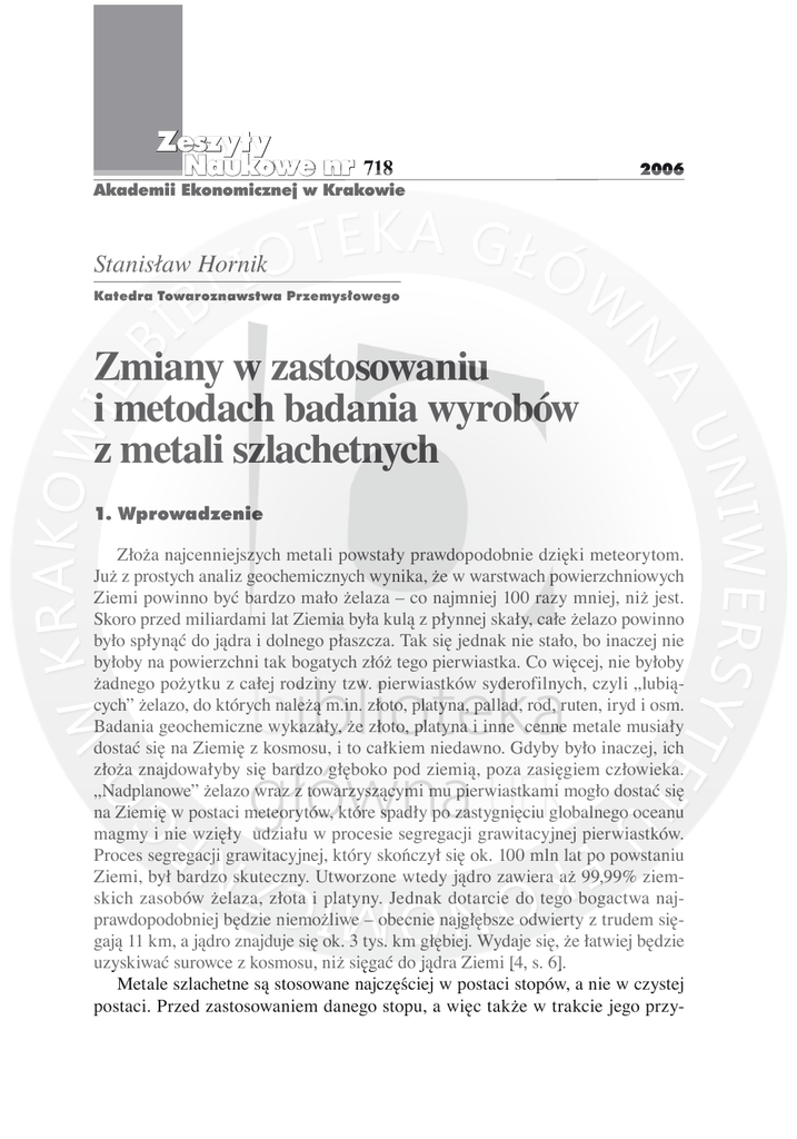 Zeszyty Naukowe nr 718 Akademii Ekonomicznej w Krakowie 2006 Stanisław Hornik Katedra Towaroznawstwa Przemysłowego Zmiany w zastosowaniu i metodach badania wyrobów z metali szlachetnych 1. Wprowadzenie Złoża najcenniejszych metali powstały prawdopodobnie dzięki meteorytom. Już z prostych analiz geochemicznych wynika, że w warstwach powierzchniowych Ziemi powinno być bardzo mało żelaza – co najmniej 100 razy mniej, niż jest. Skoro przed miliardami lat Ziemia była kulą z płynnej skały, całe żelazo powinno było spłynąć do jądra i dolnego płaszcza. Tak się jednak nie stało, bo inaczej nie byłoby na powierzchni tak bogatych złóż tego pierwiastka. Co więcej, nie byłoby żadnego pożytku z całej rodziny tzw. pierwiastków syderofilnych, czyli „lubiących” żelazo, do których należą m.in. złoto, platyna, pallad, rod, ruten, iryd i osm. Badania geochemiczne wykazały, że złoto, platyna i inne cenne metale musiały dostać się na Ziemię z kosmosu, i to całkiem niedawno. Gdyby było inaczej, ich złoża znajdowałyby się bardzo głęboko pod ziemią, poza zasięgiem człowieka. „Nadplanowe” żelazo wraz z towarzyszącymi mu pierwiastkami mogło dostać się na Ziemię w postaci meteorytów, które spadły po zastygnięciu globalnego oceanu magmy i nie wzięły udziału w procesie segregacji grawitacyjnej pierwiastków. Proces segregacji grawitacyjnej, który skończył się ok. 100 mln lat po powstaniu Ziemi, był bardzo skuteczny. Utworzone wtedy jądro zawiera aż 99,99% ziemskich zasobów żelaza, złota i platyny. Jednak dotarcie do tego bogactwa najprawdopodobniej będzie niemożliwe – obecnie najgłębsze odwierty z trudem sięgają 11 km, a jądro znajduje się ok. 3 tys. km głębiej. Wydaje się, że łatwiej będzie uzyskiwać surowce z kosmosu, niż sięgać do jądra Ziemi [4, s. 6]. Metale szlachetne są stosowane najczęściej w postaci stopów, a nie w czystej postaci. Przed zastosowaniem danego stopu, a więc także w trakcie jego przy- 66 Stanisław Hornik gotowania, przeprowadza się szereg badań. Szczególne miejsce zajmują w nich badania zawartości danego metalu szlachetnego w badanym stopie, chociażby ze względu na znaczącą cenę tych metali w porównaniu z innymi, a także z racji istotnych różnic w charakterystyce stopów, powodowanych niejednokrotnie niewielkimi niezgodnościami w składzie jakościowym i ilościowym. Tak więc znaczenie badań zawartości stopów metali szlachetnych jest bardzo duże [3, s. 21]. Największe ilości szlachetnych kruszców są stosowane w jubilerstwie, zatem badania składu stopów w tej gałęzi są spotykane najczęściej. Warto dodać, że polskie ustawodawstwo wprowadziło obligatoryjność badania wyrobów jubilerskich przed dopuszczeniem ich do obrotu [6, s. 4]. 2. Współczesne znaczenie metali szlachetnych Do metali szlachetnych zalicza się: złoto, srebro, platynę, pallad, rod, ruten, osm i iryd. Metalurgia definiuje metale szlachetne jako te metale, które odznaczają się dużą odpornością na działanie czynników chemicznych, a więc kwasów, zasad i soli mineralnych (tabela 1). Im bardziej szlachetny jest dany metal, tym trudniej tworzy on związki chemiczne. Miarą szlachetności metali może być ich potencjał elektrodowy (tabela 2). Trzeba zaznaczyć, że różne źródła często odmiennie definiują stopień szlachetności metali. Miejsce metalu w skali szlachetności bywa zmienne. Różnice te nie są duże, ale należy o nich pamiętać, ponieważ stopień szlachetności metali bywa często określany także na podstawie ich wartości rynkowej i spektrum zastosowań danego metalu [3, s. 14]. Obecnie światowe wydobycie złotego kruszcu utrzymuje się na poziomie ok. 2300 t rocznie. Mimo że pozyskuje się go w prawie 60 krajach, to liczącymi się producentami są: RPA (ok. 550 t rocznie), USA (ok. 330 t rocznie), Australia (ok. 240 t rocznie), Kanada (ok. 170 t rocznie) i Rosja (ok. 150 t rocznie) [7, s. 8]. Ocenia się, że dotychczas wydobyto ok. 120 tys. t tego kruszcu, z czego ok. 60% jest w rękach prywatnych (głównie w postaci wyrobów jubilerskich), a resztę stanowią przede wszystkim rezerwy państwowe. Większość bieżącej produkcji wykorzystuje się do wytwarzania wyrobów jubilerskich (Włochy – 270 t wyrobów rocznie, Indie – 190 t, USA – 100 t; znaczącą produkcję mają także Japonia, Hongkong, Turcja, Niemcy i Francja), 10% złota zużywa przemysł, głównie elektroniczny (ta część złota nie wraca do obiegu), a 5% – dentystyka [4, s. 28 ]. Srebro od najdawniejszych czasów towarzyszy człowiekowi w różnej formie – jako jeden z najbardziej znanych metali. Historia srebra zaczyna się jeszcze w czasach starożytnych. Już 5000 lat temu używano go jako środka płatniczego, wyrabiano wówczas srebrne przedmioty ozdobne i naczynia stołowe. Pierwszymi wyrobami jubilerskimi ze srebra były w Polsce naczynia kościelne, które dla Zmiany w zastosowaniu i metodach badania… 67 krakowskich rzemieślników projektował m.in. Wit Stwosz. Obecnie srebro nie jest wyłącznie metalem zdobniczym, ale również bardzo ważnym elementem: w produkcji skomplikowanej aparatury chemicznej, medycznej, w urządzeniach kosmicznych, w przemyśle fotograficznym, w radiotechnice i w wielu innych dziedzinach nauki i techniki. Tabela 1. Tabela rozpuszczalności złota i platynowców Związek chemiczny Złoto Platyna Pallad Rod Ruten Osm Iryd 1 1 1 1 1 1 1 Kwas siarkowy zimny Kwas siarkowy gorący Kwas solny zimny Kwas solny gorący 1 2 3 1 1 1 1 1 1 1 1 1 1 1 1 1 1 1 1 1 1 Kwas azotowy zimny 1 1 3 1 1 1 1 Kwas azotowy gorący 1 1 1 1 1 1 4 4 4 4 1 1 1 1 Woda królewska zimna Woda królewska gorąca Kwas fluorowodorowy Ług sodowy stopiony Nadtlenek sodu stopiony 4 4 4 1 1 1 1 1 1 1 1 1 1 1 1 2 1 2 2 3 1 3 3 3 1 2 1 4 4 4 2 2 2 Soda stopiona 1 Kwaśny siarczan potasu 1 2 2 2 1 1 1 3 1 1 1 4 2 2 4 1 1 1 1 Azotany alkaliów Cyjanki alkaliów