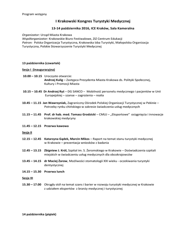 Program wstępny I Krakowski Kongres Turystyki Medycznej 13-14 października 2016, ICE Kraków, Sala Kameralna Organizator: Urząd Miasta Krakowa Współorganizator: Krakowskie Biuro Festiwalowe, ZIZ Centrum Edukacji Patron: Polska Organizacja Turystyczna, Krakowska Izba Turystyki, Małopolska Organizacja Turystyczna, Polskie Stowarzyszenie Turystyki Medycznej 13 października (czwartek) Sesja I (inauguracyjna) 10.00 – 10.15 Uroczyste otwarcie: Andrzej Kulig – Zastępca Prezydenta Miasta Krakowa ds. Polityki Społecznej, Kultury i Promocji Miasta 10.15 – 10.45 Dr Andrzej Ryś – DG SANCO – Mobilnośd personelu medycznego i pacjentów w Unii Europejskiej – szanse – zagrożenia – realia 10.45 – 11.15 Jan Wawrzyniak, Zagraniczny Ośrodek Polskiej Organizacji Turystycznej w Pekinie – Potrzeby rynku chioskiego w zakresie świadczenia usług medycznych 11.15 – 11.45 Prof. dr hab. med. Tomasz Grodzicki – CMUJ – „Eksportowe” osiągnięcia i innowacje krakowskiej medycyny 11.45 – 12.15 Przerwa kawowa Sesja II 12.15 – 12.45 Katarzyna Gądek, Marcin Mikos – Raport na temat stanu turystyki medycznej w Krakowie – prezentacja wniosków z badania 12.45 – 13.15 Zbigniew J. Król, Szpital im. S. Żeromskiego w Krakowie – Doświadczenia szpitali miejskich w świadczeniu usług medycznych dla obcokrajowców 13.45 – 14.15 dr Maciej Żarow, Możliwości stomatologii XXI wieku - oczekiwania turystyki dentystycznej 14.15 – 15.30 Przerwa lunch Sesja III 15.30 – 17.00 Okrągły stół na temat szans i barier w rozwoju turystyki medycznej w Krakowie z udziałem ekspertów z branży medycznej i turystycznej 14 października (piątek) Sesja IV 10.00 – 10.30 Piotr Tatara, Polska Organizacja Turystyczna – Miejsce Polski na europejskim rynku turystyki medycznej 10.30 – 11.00 Robert Otok , ASPHER – Dyrektywa o transgranicznej opiece zdrowotnej – szanse i zagrożenia dla rynku ochrony zdrowia Sesja V 11.00 – 12.00 Prezentacja miast partnerskich Krakowa w zakresie doświadczeo w branży turystyki medycznej – doświadczenia Węgierskie, Czeskie, Słowackie, Niemieckie, Ukraioskie 12.00 – 12.30 Przerwa kawowa Sesja VI 12.30 – 12.50 Tomasz Pęcherz – Funkcjonowanie dyrektywy o transgranicznej opiece zdrowotnej w warunkach polskich 12.50 – 13.10 Prof. Marcin Jóźwik, Szpital św. Rafała: zgoda na leczenie pacjenta obcokrajowca – aspekty praktyczne 13.10 – 13.30 Mec. Jolanta Budzowska – Odpowiedzialnośd za szkody na zdrowiu w stosunku do pacjentów - cudzoziemców 13.30 – 13.50 Vyacheslav Moskalenko –Turystyka medyczna w Polsce - produkty na rynek "wschodni". Analiza. 14.00 – 15.00 Przerwa lunch Sesja VII 15.00 – 15.20 Barbara Kutryba, CMJ – Jakośd obsługi pacjenta jako kryterium wyboru świadczeniodawców 15.20 – 15.40 Michał Bedlicki, CMJ – Oczekiwania pacjentów a możliwości ich spełnienia przez szpitale 15.40 – 16.00 Rafał Staszewski, PUM – Jak skutecznie pozyskiwad pacjentów z zagranicy