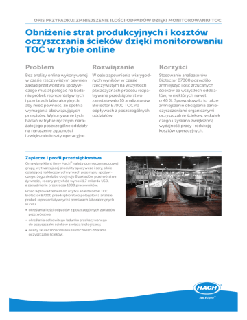 OPIS PRZYPADKU: ZMNIEJSZENIE ILOŚCI ODPADÓW DZIĘKI MONITOROWANIU TOC Obniżenie strat produkcyjnych i kosztów oczyszczania ścieków dzięki monitorowaniu TOC w trybie online Problem Rozwiązanie Korzyści Bez analizy online wykonywanej w czasie rzeczywistym pewnien zakład przetwórstwa spożywczego musiał polegać na badaniu próbek reprezentatywnych i pomiarach laboratoryjnych, aby mieć pewność, że spełnia wymagania obowiązujących przepisów. Wykonywanie tych badań w trybie ręcznym narażało jego poszczególne oddziały na naruszenie zgodności i zwiększało koszty operacyjne. W celu zapewnienia wiarygodnych wyników w czasie rzeczywistym na wszystkich płaszczyznach procesu rozpatrywane przedsiębiorstwo zainstalowało 10 analizatorów Biotector B7000 TOC na odpływach z poszczególnych oddziałów. Stosowanie analizatorów Biotector B7000 pozwoliło zmniejszyć ilość zrzucanych ścieków ze wszystkich oddziałów, w niektórych nawet o 40 %. Spowodowało to także zmniejszenie obciążenia zanieczyszczeniami organicznymi oczyszczalnię ścieków, wskutek czego uzyskano zwiększoną wydajność pracy i redukcję kosztów operacyjnych. Zaplecze i profil przedsiębiorstwa Omawiany klient firmy Hach® należy do międzynarodowej grupy, wytwarzającej produkty spożywcze i sery, silnie działającej na kluczowych rynkach przemysłu spożywczego. Jego siedziba obejmuje 8 zakładów przetwórstwa żywności, roczny przychód wynosi 1,7 miliarda USD, a zatrudnienie przekracza 1800 pracowników. Przed wprowadzeniem do użytku analizatorów TOC Biotector B7000 przedsiębiorstwo polegało na analizie próbek reprezentatywnych i pomiarach laboratoryjnych w celu: • określania ilości odpadów z poszczególnych zakładów przetwórstwa; • określania całkowitego ładunku przekazywanego do oczyszczalni ścieków z wieżą biologiczną; • oceny skuteczności/braku skuteczności działania oczyszczalni ścieków. OPIS PRZYPADKU: ZMNIEJSZENIE ILOŚCI ODPADÓW DZIĘKI MONITOROWANIU TOC Rozwiązanie i usprawnienia Instalacja analizatorów Biotector Odpady z poszczególnych oddziałów są odprowadzane do zakładowej oczyszczalni ścieków. Związki organiczne, azotany i fosforany są usuwane, a pozbawiona zanieczyszczeń woda jest odprowadzana do pobliskiej rzeki. „Dzięki kontrolowaniu ładunku odpadów odprowadzanych do oczyszczalni i działaniu zgodnie ze specyfikacjami końcowy zrzut z łatwością spełnia wymagania obowiązujących przepisów. Analizatory Biotector pomagają nam osiągać wyznaczone cele z zakresu ochrony środowiska i wyniki zgodne z wymogami norm ISO 14001 oraz ISO 15001”, stwierdza kierownik ds. ochrony środowiska i BHP. Ilość odpadów dostarczanych z poszczególnych zakładów przetwórstwa jest monitorowana przez 10 zainstalowanych w latach 1997–2012 i działających w trybie online analizatorów Biotector B7000 firmy Hach, których zadaniem jest usprawnienie wdrożenia programu minimalizacji ilości odpadów. Analizatory mierzą również całkowitą ilość ładunku zanieczyszczeń organicznych dostarczanego do oczyszczalni ścieków i sprawdzają, czy działa ona zgodnie ze specyfikacją i wymaganiami prawnymi odnośnie do czystości wody odprowadzanej do koryta rzeki. Zalety stosowania analizatorów Biotector Stosowanie działających w trybie online analizatorów TOC Biotector przynosi przedsiębiorstwu liczne korzyści. „Odnotowaliśmy znaczny spadek ilości odpadów odprowadzanych z każdego oddziałwoego zakładu przetwórstwa. Krótko po instalacji w niektórych zakładach wyniósł on nawet do 40 %, co skutkowało zwrotem z inwestycji w czasie krótszym niż trzy miesiące”, przyznaje kierownik ds. ochrony środowiska i BHP. „Zauważyliśmy także zmniejszenie ładunku odpadów odprowadzanych do oczyszczalni, co pozwala jej pracować na optymalnym poziomie. W rezultacie udało się także obniżyć koszty operacyjne i całkowicie wyeliminować nieprzyjemny zapach, który stanowił problem przez wiele lat”. Wnioski Dzięki ciągłej pracy analizatorów TOC w trybie online omawianej firmie udało się pokonać trudności operacyjne i typowe problemy, z którymi borykają się także inni producenci w branży spożywczej. „Przemysł przetwórstwa spożywczego nie dysponuje wewnętrznymi zasobami wsparcia technicznego w zakresie procedur konserwacyjnych, jakimi zwykle cieszą się zakłady przemysłu cięższego, tj. rafinerie czy zakłady chemiczne”, podsumowuje kierownik ds. ochrony środowiska i BHP. „Udało nam się obejść ten problem, ponieważ analizatory Biotector mogą pracować bez konieczności przeprowadzania regularnych i częstych kontroli konserwacyjnych. Nasze analizatory Biotector są serwisowane przez lokalnego dystrybutora w oparciu o podpisaną z nim umowę, a reszta wykonywanych przez nas procedur konserwacyjnych jest naprawdę minimalna. Urządzenia te są wyjątkowo niezawodne, więc nie wymagają dużych nakładów pracy”. Podsumowanie Analizatory Biotector B7000 umożliwiły rzeczonemu przedsiębiorstwu: • zapewnienie zgodności z wymogami przepisów dzięki analizie ładunku odpadów i TOC wykonywanej w czasie rzeczywistym; • wykonywanie spójnych i dokładnych pomiarów dzięki niewielkim wymaganiom konserwacyjnym analizatorów Biotector. Analizator TOC Biotector B7000 DOC043.60.30323.Jan16 • zmniejszenie ilości odpadów odprowadzanych do zakładowej oczyszczalni ścieków nawet o 40 % z jednoczesnym obniżeniem jej kosztów operacyjnych;