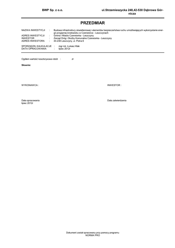 BWP Sp. z o.o. ul.Strzemieszycka 248,42-530 D browa Górnicza PRZEDMIAR NAZWA INWESTYCJI : ADRES INWESTYCJI INWESTOR ADRES INWESTORA : : : SPORZ DZI KALKULACJE DATA OPRACOWANIA Ogó em warto Budowa infrastruktury o wietleniowej i elementów bezpiecze stwa ruchu umo liwiaj cych wykorzystanie energii przyjaznej rodowisku w Czerwionce - Leszczynach Gmina i Miasto Czerwionka - Leszczyny Zarz d Dróg i S by Komunalne Czerwionka - Leszczyny 44-238 Leszczyny, ul. Polna 6 : : kosztorysowa robót mgr in . ukasz K ak lipiec 2012r : z ownie: WYKONAWCA : INWESTOR : Data opracowania lipiec 2012r Data zatwierdzenia Dokument zosta opracowany przy pomocy programu NORMA PRO Budowa infrastruktury oswietleniowej Lp. Podstawa 1 1.1 1 KNR-W 2-01 d.1.1 0113-03 1.2 2 KNR 2-01 d.1.2 0103-06 3 KNR 2-21 d.1.2 0110-09 4 d.1.2 analiza indywidualna 5 KNR 2-01 d.1.2 0110-01 6 KNR 2-01 d.1.2 0110-03 1.3 7 KNR 2-21 d.1.3 0217-02 1.4 8 KNR 2-31 d.1.4 0804-01 0804-02 9 KNR 2-31 d.1.4 0807-03 2 2.1 10 KNR 2-01 d.2.1 0206-02 0214-04 analogia OBMIAR Opis i wyliczenia ROBOTY PRZYGOTOWAWCZE Wyznaczenie trasy i punktów wysoko ciowych Roboty pomiarowe przy liniowych robotach ziemnych - trasa dróg w terenie równinnym 2.5 j.m. km szt. 117 szt. Karczowanie drzew twardych o rednicy pnia 41-65 cm-przy u yciu podno nika monta owego min. 23m 10 szt. Frezowanie pni drzew bez wzgl du na twardo drewna na g boko do 40 cm z zasypaniem do u przy rednicy pnia w miejscu ci cia 31 ÷ 50 cm szt. 117 szt. szt. Wywo enie d yc na odleg do 2 km-miejsce sk adowania - Leszczyny w rejo- m3 nie Zameczku przy ul. Ks. Pojdy 59.28 m3 Wywo enie ga zi na odleg do 2 km-miejsce sk adowania-konary o r. powy ej mp 10 cm baza ZDiSK Leszczyny, ga zie o r. do 10 cm Leszczyny w rejonie zameczku przy ul. Ks. Pojdy 75*(2.0*4.0*1.2)+52*(2.0*2.0*1.2) mp Zdj cie warstwy humusu czne zdj cie warstwy ziemi urodzajnej z transportem taczkami (grunt zadarnio- m3 ny) 126.0*0.30 m3 Rozbiórka elementów dróg i ulic czne rozebranie nawierzchni z t ucznia kamiennego o grubo ci 20 cm m2 2.0 m2 Rozebranie nawierzchni z kostki betonowej 14x12 cm lub lowej 14x14 cm na podsypce cementowo-piaskowej z wype nieniem spoin zapraw cementow 2.0 m2 m2 5 5.1 14 KNR 2-01 d.5.1 0505-01 2.500 117.000 RAZEM 117.000 10.000 RAZEM 10.000 117.000 RAZEM 117.000 59.280 RAZEM 59.280 969.600 RAZEM 969.600 37.800 RAZEM 37.800 2.000 RAZEM 2.000 2.000 RAZEM 2.000 m3 32.780 RAZEM 32.780 32.780 RAZEM 32.780 2.000 RAZEM 2.000 2.000 RAZEM 2.000 PODBUDOWY Podbudowa z kruszywa amanego Podbudowa z kruszywa amanego - warstwa dolna o grubo ci po zag szczeniu 20 m2 cm m2 2.0 4 4.1 13 KNR 2-31 d.4.1 0511-03 2.500 RAZEM m3 2.2 Wykonanie nasypów 11 KNNR-W 10 Formowanie nasypów, grunt z wykopu dostarczany rodkami transportu ko owego m3 d.2.2 2201-02 z odl. do 1 km; obj. wyrobiska do 5,0 m3/m, grunt kat. III; koparka 0,60 m3 32.78 m3 3 3.1 12 KNR 2-31 d.3.1 0114-05 0114-06 Razem km Usuni cie drzew i krzewów cinanie drzew pi mechaniczn ( r. 56-65 cm) ROBOTY ZIEMNE Wykonanie wykopów w gruntach I-V kat. Roboty ziemne wykonywane koparkami podsi biernymi o poj. ki 0.40 m3 w gr.kat.III z transportem urobku samochodami samowy adowczymi na odleg 3 km-wiercenie otworów pod fundament prefabrykowany F 160 lub F 100, lub wylewany na miejscu 32.78 Poszcz NAWIERZCHNIE Nawierzchnia z kostki brukowej betonowej Nawierzchnie z kostki brukowej betonowej grubo cementowo-piaskowej 2.0 8 cm na podsypce m2 m2 NAWIERZCHNIE Umocnienie powierzchni skarp i poboczy czne plantowanie powierzchni gruntu rodzimego kat.I-III m2 126.0 m2 -2- Norma PRO Wersja 4.38 Nr seryjny: 9828 126.000 Budowa infrastruktury oswietleniowej Lp. Podstawa 15 KNNR 1 d.5.1 0507-01 analogia 6 6.1 16 d.6.1 analiza indywidualna 6.2 17 d.6.2 analiza indywidualna 6.3 18 d.6.3 analiza indywidualna 6.4 19 d.6.4 analiza indywidualna OBMIAR Opis i wyliczenia j.m. Humusowanie skarp z obsianiem przy grubo ci warstwy humusu 5 cm. m2 126.0 m2 LAMPY Lampa hybrydowa wraz z monta em Monta lamp wraz z dostaw -lampa, solar min. 2x180W, akumulatory elowe min. szt 200Ah,g owica LED min. 5900 Lm, maszt stalowy+ramy na solary+wysi gnik na owice,fundament prefabrykowany 0,4x0,4m i h min 1,6m lub wylewany na miejscu, programator+regulator mikroprocesorowy,turbina wiatrowa min 600W 88 szt Lampa uliczna Monta lamp wraz z dostaw -lampa,solar min. 2x180W(19szt), akumulatory elo- szt we min. 200Ah(19szt),g owica LED min. 5900 Lm(19szt), maszt stalowy+ramy na solary+wysi gnik na g owice (7szt),maszt stalowy sk adany+rama na solary+wysi gnik na g owice(12szt),czujnik ruchu (1szt),fundament prefabrykowany 0,4x0, 4m i h min 1,6m lub wylewany na miejscu,programator+regulator mikroprocesorowy 19 szt Lampa parkowa Monta lamp wraz z dostaw - lampa,solar min. 90W, akumulatory elowe min. szt 100Ah,g owica LED min. 2x800 Lm, maszt stalowy+ramy na solary+wysi gnik na owice,fundament prefabrykowany lub wylewany na miejscu 0,3x0,3m i h min 1,0 m,programator+regulator mikroprocesorowy 18 szt Monta znaku D-6 zasilanego energi s oneczn Monta i dostawa znaków D-6- lampy,solar min. 90W, akumulator elowy min 100 szt Ah,kaseton pod wietlany D-6 + sygnalizatory LED,maszt stalowy+ramy na solary, fundament prefabrykowany 0,3x0,3m i h min 1,0 m lub wylewany na miejscu, programator+regulator mikroprocesorowy 2 szt -3- Norma PRO Wersja 4.38 Nr seryjny: 9828 Poszcz RAZEM Razem 126.000 126.000 RAZEM 126.000 88.000 RAZEM 88.000 19.000 RAZEM 19.000 18.000 RAZEM 18.000 2.000 RAZEM 2.000