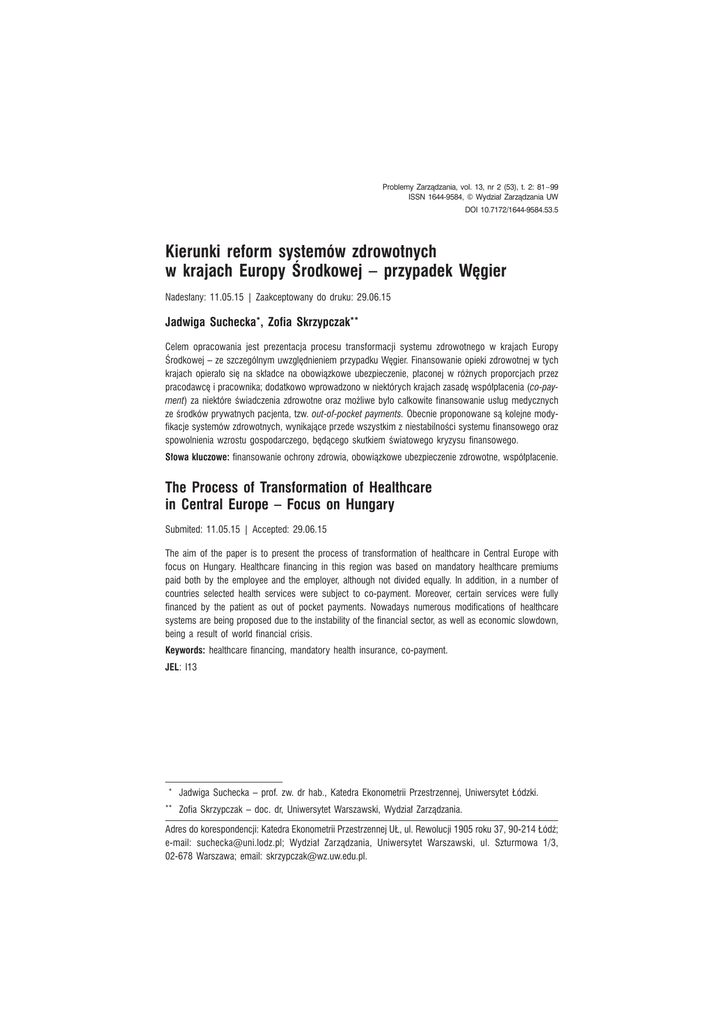 Problemy ZarzÈdzania, vol. 13, nr 2 (53), t. 2: 81 – 99 ISSN 1644-9584, © Wydziaï ZarzÈdzania UW DOI 10.7172/1644-9584.53.5 Kierunki reform systemów zdrowotnych wb krajach Europy ¥rodkowej – przypadek WÚgier Nadesïany: 11.05.15 | Zaakceptowany do druku: 29.06.15 Jadwiga Suchecka*, Zofia Skrzypczak** Celem opracowania jest prezentacja procesu transformacji systemu zdrowotnego wb krajach Europy ¥rodkowej – ze szczególnym uwzglÚdnieniem przypadku WÚgier. Finansowanie opieki zdrowotnej wbtych krajach opieraïo siÚ na skïadce na obowiÈzkowe ubezpieczenie, pïaconej wb róĝnych proporcjach przez pracodawcÚ ibpracownika; dodatkowo wprowadzono wbniektórych krajach zasadÚ wspóïpïacenia (co-payment) za niektóre Ăwiadczenia zdrowotne oraz moĝliwe byïo caïkowite finansowanie usïug medycznych ze Ărodków prywatnych pacjenta, tzw. out-of-pocket payments. Obecnie proponowane sÈ kolejne modyfikacje systemów zdrowotnych, wynikajÈce przede wszystkim zbniestabilnoĂci systemu finansowego oraz spowolnienia wzrostu gospodarczego, bÚdÈcego skutkiem Ăwiatowego kryzysu finansowego. Sïowa kluczowe: finansowanie ochrony zdrowia, obowiÈzkowe ubezpieczenie zdrowotne, wspóïpïacenie. The Process of Transformation of Healthcare in Central Europe – Focus on Hungary Submited: 11.05.15 | Accepted: 29.06.15 The aim of the paper is to present the process of transformation of healthcare in Central Europe with focus on Hungary. Healthcare financing in this region was based on mandatory healthcare premiums paid both by the employee and the employer, although not divided equally. In addition, in ab number of countries selected health services were subject to co-payment. Moreover, certain services were fully financed by the patient as out of pocket payments. Nowadays numerous modifications of healthcare systems are being proposed due to the instability of the financial sector, as well as economic slowdown, being ab result of world financial crisis. Keywords: healthcare financing, mandatory health insurance, co-payment. JEL: I13 * ** Jadwiga Suchecka – prof. zw. dr hab., Katedra Ekonometrii Przestrzennej, Uniwersytet ódzki. Zofia Skrzypczak – doc. dr, Uniwersytet Warszawski, Wydziaï ZarzÈdzania. Adres do korespondencji: Katedra Ekonometrii Przestrzennej U, ul. Rewolucji 1905 roku 37, 90-214bódě; e-mail: [email protected]; Wydziaï ZarzÈdzania, Uniwersytet Warszawski, ul. Szturmowa 1/3, 02-678b Warszawa; email: [email protected]. Jadwiga Suchecka, Zofia Skrzypczak 1. Wprowadzenie Wspóïczesne systemy zdrowotne wbkrajach Europy ¥rodkowej powstaïy wb latach 90. XX wieku wb wyniku transformacji systemowej1, która obejmowaïa transformacjÚ ustrojowÈ ib gospodarczÈ. Naleĝy zwróciÊ uwagÚ, ĝe transformacja gospodarcza stanowi element polityki gospodarczej ibobejmuje dziaïania majÈce na celu stworzenie podmiotom gospodarczym rynkowych warunków funkcjonowania. Warunki te powinny wykraczaÊ poza sferÚ ludzkich postaw ib wynikajÈcych zb nich zachowañ (por. Baïtowski ib Miszewski, 2006, s. 23–24). Zmiany zachodzÈce wewnÈtrz systemu politycznego oraz partyjnego poszczególnych krajów zwiÈzane byïy przede wszystkim ze zmianÈ ustroju pañstwa, ale takĝe zb jakoĂciowÈ zmianÈ rzÈdzenia ib sprawowania wïadzy. IstotÚ transformacji ustrojowej wb pañstwach Europy ¥rodkowej dobrze okreĂla definicja sformuïowana przez Jana Szczepañskiego (1999, s. 73), wedïug której jest to ciÈg zmian dokonujÈcych siÚ wb róĝnych dziedzinach, prowadzÈcych do przemian istotnych dla caïego systemu spoïecznego. Przeksztaïcenia rzeczywistoĂci spoïecznej mogÈ dokonywaÊ siÚ wbwyniku reformy, rewolucji bÈdě transformacji. CechÈ charakterystycznÈ przemian systemu zdrowotnego obserwowanych od lat 90. XX wieku wb krajach Europy ¥rodkowej sÈ dwa procesy: wczeĂniej omówiona transformacja ibreforma postrzegana jako proces ewolucyjny, stopniowo ib dïugotrwale przeksztaïcajÈcy elementy systemu. Przeksztaïcenia wbsystemie powinny mieÊ charakter ewolucyjny, co oznacza, ĝe „w kolejnych latach reforma bÚdzie kontynuowana na wyĝszym jakoĂciowo poziomie organizacji ibusprawniania systemu ochrony zdrowia” (Golinowska ib Wïodarczyk, 2005, s. 3). Na system ochrony zdrowia skïada siÚ wieloĂÊ elementów tworzÈcych system organizacji ib system finansowania Ăwiadczeñ, podporzÈdkowanych nadrzÚdnemu celowi, jakim jest zaspokojenie potrzeb zdrowotnych zarówno spoïeczeñstwa, jak ib poszczególnych jego czïonków, zb jednoczesnym przestrzeganiem zasad efektywnoĂci ekonomicznej oraz racjonalnoĂci ib skutecznoĂci dziaïañ. DÈĝenie do speïnienia tych zaïoĝeñ powoduje, ĝeb wspóïczesne systemy zdrowia podlegajÈ transformacji ob róĝnej intensywnoĂci. EfektywnoĂÊ ekonomiczna transformowanych lub reformowanych systemów ochrony zdrowia zaleĝy przede wszystkim od intensywnoĂci tworzenia wspólnych funduszy oraz metod gromadzenia ibwydatkowania Ărodków finansowych, abtakĝe od sposobu okreĂlania zasad równoĂci wbfinansowaniu transformowanego systemu. Wynika stÈd, ĝe analizujÈc systemy ochrony zdrowia, naleĝy odróĝniaÊ funkcje finansowe ib organizacyjne, jakie zostaïy przypisane wbróĝnych ujÚciach majÈcych charakter modelowy sektora ochrony zdrowia. 82 DOI 10.7172/1644-9584.53.5 Kierunki reform systemów zdrowotnych w krajach Europy ¥rodkowej – przypadek WÚgier PowiÈzanie funkcji finansowania Ăwiadczeñ zdrowotnych zbodpowiednim systemem organizacyjnym moĝe odbywaÊ siÚ drogÈ: – ustalenia zasad gromadzenia dochodów jednostek ochrony zdrowia ibtworzenia wspólnych funduszy, – okreĂlenia roli nabywcy Ăwiadczeñ zdrowotnych, – sformuïowania warunków zabezpieczenia dostÚpnoĂci usïug medycznych2. Gromadzenie dochodów jest procesem uruchamiajÈcym róĝne ěródïa finansowania opieki zdrowotnej. Tworzenie wspólnych funduszy ma na celu rozïoĝenie ryzyka finansowego na caïÈ populacjÚ lub wyróĝnione grupy s