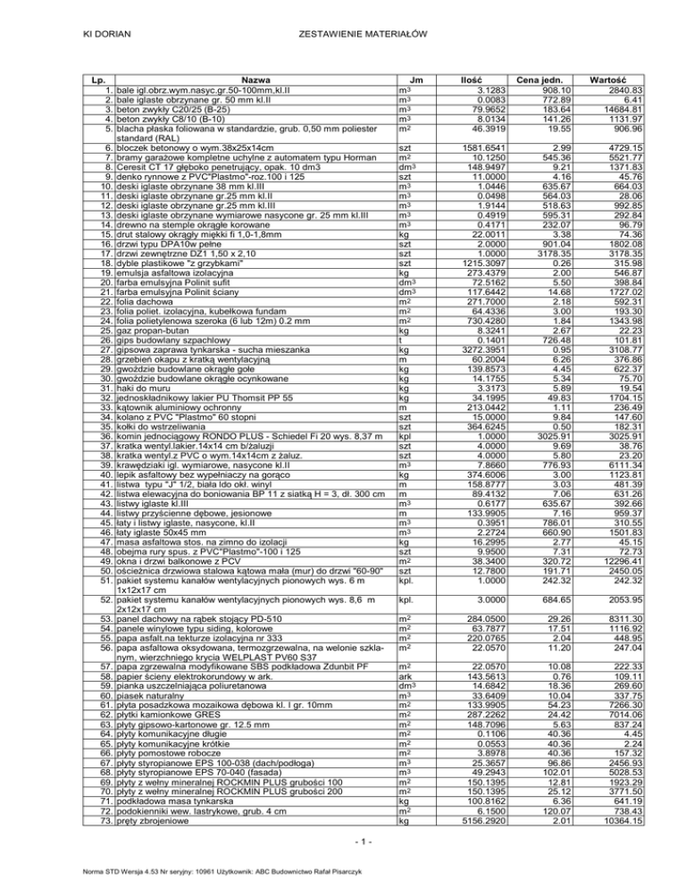 KI DORIAN Lp. 1. 2. 3. 4. 5. 6. 7. 8. 9. 10. 11. 12. 13. 14. 15. 16. 17. 18. 19. 20. 21. 22. 23. 24. 25. 26. 27. 28. 29. 30. 31. 32. 33. 34. 35. 36. 37. 38. 39. 40. 41. 42. 43. 44. 45. 46. 47. 48. 49. 50. 51. 52. 53. 54. 55. 56. 57. 58. 59. 60. 61. 62. 63. 64. 65. 66. 67. 68. 69. 70. 71. 72. 73. ZESTAWIENIE MATERIAŁÓW Nazwa bale igl.obrz.wym.nasyc.gr.50-100mm,kl.II bale iglaste obrzynane gr. 50 mm kl.II beton zwykły C20/25 (B-25) beton zwykły C8/10 (B-10) blacha płaska foliowana w standardzie, grub. 0,50 mm poliester standard (RAL) bloczek betonowy o wym.38x25x14cm bramy garażowe kompletne uchylne z automatem typu Horman Ceresit CT 17 głęboko penetrujący, opak. 10 dm3 denko rynnowe z PVC"Plastmo"-roz.100 i 125 deski iglaste obrzynane 38 mm kl.III deski iglaste obrzynane gr.25 mm kl.II deski iglaste obrzynane gr.25 mm kl.III deski iglaste obrzynane wymiarowe nasycone gr. 25 mm kl.III drewno na stemple okrągłe korowane drut stalowy okrągły miękki fi 1,0-1,8mm drzwi typu DPA10w pełne drzwi zewnętrzne DZ1 1,50 x 2,10 dyble plastikowe "z grzybkami" emulsja asfaltowa izolacyjna farba emulsyjna Polinit sufit farba emulsyjna Polinit ściany folia dachowa folia poliet. izolacyjna, kubełkowa fundam folia polietylenowa szeroka (6 lub 12m) 0.2 mm gaz propan-butan gips budowlany szpachlowy gipsowa zaprawa tynkarska - sucha mieszanka grzebień okapu z kratką wentylacyjną gwoździe budowlane okrągłe gołe gwoździe budowlane okrągłe ocynkowane haki do muru jednoskładnikowy lakier PU Thomsit PP 55 kątownik aluminiowy ochronny kolano z PVC "Plastmo" 60 stopni kołki do wstrzeliwania komin jednociągowy RONDO PLUS - Schiedel Fi 20 wys. 8,37 m kratka wentyl.lakier.14x14 cm b/żaluzji kratka wentyl.z PVC o wym.14x14cm z żaluz. krawędziaki igl. wymiarowe, nasycone kl.II lepik asfaltowy bez wypełniaczy na gorąco listwa typu "J" 1/2, biała ldo okł. winyl listwa elewacyjna do boniowania BP 11 z siatką H = 3, dł. 300 cm listwy iglaste kl.III listwy przyścienne dębowe, jesionowe łaty i listwy iglaste, nasycone, kl.II łaty iglaste 50x45 mm masa asfaltowa stos. na zimno do izolacji obejma rury spus. z PVC"Plastmo"-100 i 125 okna i drzwi balkonowe z PCV ościeżnica drzwiowa stalowa kątowa mała (mur) do drzwi "60-90" pakiet systemu kanałów wentylacyjnych pionowych wys. 6 m 1x12x17 cm pakiet systemu kanałów wentylacyjnych pionowych wys. 8,6 m 2x12x17 cm panel dachowy na rąbek stojący PD-510 panele winylowe typu siding, kolorowe papa asfalt.na tekturze izolacyjna nr 333 papa asfaltowa oksydowana, termozgrzewalna, na welonie szklanym, wierzchniego krycia WELPLAST PV60 S37 papa zgrzewalna modyfikowane SBS podkładowa Zdunbit PF papier ścieny elektrokorundowy w ark. pianka uszczelniająca poliuretanowa piasek naturalny płyta posadzkowa mozaikowa dębowa kl. I gr. 10mm płytki kamionkowe GRES płyty gipsowo-kartonowe gr. 12.5 mm płyty komunikacyjne długie płyty komunikacyjne krótkie płyty pomostowe robocze płyty styropianowe EPS 100-038 (dach/podłoga) płyty styropianowe EPS 70-040 (fasada) płyty z wełny mineralnej ROCKMIN PLUS grubości 100 płyty z wełny mineralnej ROCKMIN PLUS grubości 200 podkładowa masa tynkarska podokienniki wew. lastrykowe, grub. 4 cm pręty zbrojeniowe -1- Norma STD Wersja 4.53 Nr seryjny: 10961 Użytkownik: ABC Budownictwo Rafał Pisarczyk Jm m3 m3 m3 m3 m2 szt m2 dm3 szt m3 m3 m3 m3 m3 kg szt szt szt kg dm3 dm3 m2 m2 m2 kg t kg m kg kg kg kg m szt szt kpl szt szt m3 kg m m m3 m m3 m3 kg szt m2 szt kpl. kpl. m2 m2 m2 m2 m2 ark dm3 m3 m2 m2 m2 m2 m2 m2 m3 m3 m2 m2 kg m2 kg Ilość 3.1283 0.0083 79.9652 8.0134 46.3919 Cena jedn. 908.10 772.89 183.64 141.26 19.55 Wartość 2840.83 6.41 14684.81 1131.97 906.96 3.0000 684.65 2053.95 1581.6541 10.1250 148.9497 11.0000 1.0446 0.0498 1.9144 0.4919 0.4171 22.0011 2.0000 1.0000 1215.3097 273.4379 72.5162 117.6442 271.7000 64.4336 730.4280 8.3241 0.1401 3272.3951 60.2004 139.8573 14.1755 3.3173 34.1995 213.0442 15.0000 364.6245 1.0000 4.0000 4.0000 7.8660 374.6006 158.8777 89.4132 0.6177 133.9905 0.3951 2.2724 16.2995 9.9500 38.3400 12.7800 1.0000 284.0500 63.7877 220.0765 22.0570 22.0570 143.5613 14.6842 33.6409 133.9905 287.2262 148.7096 0.1106 0.0553 3.8978 25.3657 49.2943 150.1395 150.1395 100.8162 6.1500 5156.2920 2.99 545.36 9.21 4.16 635.67 564.03 518.63 595.31 232.07 3.38 901.04 3178.35 0.26 2.00 5.50 14.68 2.18 3.00 1.84 2.67 726.48 0.95 6.26 4.45 5.34 5.89 49.83 1.11 9.84 0.50 3025.91 9.69 5.80 776.93 3.00 3.03 7.06 635.67 7.16 786.01 660.90 2.77 7.31 320.72 191.71 242.32 29.26 17.51 2.04 11.20 10.08 0.76 18.36 10.04 54.23 24.42 5.63 40.36 40.36 40.36 96.86 102.01 12.81 25.12 6.36 120.07 2.01 4729.15 5521.77 1371.83 45.76 664.03 28.06 992.85 292.84 96.79 74.36 1802.08 3178.35 315.98 546.87 398.84 1727.02 592.31 193.30 1343.98 22.23 101.81 3108.77 376.86 622.37 75.70 19.54 1704.15 236.49 147.60 182.31 3025.91 38.76 23.20 6111.34 1123.81 481.39 631.26 392.66 959.37 310.55 1501.83 45.15 72.73 12296.41 2450.05 242.32 8311.30 1116.92 448.95 247.04 222.33 109.11 269.60 337.75 7266.30 7014.06 837.24 4.45 2.24 157.32 2456.93 5028.53 1923.29 3771.50 641.19 738.43 10364.15 KI DORIAN Lp. 74. 75. 76. 77. 78. 79. 80. 81. 82. 83. 84. 85. 86. 87. 88. 89. 90. 91. 92. 93. 94. 95. 96. 97. 98. 99. 100. 101. 102. 103. 104. ZESTAWIENIE MATERIAŁÓW Nazwa pustak POROTHERM 11,5-P+W-11,5x50x23,8 cm pustak POROTHERM 25P+W-25x37,3x23,8cm roztwór asfaltowy do gruntowania rura spustowa PVC kiel.fi90mm"Plastmo"roz.125 rynna dachowa z PVC fi 120 mm"Plastmo"roz.125 rynnowy lej spus.PVC"Plastmo"roz.100 i 125 siatka "Rabitza"10x10mm, fi 0,8-0,9 mm siatka z włókna szklanego skrzydła drzwiowe płytowe wewnętrzne specjalistyczny, syntetyczny klej Thomsit P 600 sucha mieszanka tynkarska mineralna ATLAS CERMIT SN 30 lub DR 30 super podkład Thomsit PP20 środek impreg-grzybobój.solny FOBOS M-4 śruby,podkładki,nakrętki taśma papierowa perforowana szer.50 mm gr.0.2 mm taśmy uszczelniające Thomsit Utwardzacz do PP 60 