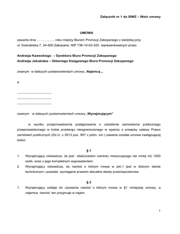 Załącznik nr 1 do SIWZ – Wzór umowy UMOWA zawarta dnia ……………. roku między Biurem Promocji Zakopanego z siedzibą przy ul. Kościeliska 7, 34-500 Zakopane, NIP 736-10-03-325 reprezentowanym przez: Andrzeja Kaweckiego – Dyrektora Biura Promocji Zakopanego Andrzeja Jakubiaka – Głównego Księgowego Biura Promocji Zakopanego zwanym w dalszych postanowieniach umowy „Najemcą „ a …………………………. …………………………. …………………………. zwanym w dalszych postanowieniach umowy „Wynajmującym” w wyniku przeprowadzenia postępowania o udzielenie zamówienia publicznego przeprowadzonego w trybie przetargu nieograniczonego w oparciu o przepisy ustawy Prawo zamówień publicznych (Dz.U. z 2013 poz. 907 z późn. zm.) zawarta została umowa następującej treści: §1 1. Wynajmujący oświadcza, że jest właścicielem namiotu mieszczącego nie mniej niż 1200 osób, wraz z jego kompletnym wyposażeniem. 2. Wynajmujący oświadcza, że namiot o którym mowa w pkt.1 jest w dobrym stanie technicznym i posiada wymagane prawem aktualne atesty przeciwpożarowe. §2 1. Wynajmujący oddaje do używania namiot o którym mowa w §1 niniejszej umowy, a najemca namiot ten przyjmuje w najem. 1 2. Wynajmowany namiot będzie wykorzystywany przez najemcę na potrzeby organizowanych przez niego imprez oraz na potrzeby imprez organizowanych przez osoby trzecie. 3. Wynajmujący oświadcza, że wyraża zgodę na podnajem namiotu przez wynajmującego osobom trzecim, bez powiadamiania go o tym fakcie. §3 Wydanie przedmiotu najmu obejmujące: 1. dostarczenie i montaż namiotu na terenie Dolnej Równi Krupowej w Zakopanem, 2. przekazanie wynajmującemu aktualnych zezwoleń Straży Pożarnej na eksploatację namiotu na cały okres obejmujący jego najem, 3. protokół zawierający szczegółowy opis techniczny przedmiotu najmu - nastąpi w terminie nie później niż 1 lipca 2014 r. § 4. Umowa najmu zostaje zawarta na czas oznaczony począwszy od dnia 1 lipca 2014r. do dnia 31 sierpnia 2014r. § 5. 1. Najemca zobowiązuje się zapłacić wynajmującemu wynagrodzenie ryczałtowe zgodne ze złożoną przez niego ofertą przetargową tj. ……………………PLN netto plus obowiązujący podatek VAT 23% co daje kwotę brutto ………………..PLN (słownie: ………………………………………..PLN). 2. Cena określona w pkt.1 obejmuje koszty transportu, koszty rozłożenia i złożenia namiotu, stałą bieżącą jednoosobową obsługę techniczną 3. Kwota o której mowa w pkt. 1 i w pkt.2 jest kwotą stałą i nie ulegnie zwiększeniu w trakcie trwania niniejszej umowy. 4. Zapłata należności za wynajem i usługi związane z wynajmem odbywać się będzie fakturami częściowymi przelewem z rachunku Najemcy na rachunek Wynajmującego w terminie do 30 dni od daty otrzymania faktury. § 6. 1. Wynajmujący zobowiązuje się jednoosobowy przez cały czas trwania umowy najmu, zapewnić zarząd techniczny nad utrzymywaniem przez najmującego właściwej eksploatacji namiot oraz ochranianiu namiotu w ciągu dnia (z wyłączeniem dni w trakcie, których będą odbywać się imprezy). 2. Wynajmujący jako zarządcę technicznego wyznacza ………………. 3. Wynajmujący zobowiązuje się do niezwłocznego usunięcia na własny koszt wad przedmiotu najmu, jeżeli wady te uniemożliwiają korzystanie z przedmiotu najmu zgodnie z niniejsza umową. 4. Najemca zobowiązuje się, że dochowa wszelkiej staranności w utrzymaniu przedmiotu najmu w stanie nie pogorszonym a wszelkie uszkodzenia namiotu będące winą jego zaniedbania lub winą osób trzecich którym podnajął namiot, pokryje na własny koszt. § 7. 1. Strony umowy przewidują możliwość wcześniejszego rozwiązania niniejszej umowy ale tylko za obopólnym porozumieniem stron. 2. W razie rozwiązania umowy najmu, najemca zobowiązany jest do niezwłocznego wydania przedmiotu najmu w stanie nie pogorszonym. 3. Najemca nie jest odpowiedzialny za zużycie namiotu będące wynikiem prawidłowego użytkowania. § 8. Podstawą ustalenia stanu technicznego przedmiotu najmu po wygaśnięciu lub rozwiązaniu umowy będzie protokół odbiorczy sporządzony i podpisany przez obie strony niezwłocznie po wydaniu przedmiotu najmu. § 9. 1. Wszelkie zmiany niniejszej umowy wymagają dla swojej ważności formy pisemnej . 2. W sprawach nieuregulowanych w niniejszej umowie zastosowanie będą mieć przepisy kodeksu cywilnego i ustawy prawo zamówień publicznych. 3. Wszelkie ewentualne spory rozstrzygane będą polubownie a jeżeli to będzie niemożliwe to przez sąd powszechny właściwy dla siedziby Najemcy. § 10. Umowę sporządzono w dwóch jednobrzmiących egzemplarzach po jednej dla każdej ze stron. NAJEMCA WYNAJMUJĄCY 3