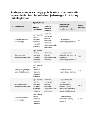 Rodzaje stanowisk mających istotne znaczenie dla zapewnienia bezpieczeństwa jądrowego i ochrony radiologicznej Wykształcenie Lp. Stanowisko wyższe, specjalność fizyk, chemik, elektryk, 1 Operator reaktora badawczego elektronik, mechanik, informatyk i pokrewne fizyk, chemik, elektryk, 2 3 Dozymetrysta reaktora badawczego Starszy dozymetrysta reaktora badawczego elektronik, mechanik, informatyk i pokrewne fizyk, chemik, elektryk, elektronik, mechanik, informatyk i średnie, zawód w zakresie Staż pracy w warunkach narażenia (w latach) Zakres szkolenia 2 w jednostce eksploatującej reaktor R-O nukleonik, energetyk, elektryk, mechanik, elektronik, elektromechanik i pokrewne elektronik, 1 w pracowni lub chemik, elektromechanik, nukleonik zakładzie dozymetrii w jednostce eksploatującej reaktor - 2 na stanowisku dozymetrysty reaktora R-D R-D pokrewne 4 Kierownik zmiany reaktora badawczego fizyk, chemik, elektryk, nukleonik, energetyk, z wykształceniem wyższym - 1, z elektronik, mechanik, elektruk, mechanik, wykształceniem średnim - 3 - na informatyk i pokrewne elektromechanik i pokrewne stanowisku operatora reaktora badawczego - 1 na stanowisku kierownika zmiany R-OK fizyk, chemik, 5 Kierownik reaktora badawczego elektryk, elektronik, mechanik, informatyk i reaktora R-OK Wykształcenie Lp. Stanowisko wyższe, specjalność średnie, zawód w Staż pracy w warunkach narażenia (w latach) Zakres szkolenia zakresie pokrewne Zastępca dyrektora do spraw bezpieczeństwa jądrowego i ochrony 6 7 8 9 radiologicznej w jednostce organizacyjnej posiadającej reaktor badawczy elektronik, mechanik, informatyk i pokrewne Specjalista do spraw ewidencji materiałów jądrowych dowolne Operator przechowalnika wypalonego paliwa jądrowego fizyk, chemik, elektryk, elektronik, mechanik, informatyk i pokrewne fizyk, chemik, elektryk, Kierownik składowiska elektronik, odpadów mechanik, promieniotwórczych informatyk i pokrewne Kierownik zakładu 10 fizyk, chemik, elektryk, unieszkodliwiania odpadów promieniotwórczych fizyk, chemik, elektryk, elektronik, mechanik, informatyk i - 1 na stanowisku kierownika reaktora R-OK + R-D dowolne 1 w jednostce posiadającej materiały jądrowe S-E elektryk, chemik, mechanik, nukleonik 1 w hedbistce eksploatującej przechowalnik wypalonego paliwa jądrowego S-O elektryk, chemik, mechanik, nukleonik z wykształceniem wyższym - 1, z wykształceniem średnim - 3 - w składowisku odpadów promieniotwórczych lub zakładzie unieszkodliwiania odpadów promieniotwórczych S-O - 3 w składowisku odpadów promieniotwórczych lub zakładzie unieszkodliwiania S-O Wykształcenie Lp. Stanowisko wyższe, specjalność średnie, zawód w Staż pracy w warunkach narażenia (w latach) Zakres szkolenia zakresie odpadów promieniotwórczych pokrewne Operator akceleratora 11 stosowanego do celów innych niż fizyk, chemik, informatyk, medyczne z wyłączeniem akceleratorów stosowanych do kontroli pojazdów dowolne techniczne, dowolne przyrodnicze elektryk, elektronik, mechanik, nukleonik i pokrewne z wykształceniem wyższym - 0, z wykształceniem średnim - 1 - w pracowni akceleratorowej A-A 12 Operator akceleratora stosowanego do kontroli pojazdów dowolne dowolne 0 A-A 13 Operator akceleratora stosowanego do celów medycznych oraz urządzeń teleradioterapii fizyk, chemik, biolog, dowolne medyczne, dowolne techniczne elektryk, elektronik, mechanik, medyczne, nukleonik z wykształceniem wyższym - 0, z wykształceniem średnim - 1 - w pracowni akceleratorowej S-A z wykształceniem wyższym - 0, z wykształceniem średnim - 1 - w pracowni radioterapeutycznej ze źródłami promieniotwórczymi S-Z 14 Operator urządzeń do brachyterapii ze źródłami promieniotwórczymi fizyk, chemik, biolog, dowolne medyczne, dowolne techniczne elektryk, elektronik, mechanik, medyczne, nukleonik Typy uprawnień inspektora ochrony radiologicznej oraz rodzaje działalności, do których nadzorowania uprawniają Lp. Typ uprawnień Rodzaje działalności, do których nadzorowania inspektor uzyskuje uprawnienie Przechowywanie, transport, obrót i stosowanie zamkniętych źródeł promieniotwórczych oraz instalowanie, stosowanie i obsługa urządzeń 1. IOR-1Z zawierających źródła promieniotwórcze o aktywności mniejszej niż wartość P2, o której mowa w załączniku nr 2 do ustawy - Prawo atomowe, z wyłączeniem stosowania źródeł promieniotwórczych w celach medycznych 2. IOR-1R Uruchamianie i stosowanie urządzeń wytwarzających promieniowanie jonizujące do celów innych niż medyczne wraz z uruchamianiem pracowni, w których mają być one stosowane, w tym pracowni, w których mają być stosowane aparaty rentgenowskie Działalności, do których nadzorowania uprawnione są osoby posiadające uprawnienia typu IOR-1Z i IOR-1R. Wytwarzanie, przetwarzanie, przechowywanie, składowanie, transport lub stosowanie materiałów jądrowych, źródeł i odpadów 3. IOR-1 promieniotwórczych oraz obrót nimi, z wyłączeniem stosowania źródeł promieniotwórczych w celach medycznych oraz z wyłączeniem przetwarzania, przechowywania, składowania i transportu wypalonego paliwa jądrowego. Produkowanie, instalowanie, stosowanie i obsługa urządzeń zawierających źródła promieniotwórcze oraz obrót tymi urządzeniami z wyłączeniem urządzeń zawierających źródła promieniotwórcze stosowanych w celach medycznych. Budowa, eksploatacja, zamknięcie i likwidacja składowisk odpadów promieniotwórczych z wyjątkiem składowisk odpadów promieniotwórczych przeznaczonych do składowania wypalonego paliwa jądrowego. Zamierzone dodawanie substancji promieniotwórczych w procesie produkcyjnym wyrobów powszechnego użytku i wyrobów medycznych, wyrobów medycznych do diagnostyki in vitro, wyposażenia wyrobów medycznych, wyposażenia wyrobów medycznych do diagnostyki in vitro, aktywnych wyrobów medycznych do implantacji, w rozumieniu przepisów ustawy z dnia 20 maja 2010 r. o wyrobach m