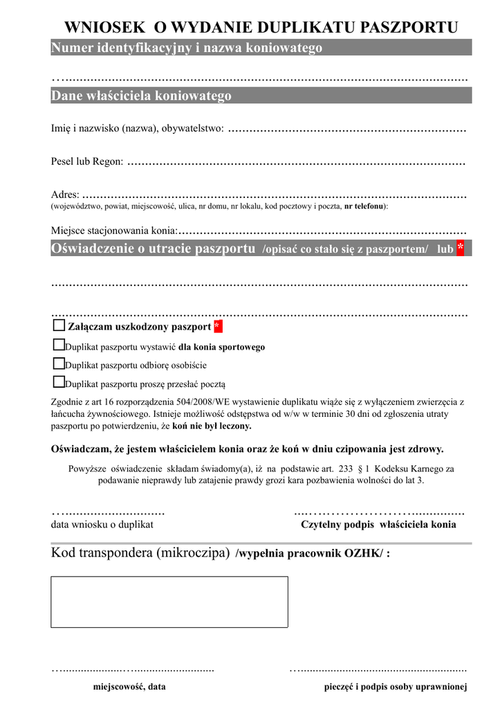 WNIOSEK O WYDANIE DUPLIKATU PASZPORTU Numer identyfikacyjny i nazwa koniowatego …................................................................................................................. Dane właściciela koniowatego Imię i nazwisko (nazwa), obywatelstwo: Pesel lub Regon: ................................................................... ............................................................................................... Adres: ............................................................................................................ (województwo, powiat, miejscowość, ulica, nr domu, nr lokalu, kod pocztowy i poczta, nr telefonu): Miejsce stacjonowania konia:................................................................................. Oświadczenie o utracie paszportu /opisać co stało się z paszportem/ lub * ..................................................................................................................... ..................................................................................................................... Załączam uszkodzony paszport * Duplikat paszportu wystawić dla konia sportowego Duplikat paszportu odbiorę osobiście Duplikat paszportu proszę przesłać pocztą Zgodnie z art 16 rozporządzenia 504/2008/WE wystawienie duplikatu wiąże się z wyłączeniem zwierzęcia z łańcucha żywnościowego. Istnieje możliwość odstępstwa od w/w w terminie 30 dni od zgłoszenia utraty paszportu po potwierdzeniu, że koń nie był leczony. Oświadczam, że jestem właścicielem konia oraz że koń w dniu czipowania jest zdrowy. Powyższe oświadczenie składam świadomy(a), iż na podstawie art. 233 § 1 Kodeksu Karnego za podawanie nieprawdy lub zatajenie prawdy grozi kara pozbawienia wolności do lat 3. …............................ data wniosku o duplikat ....….………………............... Czytelny podpis właściciela konia Kod transpondera (mikroczipa) /wypełnia pracownik OZHK/ : …....................…........................... miejscowość, data …........................................................ pieczęć i podpis osoby uprawnionej