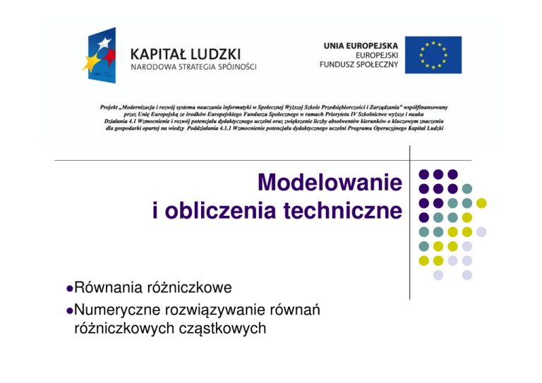 Modelowanie i obliczenia techniczne Równania różniczkowe Numeryczne rozwiązywanie równań różniczkowych cząstkowych Przykłady systemów opisywanych modelem o parametrach rozłożonych Modelowanie systemów technicznych często wymaga ich opisu nie tylko w funkcji czasu, ale też współrzędnych przestrzennych Opis matematyczny uwzględnia wówczas zazwyczaj czas i jeden, dwa lub trzy wymiary przestrzenne Modelowany proces można w takim przypadku opisać równaniami różniczkowymi cząstkowymi Źródło: http://en.wikipedia.org Rozkład pola magnetycznego w okolicy ferromagnetyka Zgniatanie elementów karoserii samochodu 2 Równania różniczkowe cząstkowe Równanie różniczkowe cząstkowe to równanie, w którym występuje funkcja niewiadoma dwóch lub więcej zmiennych oraz jej pochodne cząstkowe. Równanie różniczkowe cząstkowe n-tego rzędu można zapisać: (n ) (n −1) ′ F u (x ), u (x ),...u (x ), u (x ), x = 0 gdzie u jest niewiadomą funkcją wektora zmiennych niezależnych x. 3 Liniowe równania różniczkowe cząstkowe 2 rzędu W modelowaniu technicznym szczególne zastosowanie ma liniowe równanie różniczkowe cząstkowe 2 rzędu, które można zapisać: ∂ 2u ∂ 2u ∂ 2u ∂u ∂u A 2 +B + C 2 = F x, y, u, , ∂x ∂xy ∂y ∂x ∂y gdzie x oraz y są zmiennymi niezależnymi. Mogą to być wymiary przestrzenne, albo jedną z nich może być czas. 4 Klasyfikacja liniowych równań różniczkowych cząstkowych 2. rzędu Równanie eliptyczne: B 2 − 4 AC < 0 Równanie paraboliczne: B 2 − 4 AC = 0 Równanie hiperboliczne: B 2 − 4 AC > 0 5 Przykłady liniowych równań różniczkowych cząstkowych 2. rzędu Równanie eliptyczne Może to być równanie Poissona używane do opisu rozkładu pól prędkości cieczy oraz potencjałów pól siłowych w obecności ich źródeł. Równanie zapisuje się następująco: ∂ 2u ∂ 2u ∇u = 2 + 2 = f ( x , y ) ∂x ∂y Szczególnym przypadkiem dla f=0 jest równanie Laplace’a używane do opisu potencjału pól siłowych z wyłączeniem źródeł: ∂ 2 u ∂ 2u + 2 =0 2 ∂x ∂y 6 Przykłady liniowych równań różniczkowych cząstkowych 2. rzędu Równanie paraboliczne Może to być równanie dyfuzji używane do opisu zależności rozkładu przestrzennego od czasu. Równanie zapisuje się następująco: ∂u ∂ 2u =D 2 ∂t ∂x gdzie D jest nazywane współczynnikiem dyfuzji. Równanie opisuje proces rozprzestrzeniania się materii lub energii w środowisku, np. elektronów w półprzewodniku, ciepła w bryle materiału itd. 7 Przykłady liniowych równań różniczkowych cząstkowych 2. rzędu Równanie hiperboliczne Może to być równanie falowe używane do opisu rozkładu funkcji w czasie i przestrzeni. Równanie zapisuje się następująco: 2 ∂ 2u ∂ u 2 = v ∂t 2 ∂x 2 gdzie v jest prędkością propagacji fali. Równanie ma rozwiązania oscylacyjne i opisuje fale elektromagnetyczne, akustyczne, mechaniczne oraz drgania, np. struny. 8 Warunki brzegowe dla równań różniczkowych cząstkowych Warunki brzegowe definiują warunki na granicy (brzegu) analizowanego obszaru. Dzielimy je na: Warunki Dirichleta – zadana, stała wartość funkcji na brzegu: u (0 ) = U Warunki Neumanna – zadana, stała wartość pochodnej na brzegu w kierunku do niego prostopadłym: ∂u (0) = U ′ ∂n 9 Dyskretyzacja równań różniczkowych cząstkowych Numeryczne rozwiązywanie równań różniczkowych cząstkowych wymaga dyskretyzacji analizowanego obszaru zmiennych niezależnych. Równania różniczkowe są wówczas transformowane do równań różnicowych w węzłach powstałej siatki. Wyróżnia się dyskretyzację równomierną (metoda różnic skończonych) oraz nierównomierną (metoda elementów skończonych) Przykład dyskretyzacji równomiernej Przykład dyskretyzacji nierównomiernej 10 Numeryczne rozwiązywanie równania różniczkowego – metoda różnic skończonych Zamiana zależności różniczkowych na różnicowe w węzłach u ( xi +1 , y ) − u ( xi −1 , y ) ui +1, j − ui −1, j ∂u ( x, y ) ≈ = Pierwsza pochodna: ∂x x = xi , y = y j xi +1 − xi −1 2h Druga pochodna: ui +1, j − 2ui , j + ui −1, j ∂ 2 u ( x, y ) ≈ 2 2 ∂x h x= x , y= y i Laplasjan: ∇ u ( x, y ) 2 x = xi , y = y j j 1 ≈ 2 (ui +1, j + ui , j +1 + ui −1, j + ui , j −1 − 4ui , j ) h h – odległość między węzłami siatki 11 Numeryczne rozwiązywanie równania różniczkowego – warunki brzegowe Poniższe warunki dla ustalenia uwagi są definiowane dla brzegu wzdłuż wymiaru x dla x=x0. Warunek Dirichleta: u ( x0 , y ) = g ( y ) → u0, j = g ( y j ) Warunek Neumanna: y u1, j − u−1, j ∂u ( x, y ) = f (y) → = ∂n 2h = f ( y j ) → u−1, j = u1, j − 2hf ( y j ) u −1, j – sztuczny węzeł poza obszarem x 12 Przykład rozwiązania równania różniczkowego – nieustalony przepływ ciepła W chwili zerowej do następuje skokowy wzrost temperatury na jednym końcu metalowego pręta (l=1m) odizolowanego termicznie od otoczenia. Stosuje się równanie dyfuzji z warunkami berzegowymi: ∂T ( x, t ) ∂ 2T ( x, t ) =D , 2 ∂t ∂x T ( x, t = 0) = 0, T ( x = 0, t ) = T p , ∂T ( x, t ) =0 ∂x x =1,t Dyskretyzacja równania i warunków brzegowych do N węzłów x i M węzłów t daje zależności: Ti , j +1 − Ti , j ∆t T0, j = T p , =D (∆x )2 ∆t ⋅ D (Ti +1, j − 2Ti, j + Ti −1, j ) → Ti , j +1 = Ti , j + 2 (∆x ) Ti , 0 = 0 TN +1, j − TN −1, j 2 ∆x Ti +1, j − 2Ti , j + Ti −1, j = 0 → TN +1, j = TN −1, j → TN , j +1 = TN , j + ∆t ⋅ D (TN −1, j − 2TN , j ) 13 2 (∆x ) Przykład rozwiązania równania różniczkowego – nieustalony przepływ ciepła Powtórzenie rozwiązania dla każdego węzła daje układ równań, który można zapisać za pomocą tzw. macierzy przekątniowej. Każdy z węzłów zapisuje się w kolejnych elementach wektora, co daje bardzo duży rozmiar macierzy. Alternatywą jest iteracyjne rozwiązanie w czasie, zaczynaj