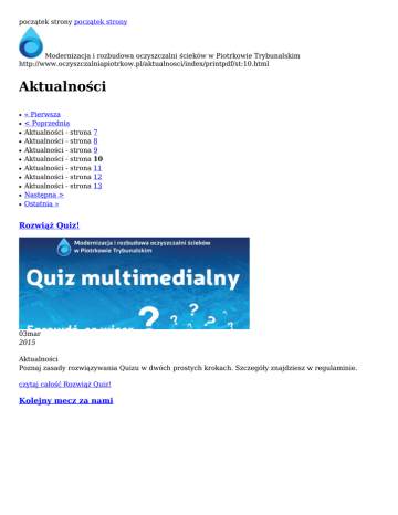 początek strony początek strony Modernizacja i rozbudowa oczyszczalni ścieków w Piotrkowie Trybunalskim http://www.oczyszczalniapiotrkow.pl/aktualnosci/index/printpdf/st:10.html Aktualności ● ● ● ● ● ● ● ● ● ● ● « Pierwsza < Poprzednia Aktualności - strona 7 Aktualności - strona 8 Aktualności - strona 9 Aktualności - strona 10 Aktualności - strona 11 Aktualności - strona 12 Aktualności - strona 13 Następna > Ostatnia » Rozwiąż Quiz! 03mar 2015 Aktualności Poznaj zasady rozwiązywania Quizu w dwóch prostych krokach. Szczegóły znajdziesz w regulaminie. czytaj całość Rozwiąż Quiz! Kolejny mecz za nami 02mar 2015 Aktualności W minioną sobotę 28 lutego już po raz kolejny mogliście nas spotkać na meczu Super Ligii Kobiet w piłce ręcznej. czytaj całość Kolejny mecz za nami Promocja projektu na meczu! 09lut 2015 Aktualności W ubiegłą sobotę 7 lutego mogliście nas spotkać nas ponownie na meczu Super Ligii Kobiet w piłce ręcznej. czytaj całość Promocja projektu na meczu! ● ● ● ● ● ● ● ● ● ● ● « Pierwsza < Poprzednia Aktualności - strona 7 Aktualności - strona 8 Aktualności - strona 9 Aktualności - strona 10 Aktualności - strona 11 Aktualności - strona 12 Aktualności - strona 13 Następna > Ostatnia »
