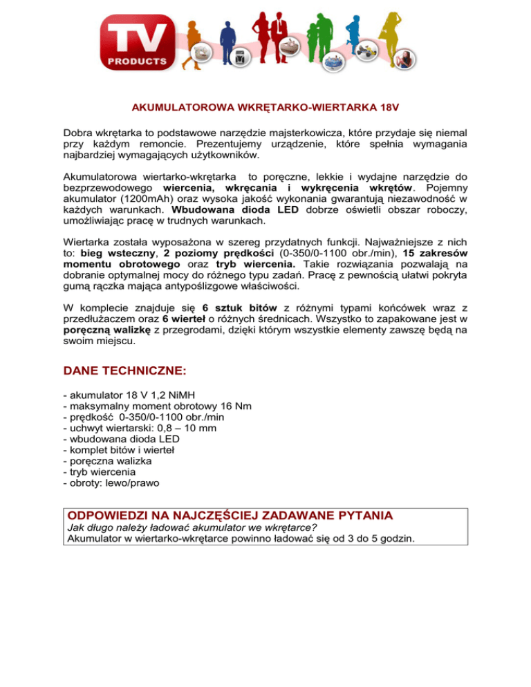 AKUMULATOROWA WKRĘTARKO-WIERTARKA 18V Dobra wkrętarka to podstawowe narzędzie majsterkowicza, które przydaje się niemal przy każdym remoncie. Prezentujemy urządzenie, które spełnia wymagania najbardziej wymagających użytkowników. Akumulatorowa wiertarko-wkrętarka to poręczne, lekkie i wydajne narzędzie do bezprzewodowego wiercenia, wkręcania i wykręcenia wkrętów. Pojemny akumulator (1200mAh) oraz wysoka jakość wykonania gwarantują niezawodność w każdych warunkach. Wbudowana dioda LED dobrze oświetli obszar roboczy, umożliwiając pracę w trudnych warunkach. Wiertarka została wyposażona w szereg przydatnych funkcji. Najważniejsze z nich to: bieg wsteczny, 2 poziomy prędkości (0-350/0-1100 obr./min), 15 zakresów momentu obrotowego oraz tryb wiercenia. Takie rozwiązania pozwalają na dobranie optymalnej mocy do różnego typu zadań. Pracę z pewnością ułatwi pokryta gumą rączka mająca antypoślizgowe właściwości. W komplecie znajduje się 6 sztuk bitów z różnymi typami końcówek wraz z przedłużaczem oraz 6 wierteł o różnych średnicach. Wszystko to zapakowane jest w poręczną walizkę z przegrodami, dzięki którym wszystkie elementy zawszę będą na swoim miejscu. DANE TECHNICZNE: - akumulator 18 V 1,2 NiMH - maksymalny moment obrotowy 16 Nm - prędkość 0-350/0-1100 obr./min - uchwyt wiertarski: 0,8 – 10 mm - wbudowana dioda LED - komplet bitów i wierteł - poręczna walizka - tryb wiercenia - obroty: lewo/prawo ODPOWIEDZI NA NAJCZĘŚCIEJ ZADAWANE PYTANIA Jak długo należy ładować akumulator we wkrętarce? Akumulator w wiertarko-wkrętarce powinno ładować się od 3 do 5 godzin.