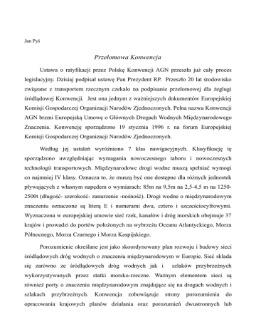 Jan Pyś Przełomowa Konwencja Ustawa o ratyfikacji przez Polskę Konwencji AGN przeszła już cały proces legislacyjny. Dzisiaj podpisał ustawę Pan Prezydent RP. Przeszło 20 lat środowisko związane z transportem rzecznym czekało na podpisanie przełomowej dla żeglugi śródlądowej Konwencji. Jest ona jednym z ważniejszych dokumentów Europejskiej Komisji Gospodarczej Organizacji Narodów Zjednoczonych. Pełna nazwa Konwencji AGN brzmi Europejską Umowę o Głównych Drogach Wodnych Międzynarodowego Znaczenia. Konwencję sporządzono 19 stycznia 1996 r. na forum Europejskiej Komisji Gospodarczej Organizacji Narodów Zjednoczonych. Według jej ustaleń wyróżniono 7 klas nawigacyjnych. Klasyfikację tę sporządzono uwzględniając wymagania nowoczesnego taboru i nowoczesnych technologii transportowych. Międzynarodowe drogi wodne muszą spełniać wymogi co najmniej IV klasy. Oznacza to, że muszą być one dostępne dla różnych jednostek pływających z własnym napędem o wymiarach: 85m na 9,5m na 2,5-4,5 m na 12502500t (długość- szerokość- zanurzenie -nośność). Drogi wodne o międzynarodowym znaczeniu oznaczone są literą E i numerami dwu, cztero i szcześciocyfrowymi. Wyznaczona w europejskiej umowie sieć rzek, kanałów i dróg morskich obejmuje 37 krajów i prowadzi do portów położonych na wybrzeżu Oceanu Atlantyckiego, Morza Północnego, Morza Czarnego i Morza Kaspijskiego. Porozumienie określane jest jako skoordynowany plan rozwoju i budowy sieci śródlądowych dróg wodnych o znaczeniu międzynarodowym w Europie. Sieć składa się zarówno ze śródlądowych dróg wodnych jak i szlaków przybrzeżnych wykorzystywanych przez statki morsko-rzeczne. Ważnym elementem sieci są również porty o znaczeniu międzynarodowym znajdujące się na drogach wodnych i szlakach przybrzeżnych. Konwencja zobowiązuje strony porozumienia do opracowania krajowych planów działania oraz porozumień dwustronnych lub wielostronnych mające na celu wyeliminowanie istniejących zwężeń i ukończenie brakujących połączeń w sieci dróg wodnych. Pomimo tego, że Polska do tej pory nie była sygnatariuszem umowy to i tak pośrednio powoływała się na jej treść przez dokumenty organizacji międzynarodowych do których należy. Jedną z takich organizacji jest Europejska Konferencja Ministrów Transportu (European Conference of Ministers of Transport ECMT) powołana w 1953 Jej członkami są ministrowie transportu 43 państw a od 1991 r do Konferencji należy polski minister transportu. ECMT wypowiadała się na temat Konwencji AGN w deklaracjach: 1. Deklaracja Praska z1991 r. stwierdza, że w ramach Paneuropejskich korytarzy transportowych należy uwzględnić trzy rodzaje transportu: kołowy, kolejowy i wodny śródlądowy, a także, że drogi wodne w korytarzach transportowych powinny mieć parametry międzynarodowe tj. powyżej IV klasy żeglowności. 2. Deklaracja z Krety z 1994 r. wzywa do podpisania i przestrzegania Konwencji AGN. Ustalono także przebieg 10 paneuropejskich korytarzy transportowych w tym korytarz III który przebiega wzdłuż Odry, Kanałem Odra-Szprewa. 3. Deklaracja Helsińska z 1997 r. bezpośrednio wzywa państwa do przystąpienia do Konwencji AGN. 4. Deklaracja z Rotterdamu z 2001 r. wspiera wysiłki rządów w realizacji połączeń między Dunajem, Odrą i Łabą oraz namawia do likwidacji wąskich gardeł w transporcie wodnym. Inną organizacja międzynarodową powołującą się na Konwencję AGN, której Polska jest członkiem jest Grupa Wyszehradzka. Organizacja ta w roku 2010 przyjęła w Budapeszcie dokument w sprawie rozwoju przestrzennego krajów Grupy. Dokument zawiera plany dróg wodnych państw, które przebiegają według ustaleń Konwencji AGN. Także Unia Europejska w swoich strategicznych dla żeglugi dokumentach wielokrotnie powołuje się na Europejską Komisję Gospodarczej Organizacji Narodów Zjednoczonych i jej konwencje: 1. Komunikat Komisji w sprawie promocji żeglugi śródlądowej „NAIADES” Zintegrowany Europejski Program Działań na Rzecz Żeglugi Śródlądowej z 23 stycznia 2006. 2. Rozporządzenie Parlamentu Europejskiego i Rady (UE) nr 1315/2013 z dnia 11 grudnia 2013 w sprawie unijnych wytycznych dotyczących rozwoju transeuropejskiej sieci transportowej i uchylające decyzję nr 661/2010/UE. 3. Biała Księga - Plan utworzenia jednolitego europejskiego obszaru transportu – dążenie do osiągnięcia konkurencyjnego i zasobooszczędnego systemu transportu z 29 marca 2011. 4. Komunikat – W kierunku wysokiej jakości śródlądowego transportu wodnego NAIADES II z 10 września 2013. Przez Polskę wyznaczone zostały trzy główne drogi wodne międzynarodowego znaczenia E-30 (Bogumin-Sczecin) E-70 (Kostrzyn-Bydgoszcz-Królewiec) i E-40 (Gdańsk-Modlin-Brześć) Ostatnio do porozumienia przystąpiła Ukraina. Polska jest jedynym państwem Europy Środkowej, które nie przystąpiło do Konwencji. W umowie AGN wpisane są także porty międzynarodowe. W Polsce portami tymi są: Świnoujście, Szczecin, Kostrzyn, Wrocław, Koźle, Gliwice, Gdańsk, Bydgoszcz, Elbląg. Od lat argumentów przeciw podpisaniu Konwencji AGN dostarczało Ministerstwo Środowiska właściwe ds. dróg wodnych. W roku 2007 na na zapytanie nr 2369 ministerstwo odpowiadało, że: brak środków finansowych na inwestycje na drogach wodnych i ich przebudowę były podstawową przyczyną, dla której strona polska nie podpisała porozumienia. Ponad to wdrażanie rozwiązań technicznych w sposób znaczący zmieniłyby charakter i krajobraz samych rzek i dolin rzecznych i na pewno spotkałyby się to z uzasadnioną krytyką szczególnie środowisk ekologicznych. Argumenty Ministerstwa Środowiska wydają się nie wystarczające, gdyż umowy AGN nie określa terminu realizacji inwestycji jest jedynie deklaracją przystąpienia do wspólnej europejskiej polityki nakreślonej przez ONZ. Trudno za tym mówić, że przystąpienie do Konw