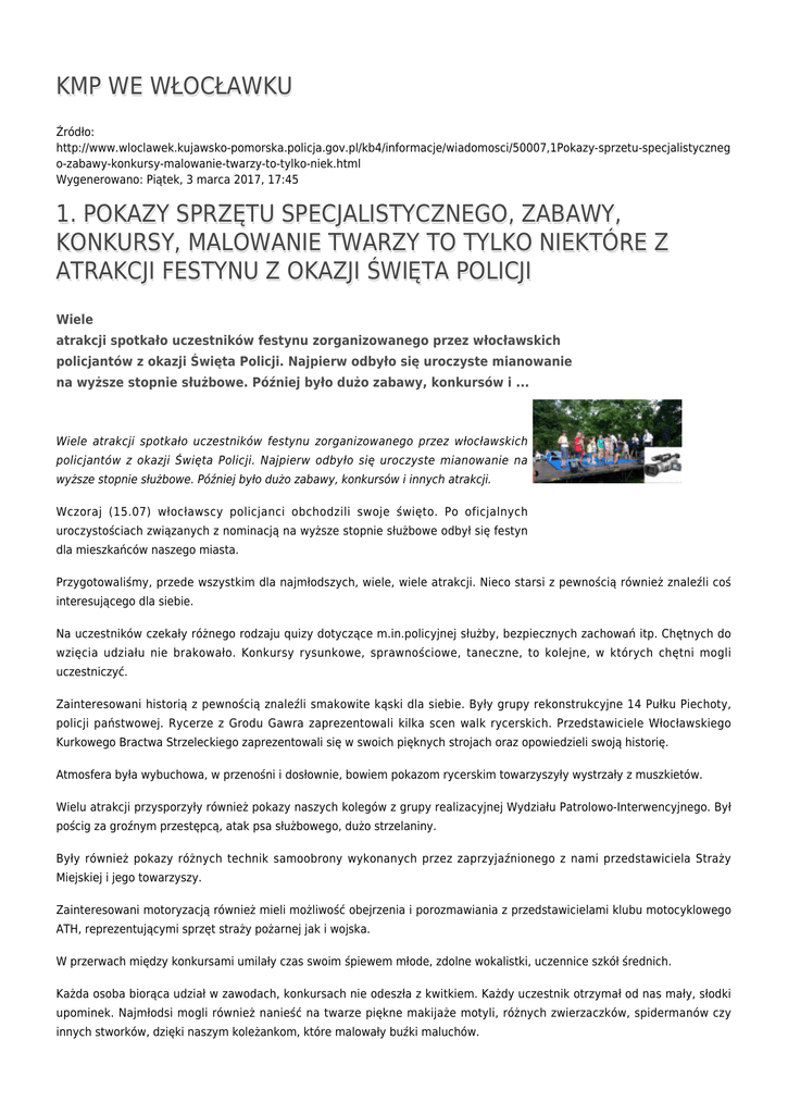 KMP WE WŁOCŁAWKU Źródło: http://www.wloclawek.kujawsko-pomorska.policja.gov.pl/kb4/informacje/wiadomosci/50007,1Pokazy-sprzetu-specjalistyczneg o-zabawy-konkursy-malowanie-twarzy-to-tylko-niek.html Wygenerowano: Piątek, 3 marca 2017, 17:45 1. POKAZY SPRZĘTU SPECJALISTYCZNEGO, ZABAWY, KONKURSY, MALOWANIE TWARZY TO TYLKO NIEKTÓRE Z ATRAKCJI FESTYNU Z OKAZJI ŚWIĘTA POLICJI Wiele atrakcji spotkało uczestników festynu zorganizowanego przez włocławskich policjantów z okazji Święta Policji. Najpierw odbyło się uroczyste mianowanie na wyższe stopnie służbowe. Później było dużo zabawy, konkursów i ... Wiele atrakcji spotkało uczestników festynu zorganizowanego przez włocławskich policjantów z okazji Święta Policji. Najpierw odbyło się uroczyste mianowanie na wyższe stopnie służbowe. Później było dużo zabawy, konkursów i innych atrakcji. Wczoraj (15.07) włocławscy policjanci obchodzili swoje święto. Po oficjalnych uroczystościach związanych z nominacją na wyższe stopnie służbowe odbył się festyn dla mieszkańców naszego miasta. Przygotowaliśmy, przede wszystkim dla najmłodszych, wiele, wiele atrakcji. Nieco starsi z pewnością również znaleźli coś interesującego dla siebie. Na uczestników czekały różnego rodzaju quizy dotyczące m.in.policyjnej służby, bezpiecznych zachowań itp. Chętnych do wzięcia udziału nie brakowało. Konkursy rysunkowe, sprawnościowe, taneczne, to kolejne, w których chętni mogli uczestniczyć. Zainteresowani historią z pewnością znaleźli smakowite kąski dla siebie. Były grupy rekonstrukcyjne 14 Pułku Piechoty, policji państwowej. Rycerze z Grodu Gawra zaprezentowali kilka scen walk rycerskich. Przedstawiciele Włocławskiego Kurkowego Bractwa Strzeleckiego zaprezentowali się w swoich pięknych strojach oraz opowiedzieli swoją historię. Atmosfera była wybuchowa, w przenośni i dosłownie, bowiem pokazom rycerskim towarzyszyły wystrzały z muszkietów. Wielu atrakcji przysporzyły również pokazy naszych kolegów z grupy realizacyjnej Wydziału Patrolowo-Interwencyjnego. Był pościg za groźnym przestępcą, atak psa służbowego, dużo strzelaniny. Były również pokazy różnych technik samoobrony wykonanych przez zaprzyjaźnionego z nami przedstawiciela Straży Miejskiej i jego towarzyszy. Zainteresowani motoryzacją również mieli możliwość obejrzenia i porozmawiania z przedstawicielami klubu motocyklowego ATH, reprezentującymi sprzęt straży pożarnej jak i wojska. W przerwach między konkursami umilały czas swoim śpiewem młode, zdolne wokalistki, uczennice szkół średnich. Każda osoba biorąca udział w zawodach, konkursach nie odeszła z kwitkiem. Każdy uczestnik otrzymał od nas mały, słodki upominek. Najmłodsi mogli również nanieść na twarze piękne makijaże motyli, różnych zwierzaczków, spidermanów czy innych stworków, dzięki naszym koleżankom, które malowały buźki maluchów. Na scenie i nie tylko zrobiło się bardzo skocznie, bowiem grupa taneczna ze studia tańca rozgrzała swoimi występami oglądających. Chętni również mogli zmierzyć się ze swoimi umiejętnościami na „parkiecie”. Imprezie oprócz pogody dopisały również humory. Stało się tak z pewnością dzięki naszym przyjaciołom, dzięki którym udało się tak zorganizować i uatrakcyjnić festyn. Na zakończenie dobrej zabawy usłyszeliśmy wiele stwierdzeń „szkoda, że już koniec” co jest najlepszym podsumowaniem zorganizowanej przez nas imprezy. Autor: 566164 Publikacja: 566164 Ocena: 0/5 (0) Tweetnij