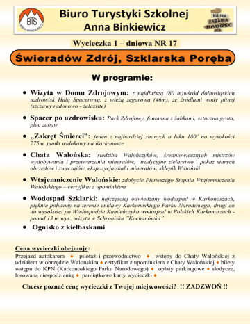 Wycieczka 1 – dniowa NR 17 Świeradów Zdrój, Szklarska Poręba W programie: Wizyta w Domu Zdrojowym: z najdłuższą (80 m)wśród dolnośląskich uzdrowisk Halą Spacerową, z wieżą zegarową (46m), ze źródłami wody pitnej (szczawy radonowo - żelaziste) Spacer po uzdrowisku: Park Zdrojowy, fontanna z żabkami, sztuczna grota, plac zabaw „Zakręt Śmierci”: jeden z najbardziej znanych o łuku 180’ na wysokości 775m, punkt widokowy na Karkonosze Chata Walońska: siedziba Walończyków, średniowiecznych mistrzów wydobywania i przetwarzania minerałów, tradycyjne zielarstwo, pokaz starych obrzędów i zwyczajów, ekspozycja skał i minerałów, sklepik Waloński Wtajemniczenie Walońskie: zdobycie Pierwszego Stopnia Wtajemniczenia Walońskiego – certyfikat z upominkiem Wodospad Szklarki: najczęściej odwiedzany wodospad w Karkonoszach, pięknie położony na terenie enklawy Karkonoskiego Parku Narodowego, drugi co do wysokości po Wodospadzie Kamieńczyka wodospad w Polskich Karkonoszach ponad 13 m wys., wizyta w Schronisku ”Kochanówka” Ognisko z kiełbaskami Cena wycieczki obejmuje: Przejazd autokarem ♦ pilotaż i przewodnictwo ♦ wstępy do Chaty Walońskiej z udziałem w obrzędzie Walońskim ♦ certyfikat z upominkiem z Chaty Walońskiej ♦ bilety wstępu do KPN (Karkonoskiego Parku Narodowego) ♦ opłaty parkingowe ♦ słodycze, losowaną niespodziankę ♦ pamiątkowe karty wycieczki ♦ Chcesz poznać cenę wycieczki z Twojej miejscowości? !! ZADZWOŃ !! Biuro Turystyki Szkolnej Anna Binkiewicz tel. 601-842-848 ♦ e-mail:[email protected] ul. Zbigniewa Herberta 9, 59-700 Bolesławiec