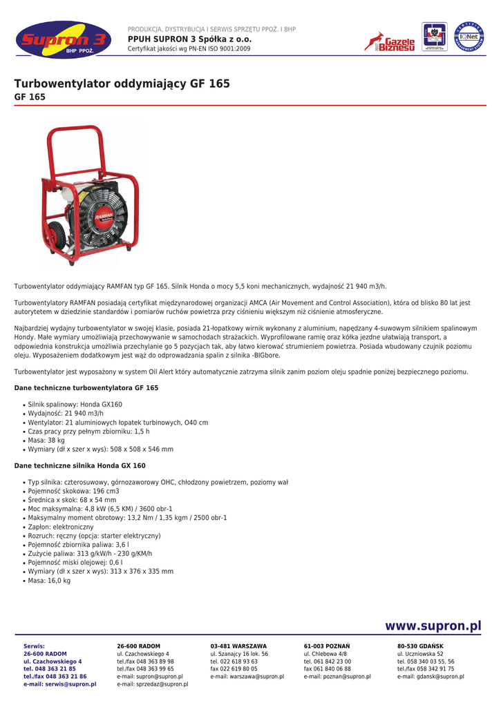 PRODUKCJA, DYSTRYBUCJA I SERWIS SPRZĘTU PPOŻ. I BHP PPUH SUPRON 3 Spółka z o.o. Certyfikat jakości wg PN-EN ISO 9001:2009 Turbowentylator oddymiający GF 165 GF 165 Turbowentylator oddymiający RAMFAN typ GF 165. Silnik Honda o mocy 5,5 koni mechanicznych, wydajność 21 940 m3/h. Turbowentylatory RAMFAN posiadają certyfikat międzynarodowej organizacji AMCA (Air Movement and Control Association), która od blisko 80 lat jest autorytetem w dziedzinie standardów i pomiarów ruchów powietrza przy ciśnieniu większym niż ciśnienie atmosferyczne. Najbardziej wydajny turbowentylator w swojej klasie, posiada 21-łopatkowy wirnik wykonany z aluminium, napędzany 4-suwowym silnikiem spalinowym Hondy. Małe wymiary umożliwiają przechowywanie w samochodach strażackich. Wyprofilowane ramię oraz kółka jezdne ułatwiają transport, a odpowiednia konstrukcja umożliwia przechylanie go 5 pozycjach tak, aby łatwo kierować strumieniem powietrza. Posiada wbudowany czujnik poziomu oleju. Wyposażeniem dodatkowym jest wąż do odprowadzania spalin z silnika -BIGbore. Turbowentylator jest wyposażony w system Oil Alert który automatycznie zatrzyma silnik zanim poziom oleju spadnie poniżej bezpiecznego poziomu. Dane techniczne turbowentylatora GF 165 ● ● ● ● ● ● Silnik spalinowy: Honda GX160 Wydajność: 21 940 m3/h Wentylator: 21 aluminiowych łopatek turbinowych, O40 cm Czas pracy przy pełnym zbiorniku: 1,5 h Masa: 38 kg Wymiary (dł x szer x wys): 508 x 508 x 546 mm Dane techniczne silnika Honda GX 160 ● ● ● ● ● ● ● ● ● ● ● ● Typ silnika: czterosuwowy, górnozaworowy OHC, chłodzony powietrzem, poziomy wał Pojemność skokowa: 196 cm3 Średnica x skok: 68 x 54 mm Moc maksymalna: 4,8 kW (6,5 KM) / 3600 obr-1 Maksymalny moment obrotowy: 13,2 Nm / 1,35 kgm / 2500 obr-1 Zapłon: elektroniczny Rozruch: ręczny (opcja: starter elektryczny) Pojemność zbiornika paliwa: 3,6 l Zużycie paliwa: 313 g/kW/h - 230 g/KM/h Pojemność miski olejowej: 0,6 l Wymiary (dł x szer x wys): 313 x 376 x 335 mm Masa: 16,0 kg www.supron.pl Serwis: 26-600 RADOM ul. Czachowskiego 4 tel. 048 363 21 85 tel./fax 048 363 21 86 e-mail: [email protected] 26-600 RADOM ul. Czachowskiego 4 tel./fax 048 363 89 98 tel./fax 048 363 99 65 e-mail: [email protected] e-mail: [email protected] 03-481 WARSZAWA ul. Szanajcy 16 lok. 56 tel. 022 618 93 63 fax 022 619 80 05 e-mail: [email protected] 61-003 POZNAŃ ul. Chlebowa 4/8 tel. 061 842 23 00 fax 061 840 06 88 e-mail: [email protected] 80-530 GDAŃSK ul. Uczniowska 52 tel. 058 340 03 55, 56 tel./fax 058 342 91 75 e-mail: [email protected]
