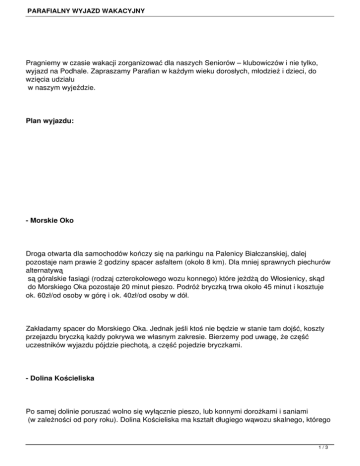 PARAFIALNY WYJAZD WAKACYJNY Pragniemy w czasie wakacji zorganizować dla naszych Seniorów – klubowiczów i nie tylko, wyjazd na Podhale. Zapraszamy Parafian w każdym wieku dorosłych, młodzież i dzieci, do wzięcia udziału w naszym wyjeździe. Plan wyjazdu: - Morskie Oko Droga otwarta dla samochodów kończy się na parkingu na Palenicy Białczanskiej, dalej pozostaje nam prawie 2 godziny spacer asfaltem (około 8 km). Dla mniej sprawnych piechurów alternatywą są góralskie fasiągi (rodzaj czterokołowego wozu konnego) które jeżdżą do Włosienicy, skąd do Morskiego Oka pozostaje 20 minut pieszo. Podróż bryczką trwa około 45 minut i kosztuje ok. 60zł/od osoby w górę i ok. 40zł/od osoby w dół. Zakładamy spacer do Morskiego Oka. Jednak jeśli ktoś nie będzie w stanie tam dojść, koszty przejazdu bryczką każdy pokrywa we własnym zakresie. Bierzemy pod uwagę, że część uczestników wyjazdu pójdzie piechotą, a część pojedzie bryczkami. - Dolina Kościeliska Po samej dolinie poruszać wolno się wyłącznie pieszo, lub konnymi dorożkami i saniami (w zależności od pory roku). Dolina Kościeliska ma kształt długiego wąwozu skalnego, którego 1/3 PARAFIALNY WYJAZD WAKACYJNY ściany w trzech miejscach zbliżając się do siebie, tworzą tzw. bramy - Niżną (Brama Kantaka), Pośrednią (Brama Kraszewskiego) oraz Wyżnia (Brama Raptawicka). Hala Ornak Szlak do Hali Ornak wieńczącej dolinę Kościeliską liczy sobie 9 km, a dojście do Górskiego Schroniska Ornak powinno zająć około 1,5 h. - Pustelnia brata Alberta W północnej części ogrodu klasztornego sióstr albertynek na Kalatówkach znajduje się niewielki drewniany budynek, nazywany Pustelnią Brata Alberta. Wybudowany został w 1901 r. jako pomieszczenie dla księży, którzy odprawiali msze święte w pobliskiej kaplicy. Umieszczono tam także celę dla założyciela zakonu, który często przybywał z Krakowa na Kalatówki na wypoczynek, i do pracy. Obecnie w chatce urządzona jest Izba Pamięci po św. Bracie Albercie - Gubałówka Na Gubałówkę prowadzi kolej linowo-terenowa z Zakopanego, wybudowana w 1938 roku, długości 1298 m, przy różnicy wysokości ok. 300 m., zmodernizowana w 2001 roku. Góra jest popularna wśród turystów odwiedzających Zakopane. Panorama całych polskich Tatr, Zakopanego oraz Podhala, Pienin, Gorców, Beskidu Żywieckiego jak i ich słowackiej części. Z Gubałówki prowadzi spacerowy Szlak Papieski na Butorowski Wierch 1160 m n.p.m., z którego można zjechać kolejką krzesełkową do Kościeliska. Będziemy spacerować od strony Zębu wzgórzem gubałowskim na szczyt, z którego zjedziemy kolejką torową. - Apel Jasnogórski w Sanktuarium MB Fatimskiej na Krzeptówkach - Spacer po Krupówkach – najważniejszym deptaku Zakopanego 2/3 PARAFIALNY WYJAZD WAKACYJNY - Wielka Krokiew – największa skocznia narciarska w Polsce, obiekt Pucharu Świata w skokach narciarskich - Sanktuarium MB Gaździny Podhala w Ludźmierzu TERMIN: 29.07.2013 – 02.08.2013 Cena: 420,00 zł/osobę Cena obejmuje: przejazd autokarem, noclegi, wyżywienie (3 posiłki), bilety wstępu do Parku Narodowego, kolejka na Gubałówkę. Aby wyjazd doszedł do skutku minimalna liczba uczestników: 40 osób. 3/3