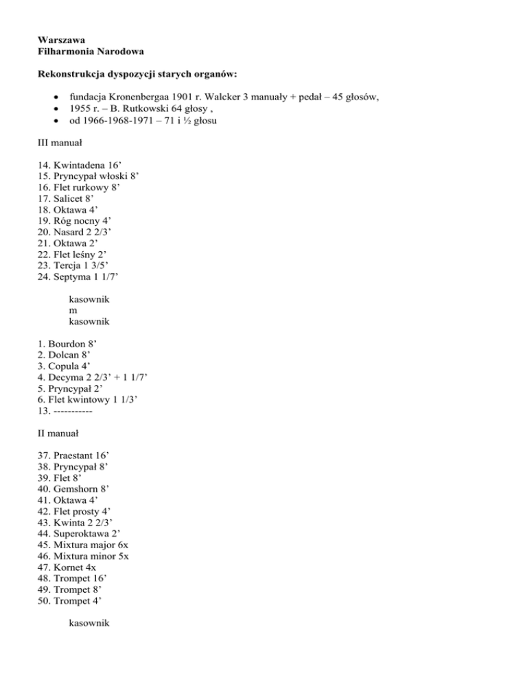 Warszawa Filharmonia Narodowa Rekonstrukcja dyspozycji starych organów: • • • fundacja Kronenbergaa 1901 r. Walcker 3 manuały + pedał – 45 głosów, 1955 r. – B. Rutkowski 64 głosy , od 1966-1968-1971 – 71 i ½ głosu III manuał 14. Kwintadena 16’ 15. Pryncypał włoski 8’ 16. Flet rurkowy 8’ 17. Salicet 8’ 18. Oktawa 4’ 19. Róg nocny 4’ 20. Nasard 2 2/3’ 21. Oktawa 2’ 22. Flet leśny 2’ 23. Tercja 1 3/5’ 24. Septyma 1 1/7’ kasownik m kasownik 1. Bourdon 8’ 2. Dolcan 8’ 3. Copula 4’ 4. Decyma 2 2/3’ + 1 1/7’ 5. Pryncypał 2’ 6. Flet kwintowy 1 1/3’ 13. ----------II manuał 37. Praestant 16’ 38. Pryncypał 8’ 39. Flet 8’ 40. Gemshorn 8’ 41. Oktawa 4’ 42. Flet prosty 4’ 43. Kwinta 2 2/3’ 44. Superoktawa 2’ 45. Mixtura major 6x 46. Mixtura minor 5x 47. Kornet 4x 48. Trompet 16’ 49. Trompet 8’ 50. Trompet 4’ kasownik Pedał 65. Subkontra 32’ 66. Pryncypał 16’ 67. Subbas 16’ 68. Echobas 16’ 69. Oktawa 8’ 70. Flet basowy 8’ 71. Oktawa włos. 4’ 72. Róg nocny 2’ 73. Flet polny 1’ 74. Alikwoty 4x 75. Mikstura 5x 76. Puzon 16’ 77. Sordun 16’ 78. Bombarde 8’ 79. Clairon 4’ 80. Cornett 2’ m 7. Tecnona 1 3/5’ + 8/9’ 8. Acuta 5x 9. Cymbel 3x 10. Vox humana 8’ 11. ---------12. Tremolo kasownik III manuał kasownik 25. Flageolet 1’ 26. Nona 8/9’ 27. Mixtura 7x 28. Cymabel 4x 29. Fagot 16’ 30. Trąbka jasna 8’ 31. Obój 8’ 32. Clarino 4’ 33. -------34. Tremolo 35. --------36. --------Wyłączniki gł. jęz.: 10, 76, 77, 78, 79,80, 48, 49, 50, 61, 62, 29, 30, 31, 32 Echo III manuał Crescendo 0-10 WK 1-4 Tutti Kasownik