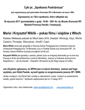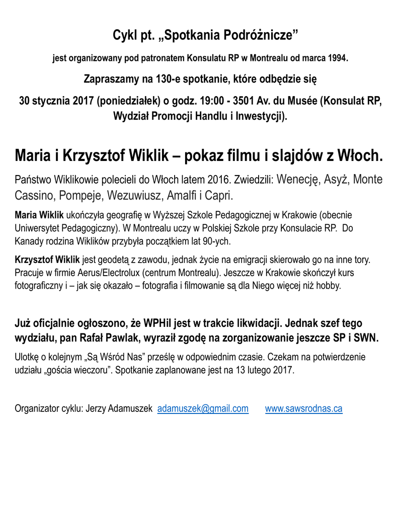 Cykl pt. „Spotkania Podróżnicze” jest organizowany pod patronatem Konsulatu RP w Montrealu od marca 1994 . Zapraszamy na 130-e spotkanie, które odbędzie się 30 stycznia 2017 (poniedziałek) o godz. 19:00 - 3501 Av. du Musée (Konsulat RP, Wydział Promocji Handlu i Inwestycji). Maria i Krzysztof Wiklik – pokaz filmu i slajdów z Włoch. Państwo Wiklikowie polecieli do Włoch latem 2016. Zwiedzili: Wenecję, Asyż, Monte Cassino, Pompeje, Wezuwiusz, Amalfi i Capri. Maria Wiklik ukończyła geografię w Wyższej Szkole Pedagogicznej w Krakowie (obecnie Uniwersytet Pedagogiczny). W Montrealu uczy w Polskiej Szkole przy Konsulacie RP. Do Kanady rodzina Wiklików przybyła początkiem lat 90-ych. Krzysztof Wiklik jest geodetą z zawodu, jednak życie na emigracji skierowało go na inne tory. Pracuje w firmie Aerus/Electrolux (centrum Montrealu). Jeszcze w Krakowie skończył kurs fotograficzny i – jak się okazało – fotografia i filmowanie są dla Niego więcej niż hobby. Już oficjalnie ogłoszono, że WPHiI jest w trakcie likwidacji. Jednak szef tego wydziału, pan Rafał Pawlak, wyraził zgodę na zorganizowanie jeszcze SP i SWN. Ulotkę o kolejnym „Są Wśród Nas” prześlę w odpowiednim czasie. Czekam na potwierdzenie udziału „gościa wieczoru”. Spotkanie zaplanowane jest na 13 lutego 2017. Organizator cyklu: Jerzy Adamuszek [email protected] www.sawsrodnas.ca