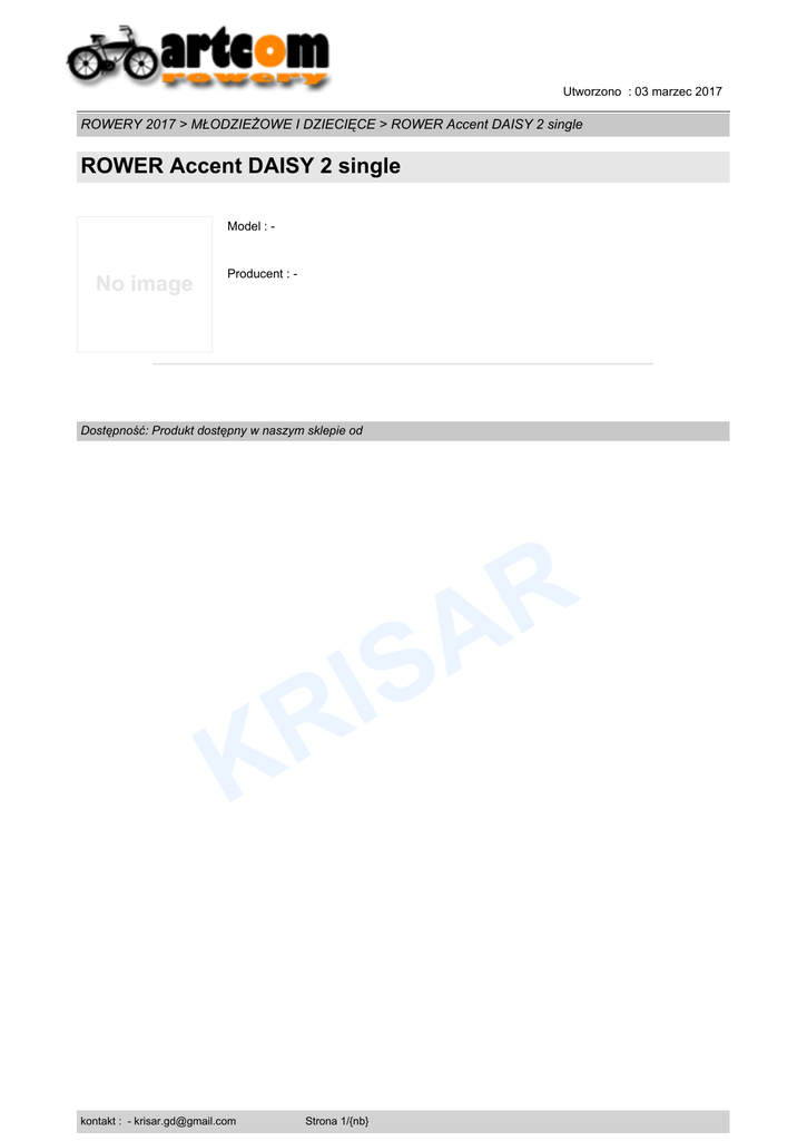 Utworzono : 03 marzec 2017 ROWERY 2017 > MŁODZIEŻOWE I DZIECIĘCE > ROWER Accent DAISY 2 single ROWER Accent DAISY 2 single Model : - No image Producent : - Dostępność: Produkt dostępny w naszym sklepie od R A K kontakt : - [email protected] S I R Strona 1/{nb}