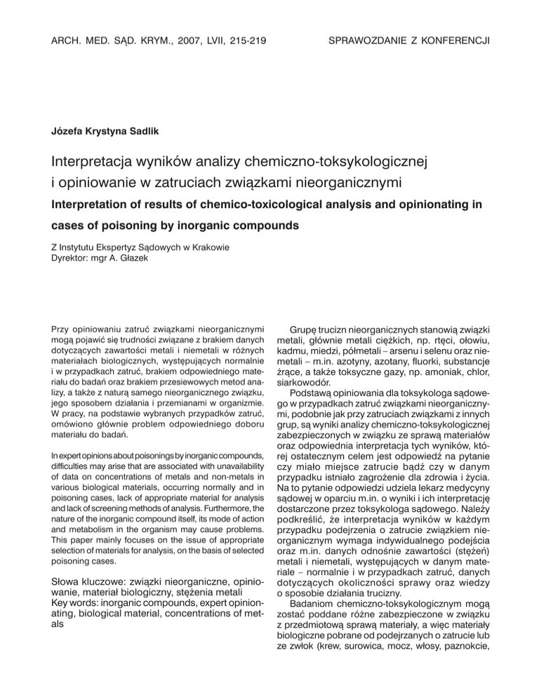 ARCH. MED. SĄD. KRYM., 2007, LVII, 215-219 Sprawozdanie z konferencji Józefa Krystyna Sadlik Interpretacja wyników analizy chemiczno-toksykologicznej i opiniowanie w zatruciach związkami nieorganicznymi Interpretation of results of chemico-toxicological analysis and opinionating in cases of poisoning by inorganic compounds Z Instytutu Ekspertyz Sądowych w Krakowie Dyrektor: mgr A. Głazek Przy opiniowaniu zatruć związkami nieorganicznymi mogą pojawić się trudności związane z brakiem danych dotyczących zawartości metali i niemetali w różnych materiałach biologicznych, występujących normalnie i w przypadkach zatruć, brakiem odpowiedniego materiału do badań oraz brakiem przesiewowych metod analizy, a także z naturą samego nieorganicznego związku, jego sposobem działania i przemianami w organizmie. W pracy, na podstawie wybranych przypadków zatruć, omówiono głównie problem odpowiedniego doboru materiału do badań. In expert opinions about poisonings by inorganic compounds, difficulties may arise that are associated with unavailability of data on concentrations of metals and non-metals in various biological materials, occurring normally and in poisoning cases, lack of appropriate material for analysis and lack of screening methods of analysis. Furthermore, the nature of the inorganic compound itself, its mode of action and metabolism in the organism may cause problems. This paper mainly focuses on the issue of appropriate selection of materials for analysis, on the basis of selected poisoning cases. Słowa kluczowe: związki nieorganiczne, opiniowanie, materiał biologiczny, stężenia metali Key words: inorganic compounds, expert opinion ating, biological material, concentrations of metals Grupę trucizn nieorganicznych stanowią związki metali, głównie metali ciężkich, np. rtęci, ołowiu, kadmu, miedzi, półmetali – arsenu i selenu oraz niemetali – m.in. azotyny, azotany, fluorki, substancje żrące, a także toksyczne gazy, np. amoniak, chlor, siarkowodór. Podstawą opiniowania dla toksykologa sądowego w przypadkach zatruć związkami nieorganicznymi, podobnie jak przy zatruciach związkami z innych grup, są wyniki analizy chemiczno-toksykologicznej zabezpieczonych w związku ze sprawą materiałów oraz odpowiednia interpretacja tych wyników, której ostatecznym celem jest odpowiedź na pytanie czy miało miejsce zatrucie bądź czy w danym przypadku istniało zagrożenie dla zdrowia i życia. Na to pytanie odpowiedzi udziela lekarz medycyny sądowej w oparciu m.in. o wyniki i ich interpretację dostarczone przez toksykologa sądowego. Należy podkreślić, że interpretacja wyników w każdym przypadku podejrzenia o zatrucie związkiem nieorganicznym wymaga indywidualnego podejścia oraz m.in. danych odnośnie zawartości (stężeń) metali i niemetali, występujących w danym materiale – normalnie i w przypadkach zatruć, danych dotyczących okoliczności sprawy oraz wiedzy o sposobie działania trucizny. Badaniom chemiczno-toksykologicznym mogą zostać poddane różne zabezpieczone w związku z przedmiotową sprawą materiały, a więc materiały biologiczne pobrane od podejrzanych o zatrucie lub ze zwłok (krew, surowica, mocz, włosy, paznokcie, 216 Józefa Krystyna Sadlik wycinki narządów wewnętrznych, kości), a także materiały zabezpieczone na miejscu zdarzenia np. żywność, woda, nieznane substancje do identyfikacji. Głównym źródłem trudności interpretacyjnych w przypadkach zatruć lub podejrzenia o zatrucie związkami nieorganicznymi może być: brak wystarczającej ilości danych odniesienia na temat stężeń w materiale biologicznym i w przypadkach zatruć oraz brak odpowiedniego materiału do badań. Dysponowanie różnym rodzajem materiału do badań i dużą ilością danych ułatwia interpretację wyniku w odniesieniu do wykluczenia lub potwierdzenia zatrucia. Przyczyną trudności w opiniowaniu może być też sama natura nieorganicznego związku, jego sposób działania i przemiany w organizmie, można tu wymienić np. siarkowodór [1], związki potasu [2], środki żrące. Brak metod przesiewowych w analizie związków nieorganicznych, powoduje, że każdy związek nieorganiczny jest oddzielnie zanalizowany i to niejednokrotnie przy zastosowaniu różnych metod, co może być przyczyną niewykrycia niektórych Nr 2 trucizn. Pewną nadzieją w tym zakresie może być intensywnie rozwijająca się w okresie ostatnich kilku lat metoda analizy wielopierwiastkowej przy zastosowaniu emisji w plaźmie indukcyjnie sprzężonej (ICP) [3-6]. Metoda ta jest jednak metodą skomplikowaną i nie jest powszechnie dostępna. W piśmiennictwie krajowym i zagranicznym jest stosunkowo mało danych na temat normalnych stężeń metali i niemetali w narządach wewnętrznych. Większość prac dotyczy stężeń niektórych metali we krwi lub surowicy w aspekcie występowania pewnych chorób [3] i ich leczenia (np. suplementacji) lub oceny zanieczyszczenia środowiska. Dane te w pewnym, ograniczonym zakresie mogą służyć przy interpretacji wyników dotyczących zatruć. Normalne stężenia metali i niemetali w materiale biologicznym mogą wahać się w szerokich granicach w zależności od rozpatrywanego pierwiastka i badanego materiału. Za przykład może posłużyć stężenie rtęci, ołowiu i cynku w niektórych materiałach biologicznych (tabela I). Tabela I. Normalne stężenia metali (μg/g, μg/ml) w materiale biologicznym (przykłady) [7-9]. Table I. Normal concentrations of metals (µg/g, µg/ml) in biological material (examples) [7-9]. Metal Metal Materiał Material Stężenie Concentration (μg/g, μg/ml) Materiał Material Stężenie Concentration (μg/g, μg/ml) Rtęć Mercury Krew, mocz Blood, urine do 0,010 up to 0,010 Wątroba Liver 0,003-0,055 Włosy Hair do 1,0 up to 1,0 Nerka Kidney 0,003-0,170 Krew Blood do 0,10 up to 0,10 Wątroba Liver 0,12-5,00 Włosy Hair do 10 Nerka Kidney 0,20-1,70 Krew Blood 5,00-7