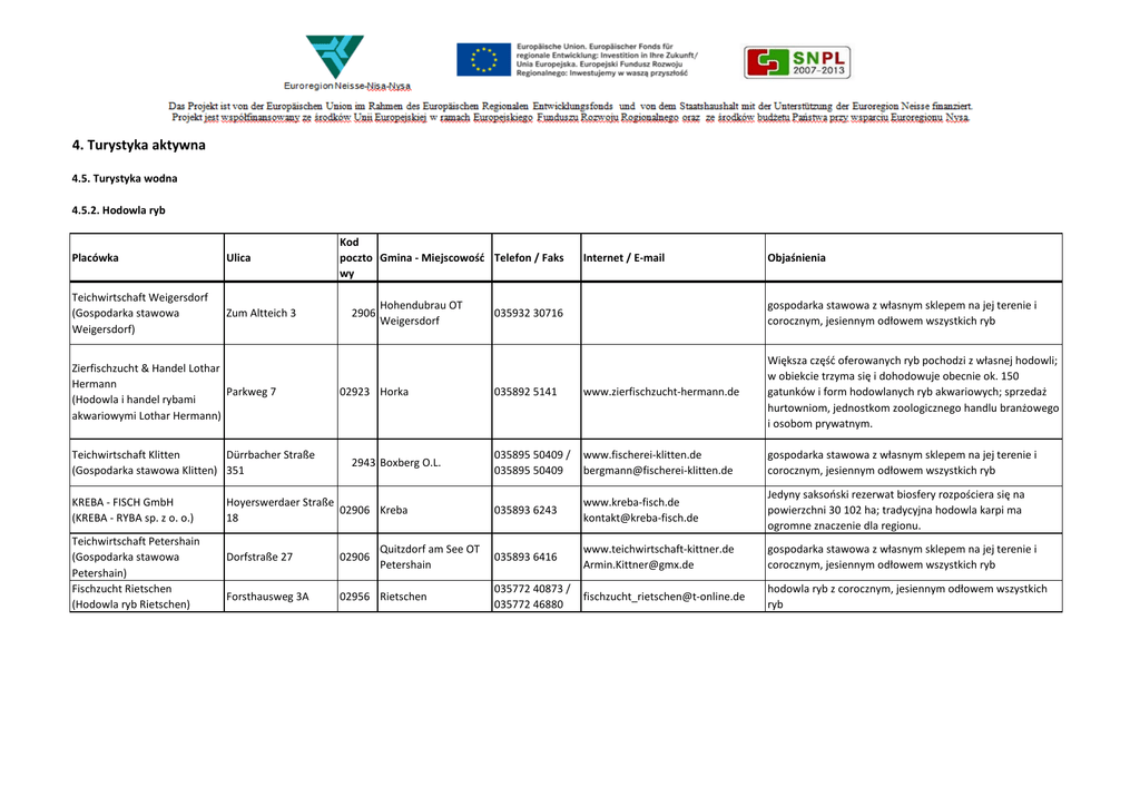 4. Turystyka aktywna 4.5. Turystyka wodna 4.5.2. Hodowla ryb Placówka Ulica Teichwirtschaft Weigersdorf (Gospodarka stawowa Weigersdorf) Zum Altteich 3 Zierfischzucht & Handel Lothar Hermann Parkweg 7 (Hodowla i handel rybami akwariowymi Lothar Hermann) Teichwirtschaft Klitten Dürrbacher Straße (Gospodarka stawowa Klitten) 351 KREBA - FISCH GmbH (KREBA - RYBA sp. z o. o.) Teichwirtschaft Petershain (Gospodarka stawowa Petershain) Fischzucht Rietschen (Hodowla ryb Rietschen) Kod poczto Gmina - Miejscowośd Telefon / Faks wy 2906 Hohendubrau OT Weigersdorf 02923 Horka 2943 Boxberg O.L. Hoyerswerdaer Straße 02906 Kreba 18 Quitzdorf am See OT Petershain Dorfstraße 27 02906 Forsthausweg 3A 02956 Rietschen Internet / E-mail Objaśnienia 035932 30716 gospodarka stawowa z własnym sklepem na jej terenie i corocznym, jesiennym odłowem wszystkich ryb 035892 5141 www.zierfischzucht-hermann.de Większa częśd oferowanych ryb pochodzi z własnej hodowli; w obiekcie trzyma się i dohodowuje obecnie ok. 150 gatunków i form hodowlanych ryb akwariowych; sprzedaż hurtowniom, jednostkom zoologicznego handlu branżowego i osobom prywatnym. 035895 50409 / 035895 50409 www.fischerei-klitten.de [email protected] gospodarka stawowa z własnym sklepem na jej terenie i corocznym, jesiennym odłowem wszystkich ryb 035893 6243 www.kreba-fisch.de [email protected] Jedyny saksooski rezerwat biosfery rozpościera się na powierzchni 30 102 ha; tradycyjna hodowla karpi ma ogromne znaczenie dla regionu. 035893 6416 www.teichwirtschaft-kittner.de [email protected] gospodarka stawowa z własnym sklepem na jej terenie i corocznym, jesiennym odłowem wszystkich ryb 035772 40873 / 035772 46880 [email protected] hodowla ryb z corocznym, jesiennym odłowem wszystkich ryb
