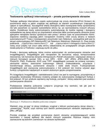 Autor: Łukasz Złocki Testowanie aplikacji internetowych – proste porównywanie obrazów Testując aplikacje internetowe często wykorzystuje się zrzuty ekranów (Print Screen) do porównania stanu w jakim znajduje się aplikacja ze stanem oczekiwanym (najczęściej ujętym w specyfikacji). Szczególnie wtedy stosujemy takie rozwiązanie kiedy sprawdzamy nie tyle zawartość co sposób wyświetlania strony np. po wprowadzeniu nowych arkuszy stylów. Dodatkowo kiedy wykorzystujemy automatyzację do testów regresji i testujemy wyświetlanie się danej strony po poprawkach wówczas takie porównywanie obrazów przez specjalne narzędzie bardzo upraszcza nam pracę i skraca czas na poszukiwanie różnic. Zapewne niektórzy zapytają jakim narzędziem możemy robić zrzuty ekranu w testach automatycznych? Tutaj z rozwiązaniem przychodzi nam Selenium, szczególnie jeśli jest to skrypt wykorzystujący API SeleniumRC lub Selenium Webdriver (Selenium 2). Dwa proste polecenia „captureScreenschot()” lub „captureEntirePageScreenschot()” robią zrzut pulpitu lub zrzut całej strony załadowanej do przeglądarki (drugie polecenie działa jedynie w Firefoxie) i zapisują wynik do pliku. Prostą i darmową aplikacją, którą można wykorzystać do porównywania obrazów jest ImageMagick[1]. ImageMagick jest narzędziem do tworzenia, edycji, komponowania (tworzenia), lub konwersji obrazów bitmapowych. Potrafi odczytywać i zapisywać obrazy w różnych formatach (ponad 100), w tym DPX , EXR , GIF, JPEG, JPEG-2000, PDF, PhotoCD, PNG, Postscript, SVG oraz TIFF. ImageMagick pozwala na zmianę rozmiaru, obrócenie obrazu, stworzenie lustrzanego odbicia, zniekształcenia, przycięcia i transformacje obrazu, porównanie obrazów i wiele wiele innych. Funkcjonalność ImageMagick jest zazwyczaj wykorzystywana z linii poleceń lub można używać jego funkcji z programów napisanych w swoim ulubionym języku programowania. Po ściągnięciu ImageMagick i zainstalowaniu (choć nie jest to wymagane, przynajmniej w przypadku środowiska Windows) możemy przejść do wykonywania dostępnych funkcji z linii poleceń. W tym artykule zajmiemy się funkcją „compare”, której zadaniem jest analiza i porównywanie obrazów. Podstawowa składnia polecenia compare przyjmuje trzy wartości, tak jak jest to przedstawione na poniższym obrazku Ilustracja 1: Podstawowa składnia polecenia compare Wartość „img_src.jpg” to obraz źródłowy, oryginał z którym porównujemy obraz obecny „present.jpg”. Wynik, czyli różnicę tych dwóch porównywanych obrazów zapisujemy do pliku „diff.jpg”. Poniżej znajduje się przykład porównania dwóch obrazów przedstawiających widok barometru z naszej aplikacji dla dwóch różnych pojazdów. Różnice między nimi zaznaczone są kolorem czerwonym na obrazie wynikowym. 1/4 Autor: Łukasz Złocki Ilustracja 2: Pojazd numer 1 Ilustracja 3: Pojazd numer 2 Ilustracja 4: Różnice między dwoma obrazami Jak widać na powyższym przykładzie różnice zaznaczone są kolorem czerwonym co pozwala w prosty i szybki sposób znaleźć elementy różniące się. Tych różnic w tym przypadku nie ma zbyt wiele, ograniczają się jedynie do niewielkich zmian w treści strony. Spróbujmy zatem z innym przykładem, gdzie różnice w obrazie dotyczą już samej grafiki. Grafikę do przykładu zaczerpnąłem ze strony źródłowej projektu gdyż jest prosta i czytelna i świetnie odzwierciedla właściwości funkcji compare. 2/4 Autor: Łukasz Złocki Ilustracja 6: img1.gif Ilustracja 5: img2.gif Powyższe obrazki to dwa slajdy z animacji. Porównajmy je teraz za pomocą funkcji compare wydając polecenie comapre img1.gif img2.gif diff.gif w rezultacie otrzymamy poniższy obraz, który dosadnie pokazuje różnice Ilustracja 7: Porównanie obrazów img1.gif i img2.gif Funkcja compare posiada wiele dodatkowych parametrów, które w mniejszym bądź większym stopniu mogą przydać się w procesie porównywania obrazów, dodatkowo parametry te można ze sobą łączyć w jednym zapytaniu. Poniżej przedstawię kilka przykładów kombinacji parametrów, które możemy zastosować w tym pleceniu. Zmieńmy zatem kolor pokazywanych różnic z czerwonego na czarny compare img1.gif img2.gif -highlight-color Black diff.gif Jeśli nie chcemy mieć „cienia” drugiego obrazka wówczas zastosujemy parametr „-compose Src” compare img1.gif img2.gif -compose Src diff.gif 3/4 Autor: Łukasz Złocki Aby wygenerować maskę w skali szarości zmienionych pikseli zastosujemy polecenie z trzema parametrami compare img1.gif img2.gif -compose Src -highlight-color White -lowlight-color Black diff.gif Jak widać możliwości porównywania obrazów za pomocą ImageMagick są bardzo duże. W artykule ograniczyłem się jedynie do prostych poleceń ale dzięki dużej liczbie parametrów tej funkcji każdy będzie mógł dopasować swój wynikowy obraz do swoich potrzeb. Osoby zainteresowane tymi parametrami odsyłam na stronę http://www.imagemagick.org/script/compare.php#options, gdzie są one wyszczególnione. Ogromną zaletą tego programu jest niewątpliwie fakt, że jest on udostępniany za darmo jako wolne oprogramowanie zarówno jako binarna dystrybucja gotowa do uruchomienia lub jako źródło, które można w dowolny sposób kopiować i modyfikować. [1] - http://www.imagemagick.org 4/4