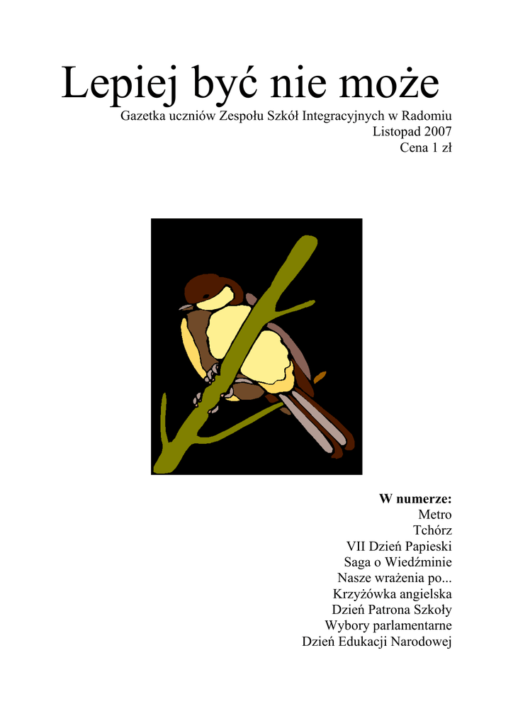 Lepiej być nie moŜe Gazetka uczniów Zespołu Szkół Integracyjnych w Radomiu Listopad 2007 Cena 1 zł W numerze: Metro Tchórz VII Dzień Papieski Saga o Wiedźminie Nasze wraŜenia po... KrzyŜówka angielska Dzień Patrona Szkoły Wybory parlamentarne Dzień Edukacji Narodowej Od redakcji 2 Opiekunki sekcji redakcyjnej: Anna Gralec Agnieszka Iwańska Renata Jesionek Autorzy artykułów: Jakub Gumiński Paulina Gregorczyk Andrzej Kowalski Tymon Markiewicz Kamila Niziołek Oliwia Pasik Filip Sobkiewicz Karolina Sperczyńska Alina Szewczyk Justyna Szewczyk Anna Zagajewska ...Listopad to miesiąc zadumy i przemyśleń... To początek słoty, zimna i pierwszych opadów śniegu... Ale takŜe miesiąc w którym toczy się zwykłe Ŝycie i nie moŜe zabraknąć w nim kolejnego wydania naszej szkolnej gazetki. Przeczytacie w niej relacje z przebiegu wielu imprez: wyjazdu na pielgrzymkę do Częstochowy, Dnia Edukacji Narodowej i obchodów Dnia Patrona szkoły. Przedstawiamy takŜe organizację VII Dnia Papieskiego i sprawozdanie ze zbiórki z udziałem naszych wolontariuszy. W tym miesiącu przeczytacie równieŜ o wynikach wyborów parlamentarnych w naszym kraju. Nie zabraknie takŜe odrobiny rozrywki i relaksu przy ciekawej ksiąŜce, angielskiej krzyŜówce a nawet podczas przedstawienia teatralnego . śyczymy przyjemnej lektury. Redakcja Adres redakcji: ul: Wierzbicka 81/83 26-600 Radom RozwaŜania 3 NASZE WRAśENIA PO ...... W październiku tego roku odbyła się pielgrzymka Rodziny Szkół im. Jana Pawła II do Częstochowy. Było nas około 20 tysięcy. To wielki potencjał młodości, siły i zapału. RównieŜ wielu uczniów naszej szkoły wzięło udział w tym spotkaniu młodzieŜy. Na początku odbyła się piękna, uroczysta Msza Święta na Błoniach na Jasnej Górze. Atmosfera była podniosła, gdyŜ staliśmy wśród wielu pielgrzymów, naszych rówieśników z całej Polski. Niestety, to waŜne spotkanie przerywali uczniowie, którzy nie potrafili się zachować podczas tak uroczystej chwili. Wśród nas znalazły się osoby, które rozmawiały i śmiały się, jadły albo leŜały. Chrześcijanie zdecydowanie inaczej zachowują się podczas Eucharystii. Mimo tych wszystkich przeszkód udało mi się wysłuchać kazania, które było bardzo ciekawe. Biskup mówił o naszym patronie Janie Pawle II, o jego dobroci i o tym, jak bardzo kochał młodych ludzi. Eucharystia była naprawdę wspaniała. Pod klasztorem stał tłum młodych ludzi, którzy cieszyli się tą chwilą. Wielu z nas czuło się zjednoczonych ze sobą postacią Jana Pawła II. Niektórzy pogrąŜyli się w zadumie nad słowami naszego duszpasterza -Księdza Biskupa Zygmunta Zimowskiego. To spotkanie przed obrazem Matki BoŜej zapadło w naszych sercach na zawsze. Po mszy mieliśmy czas wolny, który większość spędzała na zakupieniu pamiątek i zjedzeniu obiadu. Następnie, pełni sił i wielkiego zapału, wróciliśmy do Radomia. Kamila Niziołek Wywiad 4 „TCHÓRZ” 12 października mieliśmy moŜliwość zobaczenia spektaklu pt. „Tchórz”. Jego organizatorem była pani Beata Jackowska – nasz szkolny pedagog. Przedstawienie to miało uświadomić nam – gimnazjalistom, jak groźne jest branie i sprzedawanie narkotyków. Na temat tego spektaklu postanowiłyśmy porozmawiać z panią Jackowską. Uczennice: Skąd wziął się pomysł na zorganizowanie w naszej szkole spektaklu pt. „Tchórz”? Beata Jackowska: Według przeprowadzonych badań od kilku lat stale rośnie liczba osób uzaleŜnionych od substancji psychoaktywnych. Niestety, w grupie osób biorących uŜywki jest coraz więcej młodzieŜy i dzieci, dlatego tylko szeroko rozumiana profilaktyka moŜe ograniczyć rozprowadzanie narkotyków. W naszej szkole podejmowane są działania w tym kierunku w róŜnej formie, np. dyskusje, spotkania z psychologiem itd. TakŜe spektakl „Tchórz” jest kontynuowaniem naszych oddziaływań profilaktycznych. U.: Dlaczego uświadomienie młodzieŜy, czym są nałogi, odgrywa bardzo waŜną role w kształtowaniu jej osobowości? B. J.: UŜywki są wszędzie i łatwo dostępne dla młodzieŜy. Moim zdaniem naleŜy uświadamiać uczniów, czym one są oraz jakie są konsekwencje ich brania. Przede wszystkim trzeba uczyć młodzieŜ poŜądanych zachowań w sytuacjach trudnych lub konfliktowych. Nie ma prostych i skutecznych metod na to jak uchronić młodych ludzi przed uŜywkami, ale jedno jest pewne, Ŝe jeśli będziemy rozmawiać na te tematy, to zmniejszymy ryzyko i łatwiej ustrzeŜemy młodzieŜy przed uŜywkami. U.: Nam przedstawienie bardzo się podobało. Według pani jego przesłanie pomogło młodzieŜy w zrozumieniu zła związanego z uŜywaniem narkotyków? B. J.: Według mnie spektakl „Tchórz” oraz dyskusja spełniła zamierzone przesłanie. Przedstawienie pogłębiło waszą wiedzę na temat szkodliwości uŜywek, pomogło dokonywać właściwych wyborów oraz uświadomiło konieczność odpowiedzialności za swoje zachowania. Nauczyło was, jak w sytuacjach trudnych umieć bez strachu powiedzieć: NIE, NIE BIORE ! NIE, DZIEKUJE! U.: Czy w najbliŜszej przyszłości planowane są podobne inscenizacje bądź inne formy uświadomienia gimnazjalistów w dziedzinie uzaleŜnień? B. J.: Oczywiście, w najbliŜszym czasie planowane są spektakle dla waszych młodszych kolegów. Dla klas od IV do VI spektakl o podobnej tematyce, a dla klas 0 do 3 spektakl z zakresu przestrzegania norm i reguł, współistnienia w społeczności oraz „uczulenie” na zjawisko agresji i przemocy. Chciałam przypomnieć, Ŝe od września w klasach od V do VI oraz II i III gimnazjum prowadzone są warsztaty przez wychowawców z zakresu profilaktyki uzaleŜnień „Narkotyki albo Ŝycie”. Jest to kolejna forma działań profilaktycznych mających na celu pomoc młodzieŜy w dokonaniu właściwego wyboru: BYĆ CZY BRAĆ?? U.: Bardzo dziękujemy za rozmowę. Oliwia Pasik Anna Zagajewska Aktualności DZIEŃ 