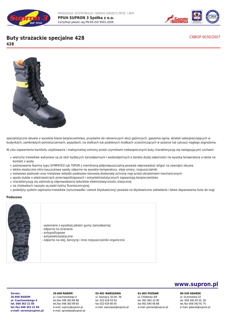 PRODUKCJA, DYSTRYBUCJA I SERWIS SPRZĘTU PPOŻ. I BHP PPUH SUPRON 3 Spółka z o.o. Certyfikat jakości wg PN-EN ISO 9001:2009 CNBOP 0030/2007 Buty strażackie specjalne 428 428 specjalistyczne obuwie o wysokiej klasie bezpieczeństwa, przydatne do ratowniczych akcji gaśniczych, gaszenia ognia, działań zabezpieczających w budynkach, zamkniętych pomieszczeniach, pojazdach, na statkach lub podobnych środkach uczestniczących w pożarze lub sytuacji nagłego zagrożenia. W celu zapewnienia komfortu użytkowania i maksymalnej ochrony przed czynnikami niebezpiecznymi buty charakteryzują się następującymi cechami: ● ● ● ● ● ● ● ● wierzchy trzewików wykonane są ze skór bydlęcych żaroodpornych i wodoodpornych o bardzo dużej odporności na wysoką temperaturę a także na kontakt z wodą zastosowanie tkaniny typu SYMPATEX lub TEPOR z membraną półprzepuszczalną pozwala odprowadzać wilgoć na zewnątrz obuwia lekkie elastyczne nitro kauczukowe spody odporne na wysokie temperatury, oleje smary, rozpuszczalniki metalowe podnoski oraz metalowe wkładki podeszew stanowią doskonałą ochronę nogi przed obrażeniami mechanicznymi spody butów o właściwościach przeciwpoślizgowych i antyelektrostatycznych zapewniają bezpieczeństwo charakteryzują się zdolnością odprowadzania ładunków elektrostatyczności statycznej na cholewkach naszyte są paski taśmy fluorescencyjnej podwójny system zapinania trzewików (sznurowadła i zamek błyskawiczny) pozwala na błyskawiczne zakładanie i łatwe dopasowanie buta do nogi Podeszwa - wykonane z wysokiej jakości gumy żaroodpornej - odporne na ścieranie - antypoślizgowe - antyelektrostatyczne - odporne na olej, benzynę i inne rozpuszczalniki organiczne www.supron.pl Serwis: 26-600 RADOM ul. Czachowskiego 4 tel. 048 363 21 85 tel./fax 048 363 21 86 e-mail: [email protected] 26-600 RADOM ul. Czachowskiego 4 tel./fax 048 363 89 98 tel./fax 048 363 99 65 e-mail: [email protected] e-mail: [email protected] 03-481 WARSZAWA ul. Szanajcy 16 lok. 56 tel. 022 618 93 63 fax 022 619 80 05 e-mail: [email protected] 61-003 POZNAŃ ul. Chlebowa 4/8 tel. 061 842 23 00 fax 061 840 06 88 e-mail: [email protected] 80-530 GDAŃSK ul. Uczniowska 52 tel. 058 340 03 55, 56 tel./fax 058 342 91 75 e-mail: [email protected] PRODUKCJA, DYSTRYBUCJA I SERWIS SPRZĘTU PPOŻ. I BHP PPUH SUPRON 3 Spółka z o.o. Certyfikat jakości wg PN-EN ISO 9001:2009 wierzchy: naturalna skóra bydlęca żaro- i wodoodporna (skóra nie pali się i nie żarzy) podszewki: tkanina typu SYMPATEX lub TEPOR z membraną paroprzepuszczalną i wodoodporną F2A: obuwie dla strażaków, typu 2 z podnoskami stalowymi odpornymi na uderzenie z energią 200J i z ochroną przed przekłuciem z siłą 1100N, posiadające właściwości antyelektrostatyczne HI3: trzeci poziom odporności termicznej podwójny system zapinania: sznurowadła zamek błyskawiczny spody: gumowe, żaroodporne, olejoodporne system montażu: klejony konstrukcja: typ C rozmiar: 36 :– 50 (numeracja francuska) kolor: czarny www.supron.pl Serwis: 26-600 RADOM ul. Czachowskiego 4 tel. 048 363 21 85 tel./fax 048 363 21 86 e-mail: [email protected] 26-600 RADOM ul. Czachowskiego 4 tel./fax 048 363 89 98 tel./fax 048 363 99 65 e-mail: [email protected] e-mail: [email protected] 03-481 WARSZAWA ul. Szanajcy 16 lok. 56 tel. 022 618 93 63 fax 022 619 80 05 e-mail: [email protected] 61-003 POZNAŃ ul. Chlebowa 4/8 tel. 061 842 23 00 fax 061 840 06 88 e-mail: [email protected] 80-530 GDAŃSK ul. Uczniowska 52 tel. 058 340 03 55, 56 tel./fax 058 342 91 75 e-mail: [email protected]