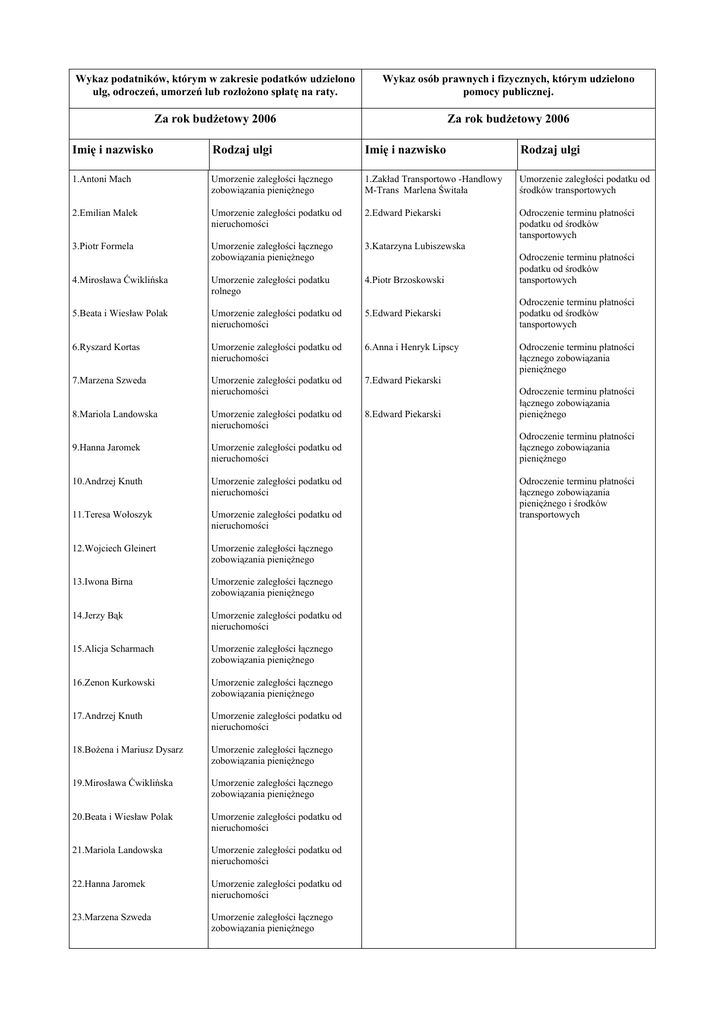 Wykaz podatników, którym w zakresie podatków udzielono ulg, odroczeń, umorzeń lub rozłożono spłatę na raty. Wykaz osób prawnych i fizycznych, którym udzielono pomocy publicznej. Za rok budżetowy 2006 Za rok budżetowy 2006 Imię i nazwisko Rodzaj ulgi Imię i nazwisko Rodzaj ulgi 1.Antoni Mach Umorzenie zaległości łącznego zobowiązania pieniężnego 1.Zakład Transportowo -Handlowy M-Trans Marlena Świtała Umorzenie zaległości podatku od środków transportowych 2.Emilian Malek Umorzenie zaległości podatku od nieruchomości 2.Edward Piekarski Odroczenie terminu płatności podatku od środków tansportowych 3.Piotr Formela Umorzenie zaległości łącznego zobowiązania pieniężnego 3.Katarzyna Lubiszewska 4.Mirosława Ćwiklińska Umorzenie zaległości podatku rolnego 4.Piotr Brzoskowski 5.Beata i Wiesław Polak Umorzenie zaległości podatku od nieruchomości 5.Edward Piekarski 6.Ryszard Kortas Umorzenie zaległości podatku od nieruchomości 6.Anna i Henryk Lipscy 7.Marzena Szweda Umorzenie zaległości podatku od nieruchomości 7.Edward Piekarski 8.Mariola Landowska Umorzenie zaległości podatku od nieruchomości 8.Edward Piekarski 9.Hanna Jaromek Umorzenie zaległości podatku od nieruchomości 10.Andrzej Knuth Umorzenie zaległości podatku od nieruchomości 11.Teresa Wołoszyk Umorzenie zaległości podatku od nieruchomości 12.Wojciech Gleinert Umorzenie zaległości łącznego zobowiązania pieniężnego 13.Iwona Birna Umorzenie zaległości łącznego zobowiązania pieniężnego 14.Jerzy Bąk Umorzenie zaległości podatku od nieruchomości 15.Alicja Scharmach Umorzenie zaległości łącznego zobowiązania pieniężnego 16.Zenon Kurkowski Umorzenie zaległości łącznego zobowiązania pieniężnego 17.Andrzej Knuth Umorzenie zaległości podatku od nieruchomości 18.Bożena i Mariusz Dysarz Umorzenie zaległości łącznego zobowiązania pieniężnego 19.Mirosława Ćwiklińska Umorzenie zaległości łącznego zobowiązania pieniężnego 20.Beata i Wiesław Polak Umorzenie zaległości podatku od nieruchomości 21.Mariola Landowska Umorzenie zaległości podatku od nieruchomości 22.Hanna Jaromek Umorzenie zaległości podatku od nieruchomości 23.Marzena Szweda Umorzenie zaległości łącznego zobowiązania pieniężnego Odroczenie terminu płatności podatku od środków tansportowych Odroczenie terminu płatności podatku od środków tansportowych Odroczenie terminu płatności łącznego zobowiązania pieniężnego Odroczenie terminu płatności łącznego zobowiązania pieniężnego Odroczenie terminu płatności łącznego zobowiązania pieniężnego Odroczenie terminu płatności łącznego zobowiązania pieniężnego i środków transportowych Wykaz podatników, którym w zakresie podatków udzielono ulg, odroczeń, umorzeń lub rozłożono spłatę na raty. Wykaz osób prawnych i fizycznych, którym udzielono pomocy publicznej. Za rok budżetowy 2006 Za rok budżetowy 2006 Imię i nazwisko Rodzaj ulgi 24.Hanna Mathiassen Umorzenie zaległości łącznego zobowiązania pieniężnego 25.Emilian Malek Umorzenie zaległości łącznego zobowiązania pieniężnego 26.Maria Szulist Umorzenie zaległości podatku od nieruchomości 27.Teresa Wołoszyk Umorzenie zaległości podatku od nieruchomości 28.Alicja Scharmach Umorzenie zaległości podatku od nieruchomości 29.Benon Kmiotek Umorzenie zaległości łącznego zobowiązania pieniężnego 30.Krzysztof Knuth Umorzenie zaległości łącznego zobowiązania pieniężnego 31.Wiesława Groth Umorzenie zaległości podatku od nieruchomości 32.Wojciech Gleinert Umorzenie zaległości łącznego zobowiązania pieniężnego 33.Jerzy Piankowski Umorzenie zaległości łącznego zobowiązania pieniężnego 34.Zdzisław Burczyk Umorzenie zaległości łącznego zobowiązania pieniężnego 35.Lucyna Mokwa Umorzenie zaległości podatku od nieruchomości 36.Bożena Dysarz Umorzenie zaległości łącznego zobowiązania pieniężnego 37.Mirosława Ćwiklińska Umorzenie zaległości łącznego zobowiązania pieniężnego 38.Andrzej Knuth Umorzenie zaległości podatku od nieruchomości 39.Wiesław Polak Umorzenie zaległości podatku od nieruchomości 40.Danuta Błaszkowska Umorzenie zaległości podatku od nieruchomości 41Iwona Birna Umorzenie zaległości łącznego zobowiązania pieniężnego 42.Teresa Wołoszyk Umorzenie zaległości podatku od nieruchomości 43.Hanna Jaromek Umorzenie zaległości podatku od nieruchomości 44.Edmund Lizakowski Umorzenie zaległości podatku od nieruchomości 45.Janina Kozłowska Umorzenie zaległości podatku od nieruchomości 46.Leszek Dzienisz Umorzenie zaległości łącznego zobowiązania pieniężnego Imię i nazwisko Rodzaj ulgi Wykaz podatników, którym w zakresie podatków udzielono ulg, odroczeń, umorzeń lub rozłożono spłatę na raty. Wykaz osób prawnych i fizycznych, którym udzielono pomocy publicznej. Za rok budżetowy 2006 Za rok budżetowy 2006 Imię i nazwisko Rodzaj ulgi 47.Ryszard Kortas Umorzenie zaległości łącznego zobowiązania pieniężnego 48.Marek Leszczyński Umorzenie zaległości łącznego zobowiązania pieniężnego 49.Mirosława Ćwiklińska Umorzenie zaległości łącznego zobowiązania pieniężnego 50.Jan Piekarski Umorzenie zaległości podatku od nieruchomości 51.Mariola Landowska Umorzenie zaległości podatku od nieruchomości 52.Zdzisław Burczyk Umorzenie zaległości łącznego zobowiązania pieniężnego 53.Mirosława Krawczyk Umorzenie zaległości podatku od nieruchomości 54.Barbara Słomińska Umorzenie zaległości podatku od nieruchomości 55.Marzena Szweda Umorzenie zaległości łącznego zobowiązania pieniężnego 56.Roman Turzyński Umorzenie zaległości łącznego zobowiązania pieniężnego 57.Jarosław Błaszkowski Umorzenie zaległości łącznego zobowiązania pieniężnego 58.Aniceta Troka Umorzenie zaległości łącznego zobowiązania pieniężnego 59.Iwona Klinger-Niemczyk Umorzenie zaległoś