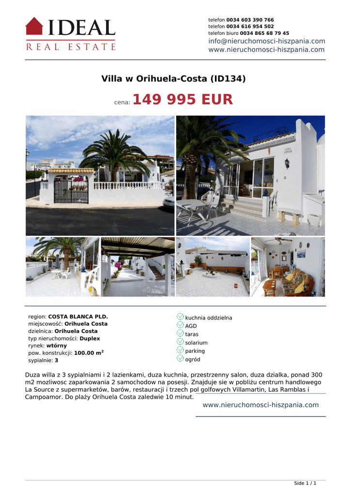 telefon 0034 603 390 766 telefon 0034 616 954 502 telefon biuro 0034 865 68 79 45 [email protected] www.nieruchomosci-hiszpania.com Villa w Orihuela-Costa (ID134) cena: region: COSTA BLANCA PLD. miejscowość: Orihuela Costa dzielnica: Orihuela Costa typ nieruchomości: Duplex rynek: wtórny pow. konstrukcji: 100.00 m2 sypialnie: 3 149 995 EUR kuchnia oddzielna AGD taras solarium parking ogród Duza willa z 3 sypialniami i 2 lazienkami, duza kuchnia, przestrzenny salon, duza dzialka, ponad 300 m2 mozliwosc zaparkowania 2 samochodow na posesji. Znajduje sie w pobliżu centrum handlowego La Source z supermarketów, barów, restauracji i trzech pol golfowych Villamartin, Las Ramblas i Campoamor. Do plaży Orihuela Costa zaledwie 10 minut. www.nieruchomosci-hiszpania.com Side 1 / 1 Powered by TCPDF (www.tcpdf.org)