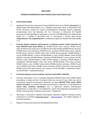 REGULAMIN PROMOCJI EKSPRESÓW DO KAWY NESCAFÉ DOLCE GUSTO KRUPS 2013 1. Postanowienia ogólne Organizatorami promocji ekspresów do kawy NESCAFÉ Dolce Gusto KRUPS („Promocja”) są: spółka Groupe SEB Polska Spółka z o.o. z siedzibą w Warszawie, adres: ul. Bukowińska 22B, 02-703 Warszawa, wpisana do rejestru przedsiębiorców Krajowego Rejestru Sądowego prowadzonego przez Sąd Rejonowy dla m.st. Warszawy w Warszawie XIII Wydział Gospodarczy Krajowego Rejestru Sądowego za numerem KRS 0000103545 oraz spółka Nestle Polska S.A. z siedzibą w Warszawie przy ul. Szturmowej 2 (zwane dalej łącznie „Organizatorem” lub „Organizatorami”). Fundatorem nagród jest Groupe SEB Polska Spółka z o.o. Promocja dotyczy wyłącznie wymienionych w niniejszym punkcie modeli ekspresów do kawy NESCAFÉ Dolce Gusto KRUPS, tj.: KP1000 Piccolo czarny matowy; KP1002 Piccolo biały; KP1003 Piccolo Prada (serca); KP1005 Piccolo Prada (kropki); KP1006 Piccolo czerwony; KP1008 Piccolo Custo Barcelona; KP1009 Piccolo tytanowy; KP1500 Genio czarny matowy; KP1506 Genio czerwony; KP1502 Genio biały, KP1509 Genio tytanowy; KP2000 Melody 1 czarny; KP2005 Melody 1 srebrny; KP2100 Melody 2 czarny; KP2102 Melody 2 biały; KP2106 Melody 2 czerwony; KP2109 Melody 2 tytanowy; KP2208 Melody 3 czarny matowy; KP2201 Melody 3 biały; KP2203 Melody 3 EURO; KP2205 Melody 3 czerwony; KP2209 Melody 3 czekoladowy; KP2308 Melody 3 flow stop czarny; KP2305 Melody 3 flow stop czerwony; KP2600 Creativa szary; KP3002 Fontana biała; KP3006 Fontana czerwona; KP5000 Circolo szary; KP5002 Circolo biały; KP5006 Circolo czerwony; KP510T Circolo flow stop tytanowy; KP5105 Circolo flow stop czerwony, oraz zestawy: Set 451 (KP2208 +4 opakowania kawy) i Set 452 (KP2205 + 4 opakowania kawy). Z Promocji wyłączone są inne produkty i akcesoria marki KRUPS i NESCAFÉ. Promocja wskazanych w pkt 1.2 powyżej ekspresów NESCAFÉ Dolce Gusto KRUPS będzie prowadzona w okresie od dnia 15 kwietnia 2013 roku do dnia 15 lipca 2013 roku lub do wyczerpania zapasów promocyjnych ekspresów do kawy NESCAFÉ Dolce Gusto KRUPS („Okres Promocji”), w punktach sprzedaży wymienionych w Załączniku nr 1 do Regulaminu (zwane dalej „Punktami Sprzedaży”) oraz w wybranych sklepach internetowych wymienionych w Załączniku nr 2 do Regulaminu. Łączna ilość ekspresów promocyjnych to: 20 000 sztuk ekspresów, o których mowa w pkt 1.2. Regulaminu. Informacja o wyczerpaniu zapasów promocyjnych ekspresów objętych Promocją zostanie umieszczona na stronach www.krups.com.pl i www.nescafe.pl oraz będzie dostępna w Punktach Sprzedaży. Miejscem Promocji jest terytorium Rzeczypospolitej Polskiej. 1 Czynności związane z przeprowadzeniem Promocji, wykonuje firma Cursor Spółka akcyjna z siedzibą w Warszawie, adres: ul. Poleczki 23, 02-822 Warszawa, wpisana do rejestru przedsiębiorców Krajowego Rejestru Sądowego prowadzonego przez Sąd Rejonowy dla m.st. Warszawy w Warszawie XIII Wydział Gospodarczy Krajowego Rejestru Sądowego za numerem KRS 0000338509, działająca w imieniu i na rzecz Organizatorów (zwana dalej „Agencją”). 2. Zasady udziału w Promocji Uczestnikami Promocji mogą być wyłącznie pełnoletnie osoby fizyczne, zamieszkałe na terytorium Rzeczypospolitej Polskiej, posiadające pełną zdolność do czynności prawnych oraz dokonujące zakupu produktu objętego Promocją jako osoba fizyczna, a nie jako przedsiębiorca w rozumieniu art. 4 Ustawy o swobodzie działalności gospodarczej („Uczestnik”). Uczestnictwo w Promocji jest dobrowolne. Każdy Uczestnik może wziąć udział w Promocji wielokrotnie, spełniając wszystkie warunki konieczne uczestnictwa w Promocji. 2.4. Uczestnictwo w Promocji nie wyłącza możliwość brania udziału w innych promocjach organizowanych przez Organizatora w Okresie Promocji dotyczących ekspresów do kawy NESCAFÉ Dolce Gusto KRUPS. 2.5. Warunkiem koniecznym udziału w Promocji jest zakup przez Uczestnika w sprzedaży detalicznej, tj. w sklepach wskazanych w Załączniku nr 1 lub Załączniku nr 2 do Regulaminu, w Okresie Promocji jednego z następujących modeli ekspresów do kawy NESCAFÉ Dolce Gusto KRUPS tj.: KP1000 Piccolo czarny matowy; KP1002 Piccolo biały; KP1003 Piccolo Prada (serca); KP1005 Piccolo Prada (kropki); KP1006 Piccolo czerwony; KP1008 Piccolo Custo Barcelona; KP1009 Piccolo tytanowy; KP1500 Genio czarny matowy; KP1506 Genio czerwony; KP1502 Genio biały, KP1509 Genio tytanowy; KP2000 Melody 1 czarny; KP2005 Melody 1 srebrny; KP2100 Melody 2 czarny; KP2102 Melody 2 biały; KP2106 Melody 2 czerwony; KP2109 Melody 2 tytanowy; KP2208 Melody 3 czarny matowy; KP2201 Melody 3 biały; KP2203 Melody 3 EURO; KP2205 Melody 3 czerwony; KP2209 Melody 3 czekoladowy; KP2308 Melody 3 flow stop czarny; KP2305 Melody 3 flow stop czerwony; KP2600 Creativa szary; KP3002 Fontana biała; KP3006 Fontana czerwona; KP5000 Circolo szary; KP5002 Circolo biały; KP5006 Circolo czerwony; KP510T Circolo flow stop tytanowy; KP5105 Circolo flow stop czerwony, oraz zestawy: Set 451 (KP2208 +4 opakowania kawy) i Set 452 (KP2205 + 4 opakowania kawy). 2.6. Uczestnik Promocji, który w Okresie Promocji kupi ekspres NESCAFÉ Dolce Gusto KRUPS objęty Promocją może uzyskać rabat w wysokości 100 zł brutto w momencie zakupu ekspresu zgodnie z pkt. 2.5. powyżej przy kasie, bez względu na zakupiony model ekspresu NESCAFÉ Dolce Gusto KRUPS. 2.7. Organizator Promocji zastrzega, że kwota 100 zł brutto nie podlega zamianie na inne nagrody rzeczowe lub pieniężne. 2 3. Postępowanie reklamacyjne 3.1. Reklamacje dotyczące przebiegu Promocji mogą być zgłaszane wyłącznie na piśmie na adres agencji reklamowej Cursor Spółka akcyjna z siedzibą w Warszawie, adres: Cursor S.A. Skrytka pocztowa 160 02-303 Warszawa 79, z dopiskiem na kopercie NESCAFÉ Dolce Gusto KRUPS. Koszty wysłania listu pokrywa Uczestnik. 3.2. Prawo złożenia reklamacji przysługuje jedynie Uczestnikowi Promocji prz