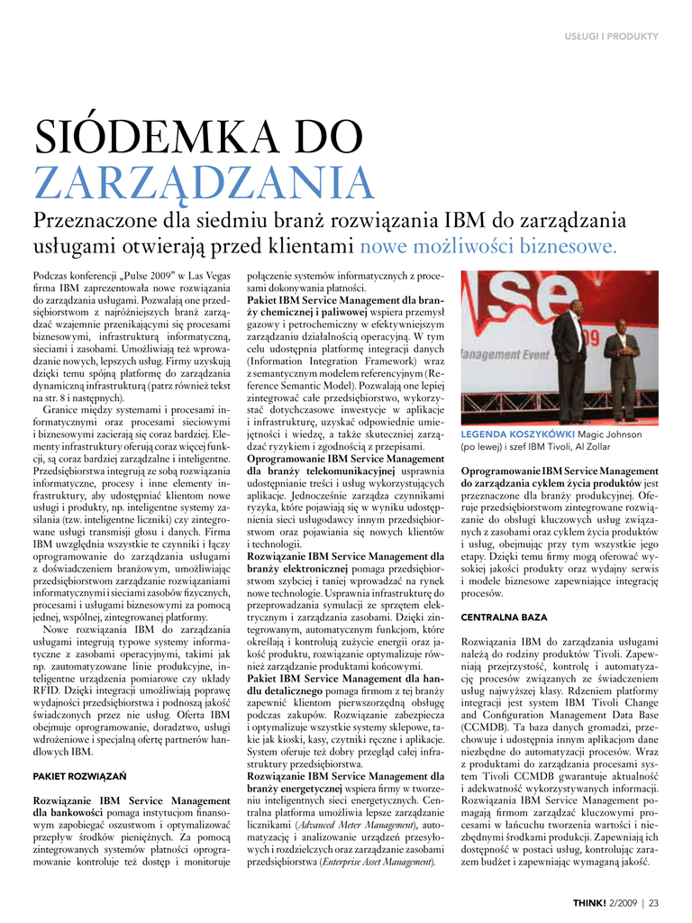 usŁugi i produkty Siódemka do zarządzania Przeznaczone dla siedmiu branż rozwiązania IBM do zarządzania usługami otwierają przed klientami nowe możliwości biznesowe. Podczas konferencji „Pulse 2009” w Las Vegas firma IBM zaprezentowała nowe rozwiązania do zarządzania usługami. Pozwalają one przedsiębiorstwom z najróżniejszych branż zarządzać wzajemnie przenikającymi się procesami biznesowymi, infrastrukturą informatyczną, sieciami i zasobami. Umożliwiają też wprowadzanie nowych, lepszych usług. Firmy uzyskują dzięki temu spójną platformę do zarządzania dynamiczną infrastrukturą (patrz również tekst na str. 8 i następnych). Granice między systemami i procesami informatycznymi oraz procesami sieciowymi i biznesowymi zacierają się coraz bardziej. Elementy infrastruktury oferują coraz więcej funkcji, są coraz bardziej zarządzalne i inteligentne. Przedsiębiorstwa integrują ze sobą rozwiązania informatyczne, procesy i inne elementy infrastruktury, aby udostępniać klientom nowe usługi i produkty, np. inteligentne systemy zasilania (tzw. inteligentne liczniki) czy zintegrowane usługi transmisji głosu i danych. Firma IBM uwzględnia wszystkie te czynniki i łączy oprogramowanie do zarządzania usługami z doświadczeniem branżowym, umożliwiając przedsiębiorstwom zarządzanie rozwiązaniami informatycznymi i sieciami zasobów fizycznych, procesami i usługami biznesowymi za pomocą jednej, wspólnej, zintegrowanej platformy. Nowe rozwiązania IBM do zarządzania usługami integrują typowe systemy informatyczne z zasobami operacyjnymi, takimi jak np. zautomatyzowane linie produkcyjne, inteligentne urządzenia pomiarowe czy układy RFID. Dzięki integracji umożliwiają poprawę wydajności przedsiębiorstwa i podnoszą jakość świadczonych przez nie usług. Oferta IBM obejmuje oprogramowanie, doradztwo, usługi wdrożeniowe i specjalną ofertę partnerów handlowych IBM. Pakiet rozwiązań Rozwiązanie IBM Service Management dla bankowości pomaga instytucjom finansowym zapobiegać oszustwom i optymalizować przepływ środków pieniężnych. Za pomocą zintegrowanych systemów płatności oprogramowanie kontroluje też dostęp i monitoruje połączenie systemów informatycznych z procesami dokonywania płatności. Pakiet IBM Service Management dla branży chemicznej i paliwowej wspiera przemysł gazowy i petrochemiczny w efektywniejszym zarządzaniu działalnością operacyjną. W tym celu udostępnia platformę integracji danych (Information Integration Framework) wraz z semantycznym modelem referencyjnym (Reference Semantic Model). Pozwalają one lepiej zintegrować całe przedsiębiorstwo, wykorzystać dotychczasowe inwestycje w aplikacje i infrastrukturę, uzyskać odpowiednie umiejętności i wiedzę, a także skuteczniej zarządzać ryzykiem i zgodnością z przepisami. Oprogramowanie IBM Service Management dla branży telekomunikacyjnej usprawnia udostępnianie treści i usług wykorzystujących aplikacje. Jednocześnie zarządza czynnikami ryzyka, które pojawiają się w wyniku udostępnienia sieci usługodawcy innym przedsiębiorstwom oraz pojawiania się nowych klientów i technologii. Rozwiązanie IBM Service Management dla branży elektronicznej pomaga przedsiębiorstwom szybciej i taniej wprowadzać na rynek nowe technologie. Usprawnia infrastrukturę do przeprowadzania symulacji ze sprzętem elektrycznym i zarządzania zasobami. Dzięki zintegrowanym, automatycznym funkcjom, które określają i kontrolują zużycie energii oraz jakość produktu, rozwiązanie optymalizuje również zarządzanie produktami końcowymi. Pakiet IBM Service Management dla handlu detalicznego pomaga firmom z tej branży zapewnić klientom pierwszorzędną obsługę podczas zakupów. Rozwiązanie zabezpiecza i optymalizuje wszystkie systemy sklepowe, takie jak kioski, kasy, czytniki ręczne i aplikacje. System oferuje też dobry przegląd całej infrastruktury przedsiębiorstwa. Rozwiązanie IBM Service Management dla branży energetycznej wspiera firmy w tworzeniu inteligentnych sieci energetycznych. Centralna platforma umożliwia lepsze zarządzanie licznikami (Advanced Meter Management), automatyzację i analizowanie urządzeń przesyłowych i rozdzielczych oraz zarządzanie zasobami przedsiębiorstwa (Enterprise Asset Management). Legenda koszykówki Magic Johnson (po lewej) i szef IBM Tivoli, Al Zollar Oprogramowanie IBM Service Management do zarządzania cyklem życia produktów jest przeznaczone dla branży produkcyjnej. Oferuje przedsiębiorstwom zintegrowane rozwiązanie do obsługi kluczowych usług związanych z zasobami oraz cyklem życia produktów i usług, obejmując przy tym wszystkie jego etapy. Dzięki temu firmy mogą oferować wysokiej jakości produkty oraz wydajny serwis i modele biznesowe zapewniające integrację procesów. Centralna baza Rozwiązania IBM do zarządzania usługami należą do rodziny produktów Tivoli. Zapewniają przejrzystość, kontrolę i automatyzację procesów związanych ze świadczeniem usług najwyższej klasy. Rdzeniem platformy integracji jest system IBM Tivoli Change and Configuration Management Data Base (CCMDB). Ta baza danych gromadzi, przechowuje i udostępnia innym aplikacjom dane niezbędne do automatyzacji procesów. Wraz z produktami do zarządzania procesami system Tivoli CCMDB gwarantuje aktualność i adekwatność wykorzystywanych informacji. Rozwiązania IBM Service Management pomagają firmom zarządzać kluczowymi procesami w łańcuchu tworzenia wartości i niezbędnymi środkami produkcji. Zapewniają ich dostępność w postaci usług, kontrolując zarazem budżet i zapewniając wymaganą jakość. THINK! 2/2009 | 23