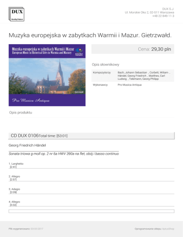 DUX S.J. Ul. Morskie Oko 2, 02-511 Warszawa +48 22 849 11 3 Muzyka europejska w zabytkach Warmii i Mazur. Gietrzwałd. Cena: 29,30 pln Opis słownikowy Kompozytorzy Bach, Johann Sebastian ∎, Corbett, Wiliam ∎, Händel, Georg Friedrich ∎, Matthes, Carl Ludwig ∎, Telemann, Georg Philipp ∎ Wykonawcy Pro Musica Antiqua ∎ Opis produktu CD DUX 0106Total time: [53:01] Georg Friedrich Händel Sonata triowa g-moll op. 2 nr 6a HWV 390a na flet, obój i basso continuo 1. Larghetto [2:41] 2. Allegro [2:57] 3. Adagio [2:09] 4. Allegro [3:32] Plik wygenerowano: 03-03-2017 Oprogramowanie sklepu: AptusShop DUX S.J. Ul. Morskie Oko 2, 02-511 Warszawa +48 22 849 11 3 Carl Ludwig Matthes Sonata C-dur na obój i basso continuo 5. Allegro [2:56] 6. Adagio [3:41] 7. Allegro [2:04] Johann Sebastian Bach Sonata G-dur BWV 1038 8. Largo [3:20] 9. Vivace [0:56] 10. Adagio [2:03] 11. Presto [1:29] Georg Friedrich Händel Sonata triowa F-dur op. 2 nr 5a HWV 390a na obój, fagot i basso continuo 12. Adagio [2:24] 13. Allegro [2:04] 14. Largo/Allegro Plik wygenerowano: 03-03-2017 Oprogramowanie sklepu: AptusShop DUX S.J. Ul. Morskie Oko 2, 02-511 Warszawa +48 22 849 11 3 [3:49] Wiliam Corbett Sonata triowa C-dur 15. Largo [1:01] 16. Presto [0:48] 17. Adagio [2:21] 18. Jigga [1:53] Georg Philipp Telemann Sonata triowa c-moll na flet, obój i basso continuo 19. Largo [2:49] 20. Vivace [2:33] 21. Andante [2:03] 22. Allegro [3:28] Wykonawcy: Pro Musica Antiqua Plik wygenerowano: 03-03-2017 Powered by TCPDF (www.tcpdf.org) Oprogramowanie sklepu: AptusShop
