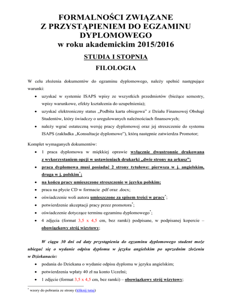 FORMALNOŚCI ZWIĄZANE Z PRZYSTĄPIENIEM DO EGZAMINU DYPLOMOWEGO w roku akademickim 2015/2016 STUDIA I STOPNIA FILOLOGIA W celu złożenia dokumentów do egzaminu dyplomowego, należy spełnić następujące warunki: uzyskać w systemie ISAPS wpisy ze wszystkich przedmiotów (bieżące semestry, wpisy warunkowe, efekty kształcenia do uzupełnienia); uzyskać elektroniczny status „Podbita karta obiegowa” z Działu Finansowej Obsługi Studentów, który świadczy o uregulowanych należnościach finansowych; należy wgrać ostateczną wersję pracy dyplomowej oraz jej streszczenie do systemu ISAPS (zakładka „Konsultacje dyplomowe”), którą następnie zatwierdza Promotor; Komplet wymaganych dokumentów: 1 praca dyplomowa w miękkiej oprawie wyłącznie dwustronnie drukowana z wykorzystaniem opcji w ustawieniach drukarki „dwie strony na arkusz”; praca dyplomowa musi posiadać 2 strony tytułowe: pierwsza w j. angielskim, druga w j. polskim*; na końcu pracy umieszczone streszczenie w języku polskim; praca na płycie CD w formacie .pdf oraz .docx; oświadczenie woli autora umieszczone za spisem treści w pracy*; potwierdzenie akceptacji pracy przez promotora*; oświadczenie dotyczące terminu egzaminu dyplomowego*; 4 zdjęcia (format 3,5 x 4,5 cm, bez ramki) podpisane, w podpisanej kopercie – obowiązkowy strój wizytowy; W ciągu 30 dni od daty przystąpienia do egzaminu dyplomowego student może ubiegać się o wydanie odpisu dyplomu w języku angielskim po uprzednim złożeniu w Dziekanacie: * podania do Dziekana o wydanie odpisu dyplomu w języku angielskim; potwierdzenia wpłaty 40 zł na konto Uczelni; 1 zdjęcie (format 3,5 x 4,5 cm, bez ramki) – obowiązkowy strój wizytowy; wzory do pobrania ze strony (kliknij tutaj)
