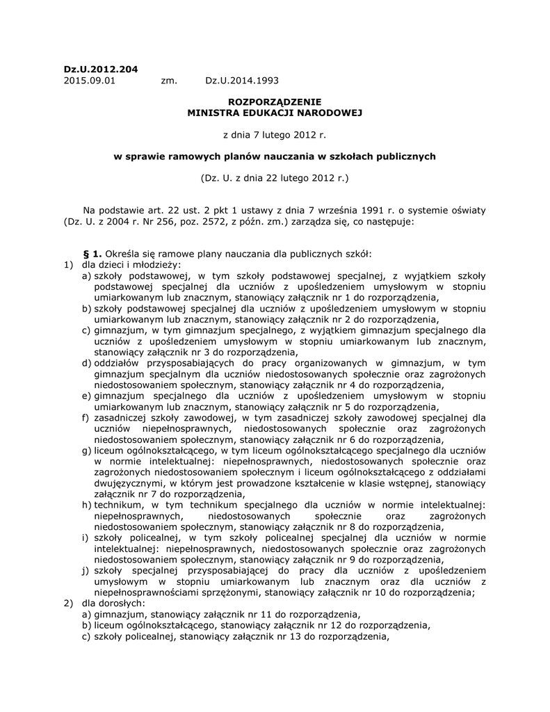Dz.U.2012.204 2015.09.01 zm. Dz.U.2014.1993 ROZPORZĄDZENIE MINISTRA EDUKACJI NARODOWEJ z dnia 7 lutego 2012 r. w sprawie ramowych planów nauczania w szkołach publicznych (Dz. U. z dnia 22 lutego 2012 r.) Na podstawie art. 22 ust. 2 pkt 1 ustawy z dnia 7 września 1991 r. o systemie oświaty (Dz. U. z 2004 r. Nr 256, poz. 2572, z późn. zm.) zarządza się, co następuje: § 1. Określa się ramowe plany nauczania dla publicznych szkół: 1) dla dzieci i młodzieży: a) szkoły podstawowej, w tym szkoły podstawowej specjalnej, z wyjątkiem szkoły podstawowej specjalnej dla uczniów z upośledzeniem umysłowym w stopniu umiarkowanym lub znacznym, stanowiący załącznik nr 1 do rozporządzenia, b) szkoły podstawowej specjalnej dla uczniów z upośledzeniem umysłowym w stopniu umiarkowanym lub znacznym, stanowiący załącznik nr 2 do rozporządzenia, c) gimnazjum, w tym gimnazjum specjalnego, z wyjątkiem gimnazjum specjalnego dla uczniów z upośledzeniem umysłowym w stopniu umiarkowanym lub znacznym, stanowiący załącznik nr 3 do rozporządzenia, d) oddziałów przysposabiających do pracy organizowanych w gimnazjum, w tym gimnazjum specjalnym dla uczniów niedostosowanych społecznie oraz zagrożonych niedostosowaniem społecznym, stanowiący załącznik nr 4 do rozporządzenia, e) gimnazjum specjalnego dla uczniów z upośledzeniem umysłowym w stopniu umiarkowanym lub znacznym, stanowiący załącznik nr 5 do rozporządzenia, f) zasadniczej szkoły zawodowej, w tym zasadniczej szkoły zawodowej specjalnej dla uczniów niepełnosprawnych, niedostosowanych społecznie oraz zagrożonych niedostosowaniem społecznym, stanowiący załącznik nr 6 do rozporządzenia, g) liceum ogólnokształcącego, w tym liceum ogólnokształcącego specjalnego dla uczniów w normie intelektualnej: niepełnosprawnych, niedostosowanych społecznie oraz zagrożonych niedostosowaniem społecznym i liceum ogólnokształcącego z oddziałami dwujęzycznymi, w którym jest prowadzone kształcenie w klasie wstępnej, stanowiący załącznik nr 7 do rozporządzenia, h) technikum, w tym technikum specjalnego dla uczniów w normie intelektualnej: niepełnosprawnych, niedostosowanych społecznie oraz zagrożonych niedostosowaniem społecznym, stanowiący załącznik nr 8 do rozporządzenia, i) szkoły policealnej, w tym szkoły policealnej specjalnej dla uczniów w normie intelektualnej: niepełnosprawnych, niedostosowanych społecznie oraz zagrożonych niedostosowaniem społecznym, stanowiący załącznik nr 9 do rozporządzenia, j) szkoły specjalnej przysposabiającej do pracy dla uczniów z upośledzeniem umysłowym w stopniu umiarkowanym lub znacznym oraz dla uczniów z niepełnosprawnościami sprzężonymi, stanowiący załącznik nr 10 do rozporządzenia; 2) dla dorosłych: a) gimnazjum, stanowiący załącznik nr 11 do rozporządzenia, b) liceum ogólnokształcącego, stanowiący załącznik nr 12 do rozporządzenia, c) szkoły policealnej, stanowiący załącznik nr 13 do rozporządzenia, d) klasy VI szkoły podstawowej, stanowiący załącznik nr 14 do rozporządzenia. § 2. 1. Ramowy plan nauczania określa: 1) minimalny wymiar godzin na danym etapie edukacyjnym przeznaczonych na realizację: poszczególnych obowiązkowych zajęć edukacyjnych, w toku których odbywa się edukacja wczesnoszkolna, nauczanie przedmiotów, bloków przedmiotowych, o których mowa w § 4 ust. 3, i kształcenie zawodowe, oraz zajęć z wychowawcą; 2) tygodniowy (semestralny) wymiar godzin obowiązkowych zajęć edukacyjnych dla uczniów (słuchaczy) poszczególnych klas oraz zajęć z wychowawcą dla uczniów poszczególnych klas, na danym etapie edukacyjnym; 3) minimalny wymiar godzin zajęć rewalidacyjnych dla uczniów niepełnosprawnych na danym etapie edukacyjnym; 4) tygodniowy wymiar godzin zajęć rewalidacyjnych dla uczniów niepełnosprawnych na danym etapie edukacyjnym; 5) wymiar godzin do dyspozycji dyrektora szkoły przeznaczonych na: a) zwiększenie liczby godzin wybranych obowiązkowych zajęć edukacyjnych, b) zajęcia realizujące potrzeby i zainteresowania uczniów, z uwzględnieniem art. 42 ust. 2 pkt 2 ustawy z dnia 26 stycznia 1982 r. - Karta Nauczyciela (Dz. U. z 2006 r. Nr 97, poz. 674, z późn. zm.). 2. W oddziałach szkół prowadzących kształcenie zawodowe na podstawie modułowego programu nauczania dla zawodu minimalny wymiar godzin na kształcenie zawodowe jest sumą minimalnych wymiarów godzin na kształcenie zawodowe teoretyczne i kształcenie zawodowe praktyczne, określonych w ramowych planach nauczania dla danego typu szkoły. 3. Zajęć rewalidacyjnych dla uczniów niepełnosprawnych nie prowadzi się w szkołach specjalnych zorganizowanych w podmiotach leczniczych. § 3. 1. Organ prowadzący szkołę, na wniosek dyrektora szkoły, może przyznać nie więcej niż 3 godziny tygodniowo dla każdego oddziału (grupy międzyoddziałowej lub grupy międzyklasowej) w danym roku szkolnym, a w przypadku szkół w zakładach poprawczych i schroniskach dla nieletnich - od 6 do 12 godzin, na: 1) okresowe lub roczne zwiększenie liczby godzin wybranych obowiązkowych zajęć edukacyjnych; 2) realizację następujących dodatkowych zajęć edukacyjnych rozwijających zainteresowania i uzdolnienia uczniów: a) zajęć z języka obcego nowożytnego innego niż język obcy nowożytny nauczany obowiązkowo w szkole, b) zajęć edukacyjnych, dla których nie została ustalona podstawa programowa, lecz program nauczania tych zajęć został włączony do szkolnego zestawu programów nauczania; 3)naukę języka migowego. 2. Dodatkowe zajęcia edukacyjne dyrektor szkoły może wprowadzić do szkolnego planu nauczania po zasięgnięciu opinii rady pedagogicznej i rady rodziców. W przypadku wprowadzenia dodatkowych zajęć edukacyjnych udział uczniów w tych zajęciach jest obowiązkowy. § 4. 1. Na podstawie ramowego planu nauczania dyrektor szkoły ustala szkolny plan nauczania, w którym określa 