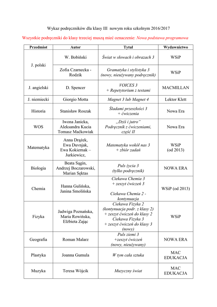 Wykaz podręczników dla klasy III nowym roku szkolnym 2016/2017 Wszystkie podręczniki do klasy trzeciej muszą mieć oznaczenie: Nowa podstawa programowa Przedmiot Autor Tytuł Wydawnictwo W. Bobiński Świat w słowach i obrazach 3 WSiP Zofia Czarnecka Rodzik Gramatyka i stylistyka 3 (nowy, nieużywany podręcznik) WSiP J. angielski D. Spencer VOICES 3 + Repetytorium z testami MACMILLAN J. niemiecki Giorgio Motta Magnet 3 lub Magnet 4 Lektor Klett Historia Stanisław Roszak Śladami przeszłości 3 + ćwiczenia Nowa Era WOS Iwona Janicka, Aleksandra Kucia Tomasz Maćkowiak „Dziś i jutro” Podręcznik z ćwiczeniami, część II Nowa Era Matematyka Anna Drążek, Ewa Duvnjak, Ewa Kokiernak – Jurkiewicz, Matematyka wokół nas 3 + zbiór zadań WSiP (od 2013) Biologia Beata Sągin, Andrzej Boczarowski, Marian Sęktas Puls życia 3 (tylko podręcznik) NOWA ERA J. polski Chemia Hanna Gulińska, Janina Smolińska Ciekawa Chemia 3 + zeszyt ćwiczeń 3 WSiP (od 2013) Ciekawa Chemia 2 kontynuacja Ciekawa Fizyka 2 (kontynuacja podr. z klasy 2) + zeszyt ćwiczeń do klasy 2 Ciekawa Fizyka 3 + zeszyt ćwiczeń do klasy 3 (nowy) Puls ziemi 3 +zeszyt ćwiczeń (nowy, nieużywany) Fizyka Jadwiga Poznańska, Maria Rowińska, Elżbieta Zając Geografia Roman Malarz Plastyka Joanna Gumula W tym cała sztuka MAC EDUKACJA Muzyka Teresa Wójcik Muzyczny świat MAC EDUKACJA WSiP NOWA ERA Zajęcia Techniczne U. Białka Zajęcia techniczne – podręcznik na 2 lata OPERON Religia Jan Szpet, Danuta Jackowiak Żyć w miłości Boga ŚW. WOJCIECH Companieros 1 kontynuacja SGEL Informatyka. Podstawowe tematy. Wydawnictwo szkolne PWN J. hiszpański Informatyka Grażyna Koba M. Goniewicz, A. Nowak, Z. Smutek Edukacja dla bezpieczeństwa M. Goniewicz, A. Nowak, Z. Smutek Edukacja dla bezpieczeństwa, Podręcznik cz. 1 i 2, linia pierwsza Edukacja dla bezpieczeństwa, Zeszyt ćwiczeń dla ucznia, linia pierwsza OPERON OPERON