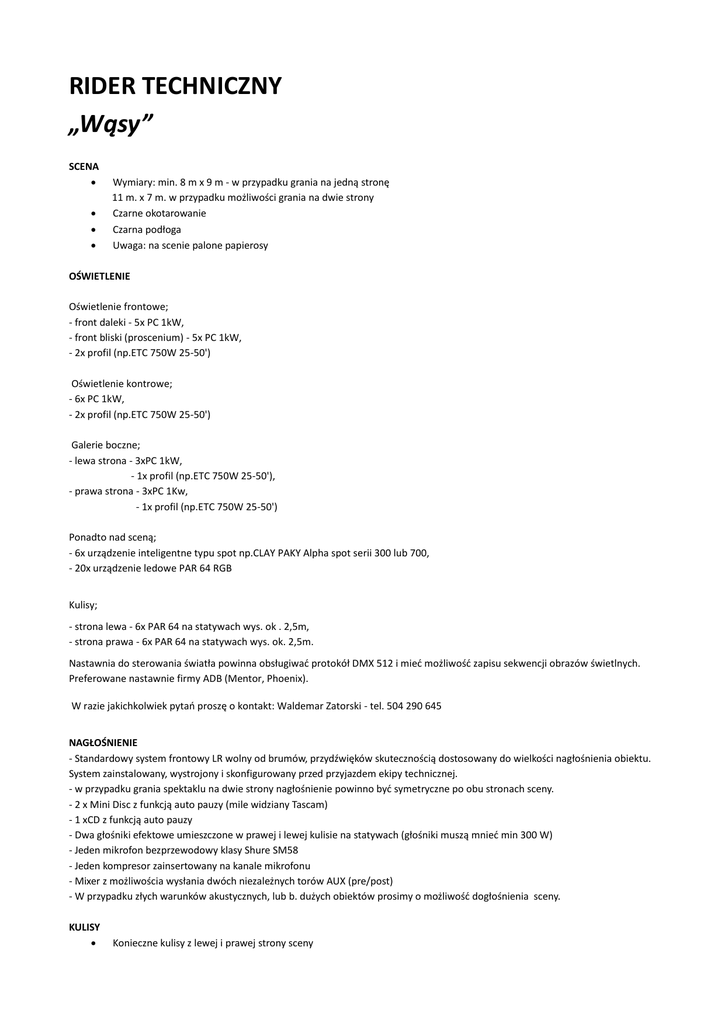 RIDER TECHNICZNY „Wąsy” SCENA Wymiary: min. 8 m x 9 m - w przypadku grania na jedną stronę 11 m. x 7 m. w przypadku możliwości grania na dwie strony Czarne okotarowanie Czarna podłoga Uwaga: na scenie palone papierosy OŚWIETLENIE Oświetlenie frontowe; - front daleki - 5x PC 1kW, - front bliski (proscenium) - 5x PC 1kW, - 2x profil (np.ETC 750W 25-50') Oświetlenie kontrowe; - 6x PC 1kW, - 2x profil (np.ETC 750W 25-50') Galerie boczne; - lewa strona - 3xPC 1kW, - 1x profil (np.ETC 750W 25-50'), - prawa strona - 3xPC 1Kw, - 1x profil (np.ETC 750W 25-50') Ponadto nad sceną; - 6x urządzenie inteligentne typu spot np.CLAY PAKY Alpha spot serii 300 lub 700, - 20x urządzenie ledowe PAR 64 RGB Kulisy; - strona lewa - 6x PAR 64 na statywach wys. ok . 2,5m, - strona prawa - 6x PAR 64 na statywach wys. ok. 2,5m. Nastawnia do sterowania światła powinna obsługiwać protokół DMX 512 i mieć możliwość zapisu sekwencji obrazów świetlnych. Preferowane nastawnie firmy ADB (Mentor, Phoenix). W razie jakichkolwiek pytań proszę o kontakt: Waldemar Zatorski - tel. 504 290 645 NAGŁOŚNIENIE - Standardowy system frontowy LR wolny od brumów, przydźwięków skutecznością dostosowany do wielkości nagłośnienia obiektu. System zainstalowany, wystrojony i skonfigurowany przed przyjazdem ekipy technicznej. - w przypadku grania spektaklu na dwie strony nagłośnienie powinno być symetryczne po obu stronach sceny. - 2 x Mini Disc z funkcją auto pauzy (mile widziany Tascam) - 1 xCD z funkcją auto pauzy - Dwa głośniki efektowe umieszczone w prawej i lewej kulisie na statywach (głośniki muszą mnieć min 300 W) - Jeden mikrofon bezprzewodowy klasy Shure SM58 - Jeden kompresor zainsertowany na kanale mikrofonu - Mixer z możliwościa wysłania dwóch niezależnych torów AUX (pre/post) - W przypadku złych warunków akustycznych, lub b. dużych obiektów prosimy o możliwość dogłośnienia sceny. KULISY Konieczne kulisy z lewej i prawej strony sceny 2 stoły z lampką na rekwizyty (po jednym w lewej i prawej kulisie), krzesła oraz gniazdka zasilające Wieszak metalowy GARDEROBY 1 garderoba do dyspozycji aktorów - dobrze oświetlone lustra (ew. lampki biurowe o mocy min. 80 WATT) - woda mineralna, kawa, herbata - wieszaki metalowe 1 pomieszczenie dla obsługi technicznej spektaklu - woda mineralna, kawa, herbata Deska do prasowania i żelazko NIEZBĘDNA MIEJSCOWA OBSŁUGA SPEKTAKLU Kierownik sceny 2 oświetleniowców 1 akustyk Inspicjent 2 montażystów Montaż scenografii: 2 godz. Ustawienie świateł i dźwięku: 6 godz. Próba: 2 godz. Osoba kontaktowa w sprawach nagłośnienia: Pozostałe sprawy techniczne: Adam Czaplicki: 501 527 988 Małgorzata Domańska: tel. 512 13 51 07 IMPRESARIAT TEATRU POLONIA I OCH-TEATRU Iwona Gradkowska, kom. 609 062 817 email: [email protected]