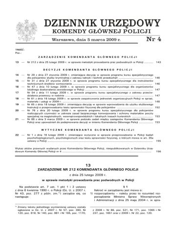 Dziennik Urzędowy Komendy Głównej Policji Nr 4 Poz. 13 ⎯ 143 ⎯ DZIENNIK URZĘDOWY KOMENDY GŁÓWNEJ POLICJI Warszawa, dnia 5 marca 2009 r. Nr 4 , , TRESC: Poz.: ZARZĄDZENIE KOMENDANTA 13 ⎯ Nr 212 z dnia 25 lutego 2009 r. w sprawie metodyki prowadzenia prac podwodnych w Policji .......... DECYZJE KOMENDANTA 14 ⎯ 15 ⎯ 16 ⎯ 17 18 ⎯ 19 ⎯ 20 ⎯ 21 ⎯ GŁÓWNEGO POLICJI 143 GŁÓWNEGO POLICJI Nr 29 z dnia 27 stycznia 2009 r. zmieniająca decyzję w sprawie programu kursu specjalistycznego dla policjantów służby kryminalnej z zakresu taktyki i technik przesłuchań ....................................... Nr 31 z dnia 27 stycznia 2009 r. w sprawie programu kursu specjalistycznego dla instruktorów technicznych środków wzmocnienia .......................................................................................... Nr 47 z dnia 10 lutego 2009 r. w sprawie programu kursu specjalistycznego dla organizatorów lokalnego doskonalenia zawodowego w Policji ............................................................................. Nr 54 z dnia 11 lutego 2009 r. w sprawie programu kursu specjalistycznego z zakresu przeciwdziałania przemocy w rodzinie .................................................................................................... Nr 61 z dnia 16 lutego 2009 r. w sprawie zaopatrywania jednostek organizacyjnych Policji w sprzęt, materiały i usługi w 2009 r. ...................................................................................................... Nr 65 z dnia 18 lutego 2009 r. zmieniająca decyzję w sprawie wprowadzenia do użytku służbowego Instrukcji o przeprowadzaniu testu sprawności fizycznej dla policjantów ........................................ Nr 76 z dnia 20 lutego 2009 r. w sprawie programu kursu specjalistycznego dla policjantów realizujących czynności w zakresie zasad bezpiecznego konwojowania i ochrony materiałów poczty specjalnej na magistralnych, wewnątrzwojewódzkich i lokalnych trasach kurierskich ....................... Nr 88 z dnia 3 marca 2009 r. w sprawie podziału zadań między zastępców Komendanta Głównego Policji oraz upoważnień do podejmowania decyzji w imieniu Komendanta Głównego Policji ................ 146 146 147 147 148 152 153 153 WYTYCZNE KOMENDANTA GŁÓWNEGO POLICJI 22 ⎯ Nr 1 z dnia 18 lutego 2009 r. zmieniające wytyczne w sprawie przeprowadzania w Policji badań psychofizjologicznych, psychologicznych oraz testu sprawności fizycznej, o których mowa w art. 35a ustawy o Policji ....................................................................................................................... 155 Wykaz aktów prawnych wydanych przez Komendanta Głównego Policji, nieopublikowanych w Dzienniku Urzędowym Komendy Głównej Policji nr 4 ..................................................................................................... 156 13 ZARZĄDZENIE NR 212 KOMENDANTA GŁÓWNEGO POLICJI z dnia 25 lutego 2009 r. w sprawie metodyki prowadzenia prac podwodnych w Policji Na podstawie art. 7 ust. 1 pkt 1 i 2 ustawy z dnia 6 kwietnia 1990 r. o Policji (Dz. U. z 2007 r. Nr 43, poz. 277 z późn. zm. 1)) zarządza się, co następuje: 1) Zmiany tekstu jednolitego wymienionej ustawy zostały ogłoszone w Dz. U. z 2007 r. Nr 57, poz. 390, Nr 120, poz. 818, Nr 140, poz. 981 i Nr 165, poz. 1170, §1 Ilekroć w zarządzeniu jest mowa o: 1) rozporządzeniu – należy przez to rozumieć rozporządzenie Ministra Spraw Wewnętrznych i Administracji z dnia 25 maja 2004 r. w spra- z 2008 r. Nr 86, poz. 521, Nr 171, poz. 1065 i Nr 237, poz. 1651 oraz z 2009 r. Nr 22, poz. 120. Dziennik Urzędowy Komendy Głównej Policji Nr 4 2) 3) 4) 5) Poz. 13 ⎯ 144 ⎯ wie wykonywania prac podwodnych w jednostkach organizacyjnych podległych lub nadzorowanych przez ministra właściwego do spraw wewnętrznych (Dz. U. Nr 138, poz. 1468); pracach podwodnych – należy przez to rozumieć prace podwodne w rozumieniu art. 2 pkt 13 ustawy z dnia 17 października 2003 r. o wykonywaniu prac podwodnych (Dz. U. Nr 199, poz. 1936, z 2004 r. Nr 273, poz. 2703, z 2005 r. Nr 155, poz. 1298, z 2007 r. Nr 64, poz. 428 oraz z 2008 r. Nr 180, poz. 1112); nurku policyjnym – należy przez to rozumieć policjanta posiadającego kwalifikacje, o których mowa w § 16-18 rozporządzenia; kandydacie na nurka policyjnego – należy przez to rozumieć policjanta posiadającego odpowiednie kwalifikacje do uprawiania płetwonurkowania, o których mowa w art. 53c ust. 1 i 2 ustawy z dnia 18 stycznia 1996 r. o kulturze fizycznej (Dz. U. z 2007 r. Nr 226, poz. 1675, z 2007 r. Nr 171, poz. 1208 oraz z 2008 r. Nr 195, poz. 1200) lub uprawnienia nurka III klasy w rozumieniu art. 19 i 20 ustawy z dnia 17 października 2003 r. o wykonywaniu prac podwodnych; kierującym pracami podwodnymi – należy przez to rozumieć policjanta posiadającego kwalifikacje, o których mowa w § 5 ust. 1-3 rozporządzenia. §2 Policjanci pełniący służbę w jednostkach i komórkach antyterrorystycznych, komórkach minersko-pirotechnicznych oraz komórkach prac podwodnych wykonują prace podwodne, jeśli jest to niezbędne do skutecznego wykonania czynności służbowych podejmowanych w celu realizacji ustawowych zadań Policji. §3 1. W ramach centralnego doskonalenia zawodowego policjantów organizuje się: 1) szkolenie, o którym mowa w § 16 pkt 5, § 17 pkt 5 oraz § 18 pkt 5 rozporządzenia; 2) przeszkolenie, o którym mowa w § 5 ust. 1 pkt 4 i § 16 pkt 3 rozporządzenia; 3) przeszkolenie dodatkowe, o którym mowa w § 18 pkt 7 rozporządzenia. 2. W ramach lokalnego doskonalenia zawodowego policjantów można organizować przeszkolenia, o których mowa w ust. 1 pkt 2 i 3. 3. W celu zachowania sprawności psychofizycznej niezbędnej do bezpiecznego i skutecznego wykonywania prac podwodnych, każdy nurek policyjny powinien wykonywać prace podwodne w wymiarze co najmniej 50 godzin w ciągu roku. 4. Jeżeli nie ma możliwości wykonania prac podwo