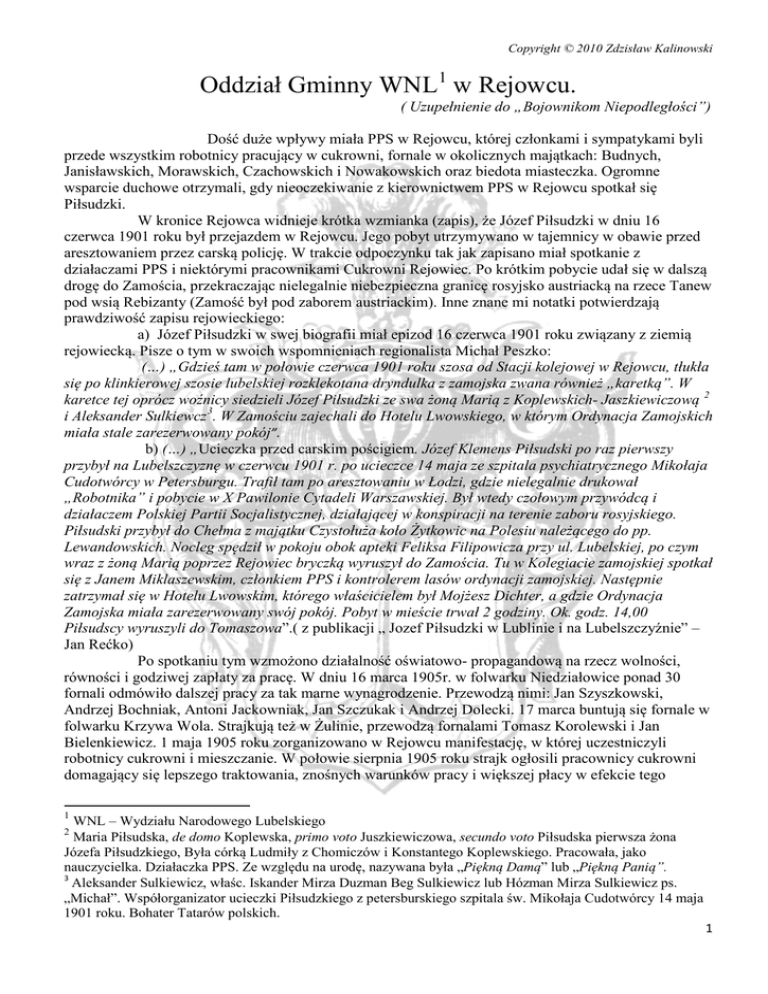 Copyright © 2010 Zdzisław Kalinowski Oddział Gminny WNL1 w Rejowcu. ( Uzupełnienie do „Bojownikom Niepodległości”) Dość duże wpływy miała PPS w Rejowcu, której członkami i sympatykami byli przede wszystkim robotnicy pracujący w cukrowni, fornale w okolicznych majątkach: Budnych, Janisławskich, Morawskich, Czachowskich i Nowakowskich oraz biedota miasteczka. Ogromne wsparcie duchowe otrzymali, gdy nieoczekiwanie z kierownictwem PPS w Rejowcu spotkał się Piłsudzki. W kronice Rejowca widnieje krótka wzmianka (zapis), że Józef Piłsudzki w dniu 16 czerwca 1901 roku był przejazdem w Rejowcu. Jego pobyt utrzymywano w tajemnicy w obawie przed aresztowaniem przez carską policję. W trakcie odpoczynku tak jak zapisano miał spotkanie z działaczami PPS i niektórymi pracownikami Cukrowni Rejowiec. Po krótkim pobycie udał się w dalszą drogę do Zamościa, przekraczając nielegalnie niebezpieczna granicę rosyjsko austriacką na rzece Tanew pod wsią Rebizanty (Zamość był pod zaborem austriackim). Inne znane mi notatki potwierdzają prawdziwość zapisu rejowieckiego: a) Józef Piłsudzki w swej biografii miał epizod 16 czerwca 1901 roku związany z ziemią rejowiecką. Pisze o tym w swoich wspomnieniach regionalista Michał Peszko: (…) „Gdzieś tam w połowie czerwca 1901 roku szosa od Stacji kolejowej w Rejowcu, tłukła się po klinkierowej szosie lubelskiej rozklekotana dryndulka z zamojska zwana również „karetką”. W karetce tej oprócz woźnicy siedzieli Józef Piłsudzki ze swa żoną Marią z Koplewskich- Jaszkiewiczową 2 i Aleksander Sulkiewcz 3. W Zamościu zajechali do Hotelu Lwowskiego, w którym Ordynacja Zamojskich miała stale zarezerwowany pokój”. b) (…) „Ucieczka przed carskim pościgiem. Józef Klemens Piłsudski po raz pierwszy przybył na Lubelszczyznę w czerwcu 1901 r. po ucieczce 14 maja ze szpitala psychiatrycznego Mikołaja Cudotwórcy w Petersburgu. Trafił tam po aresztowaniu w Łodzi, gdzie nielegalnie drukował „Robotnika” i pobycie w X Pawilonie Cytadeli Warszawskiej. Był wtedy czołowym przywódcą i działaczem Polskiej Partii Socjalistycznej, działającej w konspiracji na terenie zaboru rosyjskiego. Piłsudski przybył do Chełma z majątku Czystołuża koło Żytkowic na Polesiu należącego do pp. Lewandowskich. Nocleg spędził w pokoju obok apteki Feliksa Filipowicza przy ul. Lubelskiej, po czym wraz z żoną Marią poprzez Rejowiec bryczką wyruszył do Zamościa. Tu w Kolegiacie zamojskiej spotkał się z Janem Miklaszewskim, członkiem PPS i kontrolerem lasów ordynacji zamojskiej. Następnie zatrzymał się w Hotelu Lwowskim, którego właścicielem był Mojżesz Dichter, a gdzie Ordynacja Zamojska miała zarezerwowany swój pokój. Pobyt w mieście trwał 2 godziny. Ok. godz. 14,00 Piłsudscy wyruszyli do Tomaszowa”.( z publikacji „ Jozef Piłsudzki w Lublinie i na Lubelszczyźnie” – Jan Rećko) Po spotkaniu tym wzmożono działalność oświatowo- propagandową na rzecz wolności, równości i godziwej zapłaty za pracę. W dniu 16 marca 1905r. w folwarku Niedziałowice ponad 30 fornali odmówiło dalszej pracy za tak marne wynagrodzenie. Przewodzą nimi: Jan Szyszkowski, Andrzej Bochniak, Antoni Jackowniak, Jan Szczukak i Andrzej Dolecki. 17 marca buntują się fornale w folwarku Krzywa Wola. Strajkują też w Żulinie, przewodzą fornalami Tomasz Korolewski i Jan Bielenkiewicz. 1 maja 1905 roku zorganizowano w Rejowcu manifestację, w której uczestniczyli robotnicy cukrowni i mieszczanie. W połowie sierpnia 1905 roku strajk ogłosili pracownicy cukrowni domagający się lepszego traktowania, znośnych warunków pracy i większej płacy w efekcie tego WNL – Wydziału Narodowego Lubelskiego Maria Piłsudska, de domo Koplewska, primo voto Juszkiewiczowa, secundo voto Piłsudska pierwsza żona Józefa Piłsudzkiego, Była córką Ludmiły z Chomiczów i Konstantego Koplewskiego. Pracowała, jako nauczycielka. Działaczka PPS. Ze względu na urodę, nazywana była „Piękną Damą” lub „Piękną Panią”. 3 Aleksander Sulkiewicz, właśc. Iskander Mirza Duzman Beg Sulkiewicz lub Hózman Mirza Sulkiewicz ps. „Michał”. Współorganizator ucieczki Piłsudzkiego z petersburskiego szpitala św. Mikołaja Cudotwórcy 14 maja 1901 roku. Bohater Tatarów polskich. 1 2 1 Copyright © 2010 Zdzisław Kalinowski protestu podniesiono pracownikom zarobki o 10%, zmniejszono komorne w mieszkaniach przy fabrycznych. 3 listopada 1905r. zorganizowano dużą jak na Rejowiec manifestację połączoną z wiecem robotników cukrowni, w której początkowo uczestniczyło około 500 osób. Co chwilę dołączały liczne grupy z samego miasteczka i okolicznych wsi. Manifestacja rozrosła się do 2 tysięcy demonstrujących. Śpiewano pieśni „Jeszcze Polska nie zginęła”, „ Boże coś Polskę”. Domagano się autonomii Polski. Pod wpływem głoszonej ideologii socjalistycznej rośnie świadomość przynależności narodowej oraz prawa do swobód obywatelskich. W latach 1905 do 1907 roku, co jakiś czas wybuchały strajki i manifestacje domagających się szkół polskich w gminie Rejowiec. Zdarzyły się przypadki usuwania portretów cara Mikołaja II z izb lekcyjnych tak jak to uczynili uczniowie w listopadzie 1905r 4 najstarszych klas Реиовецкого Hp. 2 одно класного начального училища. W styczniu 1906 roku na zebraniu gminnym domagano się wprowadzenia do nauki szkolnej języka polskiego, nie chcieli, aby uczono ich dzieci języka rosyjskiego, chcą natomiast książek i nauczycieli polskich. Podjęto uchwałę o wprowadzeniu języka polskiego do kancelarii gminnej i sądzie. Nie zgadzano się na ciągłe podnoszenie podatków. Część rekrutów, pomimo grożących im surowych kar uchylała się od służby wojskowej. Rok 1906 stał pod znakiem ponownych strajków i manifestowania niezadowolenia mieszkańców gminy Rejowiec. W Rejowcu strajkowano i mani