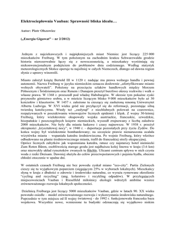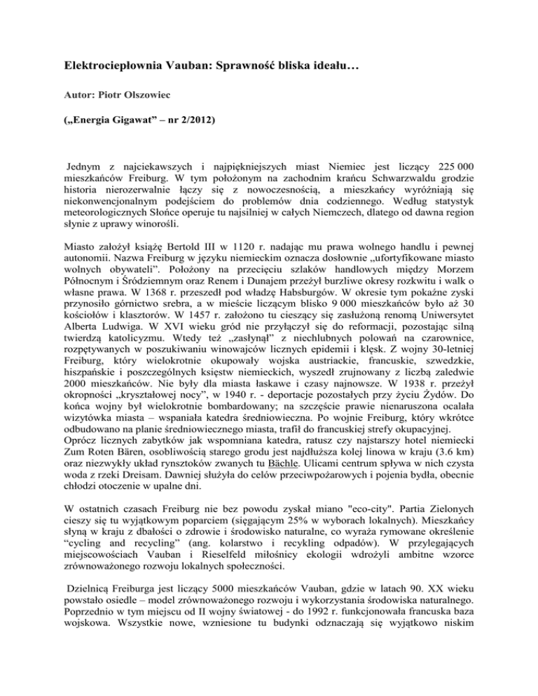 Elektrociepłownia Vauban: Sprawność bliska ideału… Autor: Piotr Olszowiec („Energia Gigawat” – nr 2/2012) Jednym z najciekawszych i najpiękniejszych miast Niemiec jest liczący 225 000 mieszkańców Freiburg. W tym położonym na zachodnim krańcu Schwarzwaldu grodzie historia nierozerwalnie łączy się z nowoczesnością, a mieszkańcy wyróżniają się niekonwencjonalnym podejściem do problemów dnia codziennego. Według statystyk meteorologicznych Słońce operuje tu najsilniej w całych Niemczech, dlatego od dawna region słynie z uprawy winorośli. Miasto założył książę Bertold III w 1120 r. nadając mu prawa wolnego handlu i pewnej autonomii. Nazwa Freiburg w języku niemieckim oznacza dosłownie „ufortyfikowane miasto wolnych obywateli”. Położony na przecięciu szlaków handlowych między Morzem Północnym i Śródziemnym oraz Renem i Dunajem przeżył burzliwe okresy rozkwitu i walk o własne prawa. W 1368 r. przeszedł pod władzę Habsburgów. W okresie tym pokaźne zyski przynosiło górnictwo srebra, a w mieście liczącym blisko 9 000 mieszkańców było aż 30 kościołów i klasztorów. W 1457 r. założono tu cieszący się zasłużoną renomą Uniwersytet Alberta Ludwiga. W XVI wieku gród nie przyłączył się do reformacji, pozostając silną twierdzą katolicyzmu. Wtedy też „zasłynął” z niechlubnych polowań na czarownice, rozpętywanych w poszukiwaniu winowajców licznych epidemii i klęsk. Z wojny 30-letniej Freiburg, który wielokrotnie okupowały wojska austriackie, francuskie, szwedzkie, hiszpańskie i poszczególnych księstw niemieckich, wyszedł zrujnowany z liczbą zaledwie 2000 mieszkańców. Nie były dla miasta łaskawe i czasy najnowsze. W 1938 r. przeżył okropności „kryształowej nocy”, w 1940 r. - deportacje pozostałych przy życiu Żydów. Do końca wojny był wielokrotnie bombardowany; na szczęście prawie nienaruszona ocalała wizytówka miasta – wspaniała katedra średniowieczna. Po wojnie Freiburg, który wkrótce odbudowano na planie średniowiecznego miasta, trafił do francuskiej strefy okupacyjnej. Oprócz licznych zabytków jak wspomniana katedra, ratusz czy najstarszy hotel niemiecki Zum Roten Bären, osobliwością starego grodu jest najdłuższa kolej linowa w kraju (3.6 km) oraz niezwykły układ rynsztoków zwanych tu Bächle. Ulicami centrum spływa w nich czysta woda z rzeki Dreisam. Dawniej służyła do celów przeciwpożarowych i pojenia bydła, obecnie chłodzi otoczenie w upalne dni. W ostatnich czasach Freiburg nie bez powodu zyskał miano "eco-city". Partia Zielonych cieszy się tu wyjątkowym poparciem (sięgającym 25% w wyborach lokalnych). Mieszkańcy słyną w kraju z dbałości o zdrowie i środowisko naturalne, co wyraża rymowane określenie “cycling and recycling” (ang. kolarstwo i recykling odpadów). W przylegających miejscowościach Vauban i Rieselfeld miłośnicy ekologii wdrożyli ambitne wzorce zrównoważonego rozwoju lokalnych społeczności. Dzielnicą Freiburga jest liczący 5000 mieszkańców Vauban, gdzie w latach 90. XX wieku powstało osiedle – model zrównoważonego rozwoju i wykorzystania środowiska naturalnego. Poprzednio w tym miejscu od II wojny światowej - do 1992 r. funkcjonowała francuska baza wojskowa. Wszystkie nowe, wzniesione tu budynki odznaczają się wyjątkowo niskim zużyciem energii. Część z nich posiada własne źródła ciepła i elektryczności pracujące w skojarzeniu i opalane biomasą. Inne domy wyposażono w kolektory słoneczne lub panele fotowoltaiczne. W Vauban funkcjonuje pierwsze w świecie osiedle, w którym urzeczywistniono koncepcję PlusEnergy. Zakłada ona dodatni bilans energetyczny poszczególnych domów tj. nadwyżkę wytwarzanej energii nad pobieraną z zewnątrz. Drugim jej celem jest wyeliminowanie emisji zanieczyszczeń i dwutlenku węgla. W zbudowanych w latach 2000-2005 budynkach uzyskuje się średnio 4000 EUR zysku ze sprzedanej czystej energii elektrycznej. Użytkownicy domowych instalacji słonecznych podkreślają, że dodatni bilans energetyczny ich gospodarstw nie odbywa się bynajmniej kosztem jakichkolwiek ograniczeń. Prekursorem tej idei był Rolf Disch, który w swojej rezydencji „Heliotrope” osiągnął w 1994 r. jako pierwszy nadwyżkę domowego bilansu energii. Tak korzystny efekt użytkownicy technologii PlusEnergy zawdzięczają nie tylko własnej generacji elektryczności i ciepła, lecz również ultraoszczędnym konstrukcjom budynków z wykorzystaniem okien o trzech szybach, nowoczesnych materiałów izolacyjnych itp. Troska o ekologię i oszczędność energii znalazły miejsce również w rozwiązaniach transportu i komunikacji miejskiej. W Vauban mieszkańcy poruszają się głównie pieszo lub na rowerach. Osiedle połączono z centrum Freiburga linią tramwajową przebiegającą wzdłuż większości zabudowań – dzięki temu prawie wszyscy mieszkają dość blisko od przystanku. Około 70% ludności nie używa na co dzień samochodów osobowych (!!!), przy czym odsetek ten wciąż wzrasta. Dzielnicę przenika gęsta sieć ścieżek rowerowych, zaś stosunkowo niewiele jest dróg dla pojazdów i miejsc parkingowych. Na wielu ulicach dopuszcza się przejazd samochodów, lecz bez dłuższego postoju. Do dyspozycji posiadaczy samochodów w Vaubam udostępniono wielopiętrowy parking na peryferiach miasta. W ostatnim czasie kolejnym powodem do dumy mieszkańców Vauban stała się supernowoczesna elektrociepłownia. W 2002 r. uruchomiono w tej dzielnicy kocioł opalany biomasą, wspomagany w szczycie zapotrzebowania przez dalsze dwa kotły gazowe i olejowe. Ze spalania odpadów drzewnych uzyskiwano 2.5 MWt, podobną wydajność cieplną miał każdy z dwóch pozostałych kotłów. Mini-generator parowy dostarczał dodatkowo 240 kWe. O ile instalacja biomasy spisywała się bez zarzutu, to silnik tłokowy napędzający prądnicę sprawiał sporo problemów. Dlatego eksploatuj