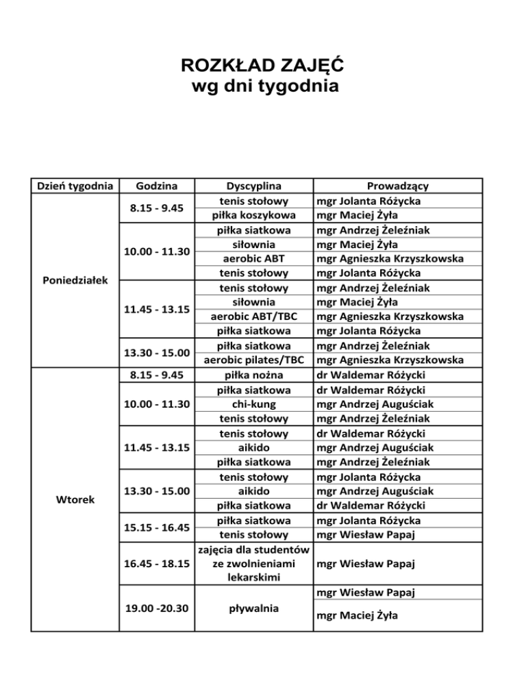 ROZKŁAD ZAJĘĆ wg dni tygodnia