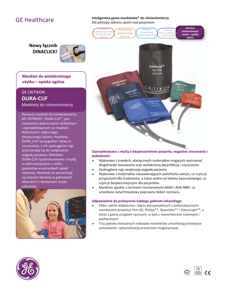 Inteligentna gama mankietów* do ciśnieniomierzy Dla pełnego zakresu opieki nad pacjentem GE Healthcare Mankiet krótkotrwałego użytku dla pojedynczego pacjenta Mankiet dla pojedynczego pacjenta Mankiet Mankiet ograniczonego wielorazowego użytku wielorazowego użytku ‐ opieka szpitalna Mankiet wielorazowego użytku ‐ opieka ogólna Nowy łącznik DINACLICK! Mankiet do wielokrotnego użytku – opieka ogólna GE CRITIKON DURA‐CUF Mankiety do ciśnieniomierzy Pierwszy mankiet do ciśnieniomierzy GE CRITIKON*, DURA‐CUF*, jest mankietem jednocześnie delikatnym i zaprojektowanym na trwałość. Wykonane z odpornego, elastycznego nylonu, mankiety DURA_CUF są wygodne i łatwy w czyszczeniu, a ich zaokrąglone rogi przyczyniają się do zwiększenia wygody pacjenta. Mankiety DURA‐CUF są konstruowane z myślą o wykorzystywaniu u wielu pacjentów w warunkach opieki nieostrej. Mankiety te sprawdzają się również idealnie w gabinetach lekarskich o obniżonym ryzyku zakażenia. Zaprojektowane z myślą o bezpieczeństwie pacjenta, wygodzie stosowania i dokładności • Wykonane z trwałych, elastycznych materiałów mogących wytrzymać długotrwałe stosowanie oraz wielokrotną dezynfekcję i czyszczenie. • Zaokrąglone rogi zwiększają wygodę pacjenta • Wykonane z materiałów niezawierających polichlorku winylu, co czyni je przyjaznymi dla środowiska, a także wolne od lateksu kauczukowego, co czyni je bezpieczniejszymi dla pacjentów • Mankiety zgodne z normami rozmiarowymi AAMI i AHA NIBP, co umożliwia natychmiastowy poprawny dobór rozmiaru. Odpowiednie do praktycznie każdego gabinetu lekarskiego • Pełen zakres adapterów i złączy kompatybilnych z automatycznymi monitorami produkcji firm GE, Philips**, Spacelabs** i Datascope**, a także z gamą urządzeń ręcznych, w tym z manometrami ściennymi i podręcznymi • Trzy pakiety mieszanych rodzajów mankietów umożliwiają łatwiejsze zamawianie i optymalizację przestrzeni magazynowej Colin Philips/HP** Spacelabs Siemens** Datascope Welch Allyn GE Healthcare Protocol Sfigmomanometr ręczny Manometr ścienny DURA‐CUF Rozmiar Kolor Obwód Dwuprzewodowy łącznik Dwuprzewodowy łącznik dwuprzewodowy łącznik Dwuprzewodowy łącznik kończyny gwintowy DINACLICK Submin Mated Submin NiemowlętaPomarańczowy 8‐13cm Jednoprzewodowy łącznik gwintowy Jednoprzewodowy łącznik bagnetowy Jednoprzewodowy łącznik Submin System pompowania DURA‐CUF 002783 DUR‐P1‐2A 002200 27501 002760 002274 2740 002385 Dzieci Zielony 12‐19 cm 002781 DUR‐P2‐2A 002201 2751 002761 002275 2741 002384 Dzieci ‐ długi Zielony 12‐19 cm 2785 DUR‐P2‐ 2A‐L 002769 002386 Dorośli drobnej budowy Kobaltowy 17‐25 cm 002779 DUR‐A1‐2A 002202 2752 002762 002276 2742 002383 Dorośli drobnej budowy ‐ długi Kobaltowy 17‐25 cm DUR‐A1‐ 2A‐L 002763 002387 Dorośli – mankiet z Granatowy wieszakiem 23‐33 cm 002771 002380 Dorośli Granatowy 23‐33 cm 002774 DUR‐A2‐2A 002203 2753 002764 002277 2743 Dorośli ‐ długi Granatowy 23‐33 cm 002772 DUR‐A2‐ 2A‐L 002206 002756 002765 002130 2388 Dorośli masywnej budowy Różowy 31‐40 cm 002791 DUR‐A3‐2A 002204 2754 002766 002278 2744 002381 Dorośli masywnej budowy ‐ długi Różowy 31‐40 cm 002784 DUR‐A3‐ 2A‐L 002207 002757 002767 002131 2389 Udo Brązowy 38‐50 cm 002796 DUR‐T1‐2A 002205 2755 002768 002279 2745 002382 1. Mankiet niemowlęcy do urządzeń monitorujących Datex‐Ohmeda wyposażony jest w męskie złącze typu Slip Luer. Pakiety mieszane dwuprzewodowy, łącznik gwintowy dwuprzewodowy, łącznik submin dwuprzewodowy łącznik DINACLICK Numer katalogowy Opis 002699 1 niemowlęcy, 1 dziecięcy, 1 dor. drobnej bud., 1 dorosły, 1 dor. duż. budowy i 1 udowy (6 mankietów/pakiet) 002697 2 niemowlęce, 3 dziecięce, 1 dor. drobnej bud (6 mankietów/pakiet) 002698 1 dor. drobnej budowy, 2 dorosłe, 1 dor. długi, 1 dor. dużej bud. 1 dor. dużej bud. długi (6 mankietów/pakiet) 2299 1 niemowlęcy, 1 dziecięcy, 1 dor. drobnej bud., 1 dorosły, 1 dor. duż. budowy i 1 udowy (6 mankietów/pakiet) 2059301‐001 GE Healthcare P.O. Box 900, FIN‐00031 GE, Finland GE Direct United Kingdom: +44 (0)800 0329201 www.gehealthcare.com 1 dor. drobnej budowy, 1 dor. i 1 dor. masywnej budowy (3 mankiety/opakowanie) O wszechstronnych rozwiązaniach dotyczących mankietów do ciśnieniomierzy oferowanych przez firmę GE Healthcare można dowiedzieć się więcej odwiedzając stronę internetową cuffs.gehealthcare.com © 2013 General Electric Company — All rights reserved. General Electric Company reserves the right to make changes in specifications and features shown herein, or discontinue the product described at any time without notice or obligation. Contact your GE representative for the most current information. GE and GE Monogram are trademarks of General Electric Company. *Trademarks of General Electric Company. **All third party trademarks are the property of their respective owner. EMEA DOC1313654 04/13 (Global version D0C1094825 rev 2) GE Healthcare Łączymy technologię i opiekę GE CRITIKON* GE CRITIKON* RADIAL-CUF mankiet na przedramię GE Healthcare oferuje pierwszy mankiet do pomiaru ciśnienia krwi na przedramieniu, który został zwalidowany klinicznie1 u otyłych lub atletycznie zbudowanych pacjentów. Zapewnia on odpowiednie dopasowanie i komfort, dostarczając rzetelnych pomiarów ciśnienia krwi i wspomagając opiekę medyczą wysokiej jakości. Statystyki otyłości w Europie Wzrost otyłości u dorosłych pacjentów jest jednym z kluczowych problemów opieki zdrowotnej. W UE 15,5% dorosłej populacji jest otyła.2 Ilość otyłych dorosłych pacjentów wzrosła ponad dwukrotnie w ciągu ostatnich 20 lat w większości krajów UE.3 Wyzwaniem jest rzetelny, dokładny, nieinwazyjny pomiar ciśnienia krwi u otyłych pacjentów. Otyłość jest znanym czynnikiem ryzyka wielu problemów zdrowotnych, w tym nadciśnie
