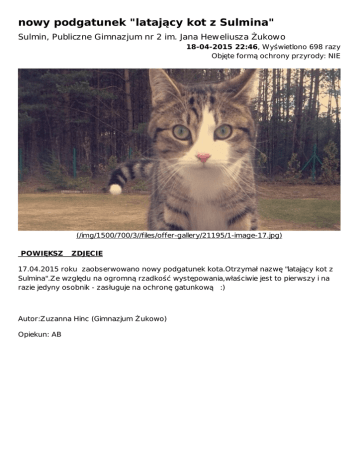 nowy podgatunek "latający kot z Sulmina" Sulmin, Publiczne Gimnazjum nr 2 im. Jana Heweliusza Żukowo 18-04-2015 22:46, Wyświetlono 698 razy Objęte formą ochrony przyrody: NIE (/img/1500/700/3//files/offer-gallery/21195/1-image-17.jpg) POWIĘKSZ ZDJĘCIE 17.04.2015 roku zaobserwowano nowy podgatunek kota.Otrzymał nazwę "latający kot z Sulmina".Ze względu na ogromną rzadkość występowania,właściwie jest to pierwszy i na razie jedyny osobnik - zasługuje na ochronę gatunkową :) Autor:Zuzanna Hinc (Gimnazjum Żukowo) Opiekun: AB