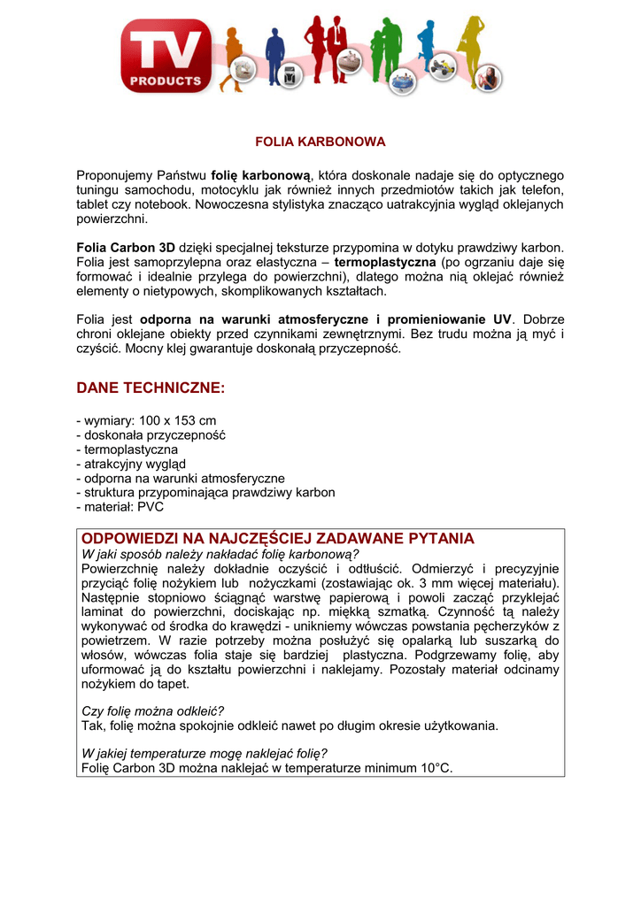 FOLIA KARBONOWA Proponujemy Państwu folię karbonową, która doskonale nadaje się do optycznego tuningu samochodu, motocyklu jak również innych przedmiotów takich jak telefon, tablet czy notebook. Nowoczesna stylistyka znacząco uatrakcyjnia wygląd oklejanych powierzchni. Folia Carbon 3D dzięki specjalnej teksturze przypomina w dotyku prawdziwy karbon. Folia jest samoprzylepna oraz elastyczna – termoplastyczna (po ogrzaniu daje się formować i idealnie przylega do powierzchni), dlatego można nią oklejać również elementy o nietypowych, skomplikowanych kształtach. Folia jest odporna na warunki atmosferyczne i promieniowanie UV. Dobrze chroni oklejane obiekty przed czynnikami zewnętrznymi. Bez trudu można ją myć i czyścić. Mocny klej gwarantuje doskonałą przyczepność. DANE TECHNICZNE: - wymiary: 100 x 153 cm - doskonała przyczepność - termoplastyczna - atrakcyjny wygląd - odporna na warunki atmosferyczne - struktura przypominająca prawdziwy karbon - materiał: PVC ODPOWIEDZI NA NAJCZĘŚCIEJ ZADAWANE PYTANIA W jaki sposób należy nakładać folię karbonową? Powierzchnię należy dokładnie oczyścić i odtłuścić. Odmierzyć i precyzyjnie przyciąć folię nożykiem lub nożyczkami (zostawiając ok. 3 mm więcej materiału). Następnie stopniowo ściągnąć warstwę papierową i powoli zacząć przyklejać laminat do powierzchni, dociskając np. miękką szmatką. Czynność tą należy wykonywać od środka do krawędzi - unikniemy wówczas powstania pęcherzyków z powietrzem. W razie potrzeby można posłużyć się opalarką lub suszarką do włosów, wówczas folia staje się bardziej plastyczna. Podgrzewamy folię, aby uformować ją do kształtu powierzchni i naklejamy. Pozostały materiał odcinamy nożykiem do tapet. Czy folię można odkleić? Tak, folię można spokojnie odkleić nawet po długim okresie użytkowania. W jakiej temperaturze mogę naklejać folię? Folię Carbon 3D można naklejać w temperaturze minimum 10°C.