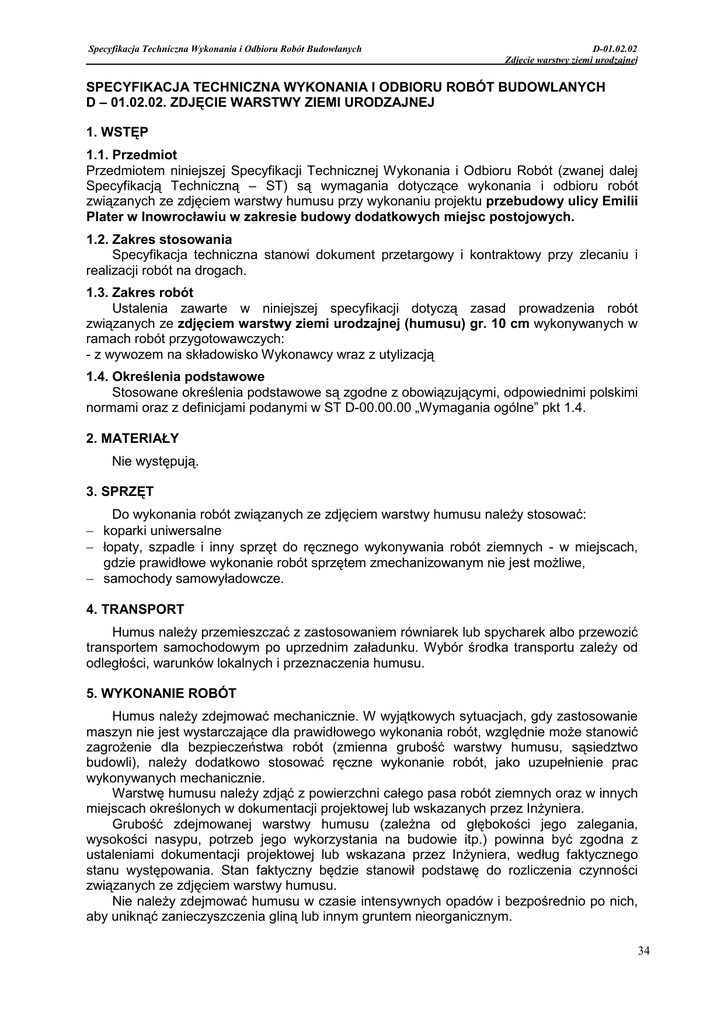 Specyfikacja Techniczna Wykonania i Odbioru Robót Budowlanych D-01.02.02 Zdjęcie warstwy ziemi urodzajnej SPECYFIKACJA TECHNICZNA WYKONANIA I ODBIORU ROBÓT BUDOWLANYCH D – 01.02.02. ZDJĘCIE WARSTWY ZIEMI URODZAJNEJ 1. WSTĘP 1.1. Przedmiot Przedmiotem niniejszej Specyfikacji Technicznej Wykonania i Odbioru Robót (zwanej dalej Specyfikacją Techniczną – ST) są wymagania dotyczące wykonania i odbioru robót związanych ze zdjęciem warstwy humusu przy wykonaniu projektu przebudowy ulicy Emilii Plater w Inowrocławiu w zakresie budowy dodatkowych miejsc postojowych. 1.2. Zakres stosowania Specyfikacja techniczna stanowi dokument przetargowy i kontraktowy przy zlecaniu i realizacji robót na drogach. 1.3. Zakres robót Ustalenia zawarte w niniejszej specyfikacji dotyczą zasad prowadzenia robót związanych ze zdjęciem warstwy ziemi urodzajnej (humusu) gr. 10 cm wykonywanych w ramach robót przygotowawczych: - z wywozem na składowisko Wykonawcy wraz z utylizacją 1.4. Określenia podstawowe Stosowane określenia podstawowe są zgodne z obowiązującymi, odpowiednimi polskimi normami oraz z definicjami podanymi w ST D-00.00.00 „Wymagania ogólne” pkt 1.4. 2. MATERIAŁY Nie występują. 3. SPRZĘT Do wykonania robót związanych ze zdjęciem warstwy humusu naleŜy stosować: − koparki uniwersalne − łopaty, szpadle i inny sprzęt do ręcznego wykonywania robót ziemnych - w miejscach, gdzie prawidłowe wykonanie robót sprzętem zmechanizowanym nie jest moŜliwe, − samochody samowyładowcze. 4. TRANSPORT Humus naleŜy przemieszczać z zastosowaniem równiarek lub spycharek albo przewozić transportem samochodowym po uprzednim załadunku. Wybór środka transportu zaleŜy od odległości, warunków lokalnych i przeznaczenia humusu. 5. WYKONANIE ROBÓT Humus naleŜy zdejmować mechanicznie. W wyjątkowych sytuacjach, gdy zastosowanie maszyn nie jest wystarczające dla prawidłowego wykonania robót, względnie moŜe stanowić zagroŜenie dla bezpieczeństwa robót (zmienna grubość warstwy humusu, sąsiedztwo budowli), naleŜy dodatkowo stosować ręczne wykonanie robót, jako uzupełnienie prac wykonywanych mechanicznie. Warstwę humusu naleŜy zdjąć z powierzchni całego pasa robót ziemnych oraz w innych miejscach określonych w dokumentacji projektowej lub wskazanych przez InŜyniera. Grubość zdejmowanej warstwy humusu (zaleŜna od głębokości jego zalegania, wysokości nasypu, potrzeb jego wykorzystania na budowie itp.) powinna być zgodna z ustaleniami dokumentacji projektowej lub wskazana przez InŜyniera, według faktycznego stanu występowania. Stan faktyczny będzie stanowił podstawę do rozliczenia czynności związanych ze zdjęciem warstwy humusu. Nie naleŜy zdejmować humusu w czasie intensywnych opadów i bezpośrednio po nich, aby uniknąć zanieczyszczenia gliną lub innym gruntem nieorganicznym. 34 Specyfikacja Techniczna Wykonania i Odbioru Robót Budowlanych D-01.02.02 Zdjęcie warstwy ziemi urodzajnej 6. KONTROLA JAKOŚCI ROBÓT Sprawdzenie jakości robót polega na wizualnej ocenie kompletności usunięcia humusu. 7. OBMIAR ROBÓT Jednostką obmiarową jest m2 (metr kwadratowy) zdjętego humusu. Obmiar naleŜy dokonać na budowie w obecności InŜyniera. 8. ODBIÓR ROBÓT 8.1. Przedmiot odbioru Odbiorowi podlega zdjęta warstwa humusu na zasadach odbioru robót ulegających zakryciu. Ogólne zasady odbioru robót podano w SST D-00.00.00 „Wymagania ogólne” pkt 8. 8.2. Postępowanie z wadliwie wykonanymi robotami. W przypadku stwierdzenia wad w wykonanych robotach InŜynier ustali zakres robót poprawkowych, które naleŜy wykonać bez hamowania postępu robot. Roboty te wykonawca wykona na własny koszt w terminie uzgodnionym z InŜynierem. 9. PODSTAWA PŁATNOŚCI − − − − − − Cena 1 m2 wykonania robót obejmuje: prace pomiarowe, roboty przygotowawcze, oznakowanie robót, zdjęcie humusu na pełną głębokość wraz z załadunkiem, wywozem i rozładunkiem, koszt utylizacji humusu, uporządkowanie miejsca robót. 10. PRZEPISY ZWIĄZANE PN-B-06050 Roboty ziemne. Wymagania ogólne. PN-S-02205:1998 Drogi samochodowe. Roboty ziemne. Wymagania i badania Ustawa z dnia 27.04.2001 r. o odpadach (tekst jednolity DZ.U.nr39 poz.251 z 2007 r.) 35