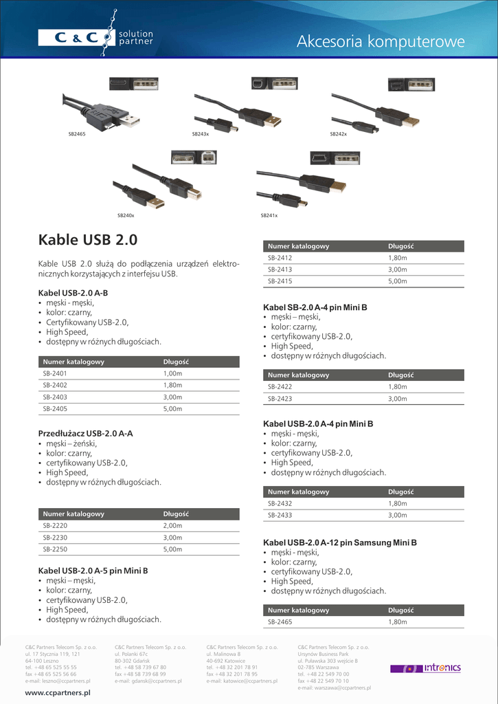 Akcesoria komputerowe SB2465 SB243x SB240x SB242x SB241x Kable USB 2.0 Kable USB 2.0 służą do podłączenia urządzeń elektronicznych korzystających z interfejsu USB. Kabel USB-2.0 A-B męski - męski, kolor: czarny, Certyfikowany USB-2.0, High Speed, dostępny w różnych długościach. Numer katalogowy Długość SB-2412 1,80m SB-2413 3,00m SB-2415 5,00m Kabel SB-2.0 A-4 pin Mini B męski – męski, kolor: czarny, certyfikowany USB-2.0, High Speed, dostępny w różnych długościach. Numer katalogowy Długość SB-2401 1,00m Numer katalogowy Długość SB-2402 1,80m SB-2422 1,80m SB-2403 3,00m SB-2423 3,00m SB-2405 5,00m Kabel USB-2.0 A-4 pin Mini B męski - męski, kolor: czarny, certyfikowany USB-2.0, High Speed, dostępny w różnych długościach. Przedłużacz USB-2.0 A-A męski – żeński, kolor: czarny, certyfikowany USB-2.0, High Speed, dostępny w różnych długościach. Numer katalogowy Długość SB-2220 2,00m SB-2230 3,00m SB-2250 5,00m Kabel USB-2.0 A-5 pin Mini B męski – męski, kolor: czarny, certyfikowany USB-2.0, High Speed, dostępny w różnych długościach. C&C Partners Telecom Sp. z o.o. ul. 17 Stycznia 119, 121 64-100 Leszno tel. +48 65 525 55 55 fax +48 65 525 56 66 e-mail: [email protected] www.ccpartners.pl C&C Partners Telecom Sp. z o.o. ul. Polanki 67c 80-302 Gdańsk tel. +48 58 739 67 80 fax +48 58 739 68 99 e-mail: [email protected] Numer katalogowy Długość SB-2432 1,80m SB-2433 3,00m Kabel USB-2.0 A-12 pin Samsung Mini B męski - męski, kolor: czarny, certyfikowany USB-2.0, High Speed, dostępny w różnych długościach. Numer katalogowy Długość SB-2465 1,80m C&C Partners Telecom Sp. z o.o. ul. Malinowa 8 40-692 Katowice tel. +48 32 201 78 91 fax +48 32 201 78 95 e-mail: [email protected] C&C Partners Telecom Sp. z o.o. Ursynów Business Park ul. Puławska 303 wejście B 02-785 Warszawa tel. +48 22 549 70 00 fax +48 22 549 70 10 e-mail: [email protected]