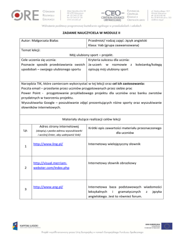 ZADANIE NAUCZYCIELA W MODULE II Autor: Małgorzata Białas Przedmiot/ rodzaj zajęć: Język angielski Klasa: Vab (grupa zaawansowana) Temat lekcji: Mój ulubiony sport – projekt. Cele uczenia się ucznia: Kryteria sukcesu dla ucznia: Poznacie sposób przedstawiania swoich Ja-uczeń: w rozmowie z koleżanką/kolegą upodobań – swojego ulubionego sportu opisuję mój ulubiony sport Narzędzia TIK, które zamierzam wykorzystać w tej lekcji oraz cel ich zastosowania: Poczta email – przesłanie przez uczniów przygotowanych przez siebie prac Power Point - przygotowanie przykładowego projektu dla uczniów oraz banku zwrotów przydatnych w tworzeniu projektu. Wyszukiwarka Google – poszukiwanie zdjęć prezentujących różne sporty oraz wyszukiwanie słowników internetowych. Materiały służące realizacji celów lekcji Adres strony internetowej Lp. 1 2 3 (skopiuj z paska adresu wyszukiwarki i wciśnij Enter, aby uaktywnić link) Krótki opis zawartości materiału przeznaczonego dla uczniów http://www.ling.pl/ Internetowy wielojęzyczny słownik http://visual.merriamwebster.com/index.php Internetowy słownik obrazkowy http://www.ang.pl/ Internetowa baza podstawowych wiadomości leksykalnych i gramatycznych z języka angielskiego. Jest to również forum.