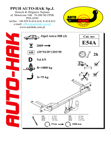 PPUH AUTO-HAK Sp.J. Henryk & Zbigniew Nejman ul. Słoneczna 16K 76-200 SŁUPSK POLAND tel/fax +48 059 8-414-414; 8-414-413 e-mail: [email protected] www.autohak.com.pl AUTO HAK ® Opel Astra HB (J) E54A 2009 e 20 e20*94/20*1204*00 D 9,6 kN kg 2h R=1800 kg S=75 kg M6 M10 M14 - 11 Nm 50 Nm 138 Nm 0 km M8 M12 M16 - 25 Nm 87 Nm 210 Nm 1000 km OD PRODUCENTA: PL Dziękujemy za wybór produkowanego przez naszą firmę zaczepu kulowego. Jego niezawodność została potwierdzona licznymi testami oraz opiniami zadowolonych klientów. Jednakże niezawodność zaczepów kulowych jest zależna również od prawidłowego montażu oraz prawidłowej eksploatacji. Z tego powodu prosimy Państwa o staranne przeczytanie niniejszej instrukcji montażu oraz przestrzeganie właściwych wskazówek. Zaczep należy zamontować w miejscach do tego celu przeznaczonych przez producenta samochodu. FROM MANUFACTURER: GB Thank you for buying our product. Their reliability has been confirmed in many tests. Reliability of towbar depends also on correct assembly and right operation. For this reasons we kindly ask to read carefully this instruction and apply to hints. The towbar should be install in points described by a car producer. VON DEM HERSTELLER: D F Die Zuverlässigkeit der Anhängekupplung ist jedoch auch von der ordnungsgemäßen Montage und der richtigen Nutzung abhängig. Daher werden Sie gebeten, sorgfältig die folgende Montageanleitung zu lesen und sich an die entsprechenden Anweisungen zu halten. Die Anhängekupplung muss an den vom Fahrzeughersteller vorgeschriebenen Befestigungsstellen montiert werden. DE LA PART DU FABRICANT: Merci d'avoir choisi le dispositif d'attelage aÌ boule produit par notre societ́e.́ Sa fiabilite´a et́e´confirmeé par de nombreux tests et a travers l'opinion des clients satisfaits. Toutefois, la fiabilite´des dispositifs d'attelage a`boule deṕend également d'une installation et d'une utilisation correcte. Pour cette raison, nous vous demandons de lire attentivement cette instruction de montage et d'en respecter les consignes. Le dispositif d'attelage a`boule doit et^re monte´dans des emplacements prev́us a cet effet par le fabricant de voiture. FRA PRODUCENTEN: DK Tak fordi De har valgt vores anhængertræk. Dets pålidelighed er blevet bekræftet i mange undersøgelser samt af tilfredse kunder. Vores anhængertræks pålidelighed er også afhængig af korrekt montering og korrekt betjening. Af denne grund beder vi Dem at læse denne instruktion grundigt og overholde de korrekte anvisninger. DE PRODUCTOR: E Gracias por la elección del enganche de bola producido por nuestra empresa. Su fiabilidad fue confirmada por numerosos testos y opiniones de los clientes quienes estuvieron contentos. Sin embargo la fiabilidad de enganche de bola depende también de un montaje adecuado y su explotación adecuada. Por esa causa por favor leer atentamente la instrucción del montaje y observar adecuadas indicadoras. VAN DE FABRIKANT: NL Bedankt voor de aanschaf van onze kogeltrekhaak. Hoe betrouwbaar die is blijkt wel uit vele tests en meningen van tevreden klanten. Toch is de betrouwbaarheid van een kogeltrekhaak er mede van afhankelijk dat deze correct gemonteerd is en op de juiste manier wordt gebruikt. Daarom wordt u verzocht deze montagehandleiding zorgvuldig te lezen en de aanwijzingen te volgen. FRA PRODUSENTEN: N Takk for at dere har valgt kulefestet produsert av vårt firma. Driftssikkerheten på kulefestet har blitt bekreftet av flere tester og tilbakemeldinger fra fornøyde kunder. Allikevel er driftssikkerheten også avhengig av en korrekt montering og riktig bruk. Derfor ber vi dere om å lese denne monteringsinstruksen nøye og anbefaler at dere følger veiledningen. ETT BUDSKAP FRÅN TILLVERKAREN: S Vi skulle vilja tacka er för ert val och inköp. Våra dragkrokars pålitlighet har bevisats av olika tester samt referenser från nöjda kunder. Man får inte glömma att dragkrokars pålitlighet beror också på rätt installation och rätt bruk. Därför skulle vi vilja be att ni läser noga denna installationsanvisning och följer alla regler och tips som den anger. Dragkroken ska installeras i ett ställe som blivit påpekade av biltillverkaren. DAL FABBRICANTE: IT -2- Vi ringraziamo per aver scelto il gancio di traino a sfera prodotto dalla nostra azienda. La sua affidabilità è stata confermata da numerosi test e dalle opinioni positive dei clienti. Tuttavia, il perfetto funzionamento dei ganci di traino a sfera dipende anche dalla correttezza del montaggio e dall'utilizzo appropriato. Per questo motivo, Vi preghiamo di leggere attentamente le presenti istruzioni di montaggio e di attenervi alle indicazioni in esse contenute. Il gancio di traino deve essere montato nei punti predisposti a tal fine dal fabbricante del veicolo. PL GB D F A-A DK E NL The clearance specified in appendix VII, diagram 25a/b of Regulation No. 55.01 UN EU must be guaranteed at laden weight of the vehicle. Der Freiraum nach Anhang VII, Abbildung 25a/b der Vorschriften 55.01 EG ist zu gewährleistenbei zulässigem Gesamtgewichtdes Fahrzeuges. L’espace libre doit etre garanti conformément a l’annexe VII, illustration 25a/b de la reglements 55.01 CE pour un poids total en charge autorisé du véhicule. I overensstemmelse med bilag VII, figur 25a/b til forordninger 55.01 EF for køretøjets tilladte totalvægt skal der garanteres en friplads. Hay que garantizar un espacio suelto según archivo adjunto VII, ilustración 25a/b regulaciones 55.01 UN EU de peso admisible y total del vehículo. De in bijlage VII afbeelding 25a/b vanreglement 55.01 UN EU gespecificeerde vrije ruimte moet bij een maximale gewichtsbelasting van het voertuig gegarandeerd zijn. N Det skal sørges for fritt rom ifølge vedlegget VII, illustrasjon 25a/b forskrifter 55.01 UN EU ved den tillatte totale vekten av fartøyet. S Man ska garantera ett fritt tillgängligt utrymme - se bilaga VII, diagram 25a/b enligt före